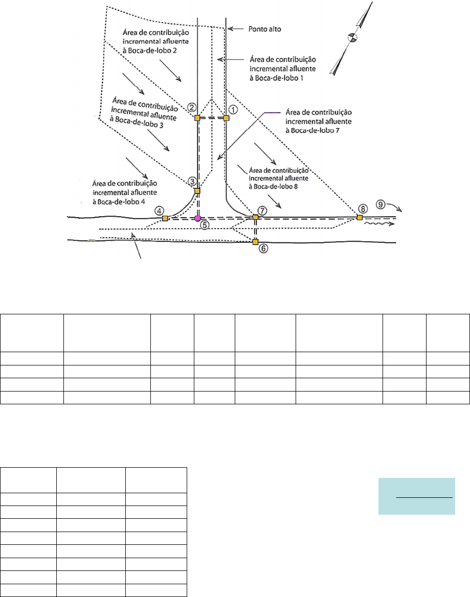 Exercício – Drenagem Pluvial Adaptado de Gribbin, J.E. Introdução à Hidráulica, Hidrologia e Gestão de Águas Pluviais. Cengage Learning. Tradução da 3ª. Edição norte-americana. Calcule a vazão de pico em cada trecho de tubulação do sistema de drenagem pluvial descrito na Figura 1 para um projeto com tempo de retorno de 25 anos. Suponha que o local do projeto seja Curitiba, com os parâmetros dados na Tabela 1. Determine os diâmetros para o sistema. Suponha que os tubos sejam de concreto reforçado com valores de n de Manning iguais a 0,015. Suponha também parâmetros do sistema dados na Tabela 2. Figura 1 - Áreas de drenagem delineadas, afluentes às bocas-de-lobo individuais Tabela 1 – Dados do local Boca-de- lobo Áreas de contribuição incremental (m²) tc (min) c Boca-de- lobo Áreas de contribuição incremental tc * (min) c** 1 283 6 0,95 5 - - - 2 1862 10 0,45 6 405 6 0,95 3 2104 10 0,48 7 607 6 0,95 4 2630 9 0,41 8 2833 14 0,38 tc *– Tempo de concentração para cada área de contribuição incremental c** - Coeficiente de escoamento composto para cada área de contribuição incremental Tabela 2 – Dados do sistema Trecho de tubulação Comprimento (cm) Declividade (%) Equação para Curitiba: (eng. Parigot de Souza) 31 anos (1921-1951) Para 5 ≤ t ≤ 120 min i é a intensidade da chuva em mm/h, Tr é o período de retorno em anos e t é a duração da chuva em minutos 1-2 914 2 2-3 6096 3,25 3-5 762 2,5 4-5 762 2 5-7 1524 0,5 6-7 914 2 7-8 6706 0,5 8-9 - 0,5 15,1 217,0 )26( .5950 + = t T i r