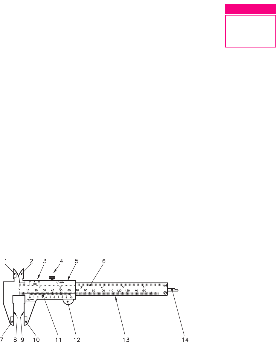 4 A U L A Como a empresa fabricou muitas peças fora das dimensões, o supervisor suspendeu o trabalho e analisou a causa do problema. Concluiu que a maioria dos profissionais tinha dificuldade em utilizar o paquímetro. Novamente o supervisor da empresa se viu em apuros, pois ninguém tinha conhecimentos suficientes sobre paquímetro. Diante da situação, o supervisor decidiu, com o grupo, contratar um especi- alista para uma explicação sobre paquímetro. Vamos acompanhar as explicações do especialista? Paquímetro O paquímetro é um instrumento usado para medir as dimensões lineares internas, externas e de profundidade de uma peça. Consiste em uma régua graduada, com encosto fixo, sobre a qual desliza um cursor. 1. orelha fixa 8. encosto fixo 2. orelha móvel 9. encosto móvel 3. nônio ou vernier (polegada) 10. bico móvel 4. parafuso de trava 11. nônio ou vernier (milímetro) 5. cursor 12. impulsor 6. escala fixa de polegadas 13. escala fixa de milímetros 7. bico fixo 14. haste de profundidade Paquímetro: tipos e usos Um problema 4 A U L A 4 A U L A O cursor ajusta-se à régua e permite sua livre movimentação, com um mínimo de folga. Ele é dotado de uma escala auxiliar, chamada nônio ou vernier. Essa escala permite a leitura de frações da menor divisão da escala fixa. O paquímetro é usado quando a quantidade de peças que se quer medir é pequena. Os instrumentos mais utilizados apresentam uma resolução de: 0,05 mm, 0,02 mm, 1 128 ″ ou .001" As superfícies do paquímetro são planas e polidas, e o instrumento geral- mente é feito de aço inoxidável. Suas graduações são calibradas a 20ºC. Tipos e usos Paquímetro universal É utilizado em medições internas, externas, de profundidade e de ressaltos. Trata-se do tipo mais usado. Paquímetro universal com relógio O relógio acoplado ao cursor facilita a leitura, agilizando a medição. interna externo de profundidadede ressalto 4 A U L APaquímetro com bico móvel (basculante) Empregado para medir peças cônicas ou peças com rebaixos de diâmetros diferentes. Paquímetro de profundidade Serve para medir a profundidade de furos não vazados, rasgos, rebaixos etc. Esse tipo de paquímetro pode apresentar haste simples ou haste com gancho. Veja a seguir duas situações de uso do paquímetro de profundidade. haste simples haste com gancho 4 A U L A Paquímetro duplo Serve para medir dentes de engrenagens. Paquímetro digital Utilizado para leitura rápida, livre de erro de paralaxe, e ideal para controle estatístico. Traçador de altura Esse instrumento baseia-se no mesmo princípio de funcionamento do paquímetro, apresentando a escala fixa com cursor na vertical. É empre- gado na traçagem de peças, para faci- litar o processo de fabricação e, com auxílio de acessórios, no controle dimensional. 4 A U L APrincípio do nônio A escala do cursor é chamada de nônio ou vernier, em homenagem ao português Pedro Nunes e ao francês Pierre Vernier, considerados seus inventores. O nônio possui uma divisão a mais que a unidade usada na escala fixa. No sistema métrico, existem paquímetros em que o nônio possui dez divisões equivalentes a nove milímetros (9 mm). Há, portanto, uma diferença de 0,1 mm entre o primeiro traço da escala fixa e o primeiro traço da escala móvel. 4 A U L A Essa diferença é de 0,2 mm entre o segundo traço de cada escala; de 0,3 mm entre o terceiros traços e assim por diante. Cálculo de resolução As diferenças entre a escala fixa e a escala móvel de um paquímetro podem ser calculadas pela sua resolução. A resolução é a menor medida que o instrumento oferece. Ela é calculada utilizando-se a seguinte fórmula: Resolução = UEF NDN UEF = unidade da escala fixa NDN = número de divisões do nônio Exemplo: · Nônio com 10 divisões Resolução = 1 10 0,1 mm divisoes mm~ = · Nônio com 20 divisões Resolução = 1 20 0,05 mm divisoes mm~ = · Nônio com 50 divisões Resolução = 1 50 0,02 mm divisoes mm~ = Teste sua aprendizagem, fazendo os exercícios a seguir. Confira suas respos- tas com as do gabarito. 4 A U L AMarque com um X a resposta correta. Exercício 1 Para medir dimensões lineares internas, externas, de profundidade e de ressaltos, usa-se o seguinte instrumento: a) ( ) graminho; b) ( ) régua graduada; c) ( ) compasso; d) ( ) paquímetro. Exercício 2 Quando é necessário grande número de medidas com rapidez, usa-se o paquímetro: a) ( ) universal, com relógio indicador; b) ( ) com bico móvel; c) ( ) de profundidade; d) ( ) duplo. Exercício 3 Para medir peças cônicas ou com rebaixos, que apresentam diâmetros diferentes, usa-se paquímetro: a) ( ) de profundidade; b) ( ) com bico móvel (basculante); c) ( ) com relógio indicador; d) ( ) universal com relógio. Exercício 4 Com o paquímetro duplo mede-se: a) ( ) passo de engrenagem; b) ( ) coroa de engrenagem; c) ( ) dentes de engrenagem; d) ( ) pinhão de engrenagem. Exercício 5 A escala do cursor do paquímetro chama-se: a) ( ) escala fixa; b) ( ) escala de milímetros; c) ( ) escala de polegadas; d) ( ) nônio ou vernier. Exercícios Paquímetro: tipos e usos Paquímetro Tipos e usos Paquímetro universal Paquímetro universal com relógio Paquímetro com bico móvel (basculante) Paquímetro de profundidade Paquímetro duplo Paquímetro digital Traçador de altura Princípio do nônio Cálculo de resolução ExercÌcios