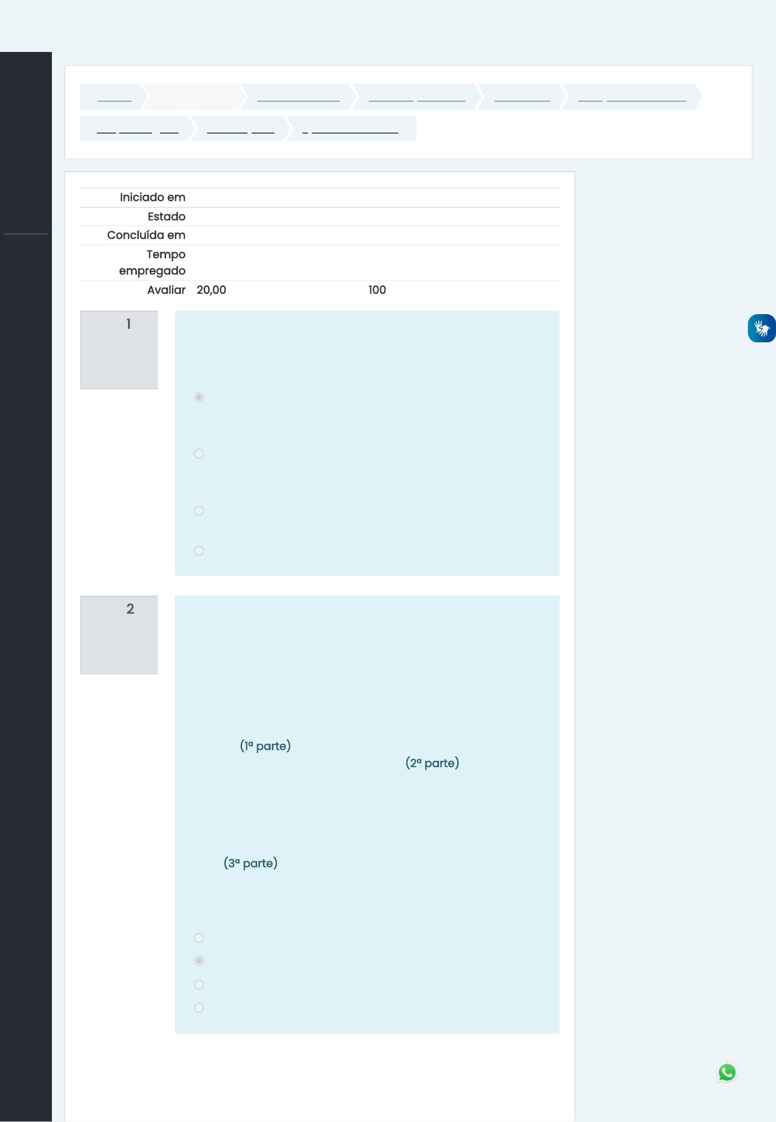 06/03/2023, 18:55 QUESTIONÁRIO 02 https://ava.funec.br/mod/quiz/review.php?attempt=403508&cmid=21525 1/5 Painel Meus cursos CURSOS FUNEC Graduação - EAD Aluno EAD JUNÇÕES DE TURMA Fitopatologia II AVALIAÇÕES QUESTIONÁRIO 02 Questão 1 Completo Atingiu 2,00 de 2,00 Questão 2 Completo Atingiu 2,00 de 2,00 Iniciado em Monday, 6 Mar 2023, 18:49 Estado Finalizada Concluída em Monday, 6 Mar 2023, 18:54 Tempo empregado 5 minutos 50 segundos Avaliar 20,00 de um máximo de 20,00(100%) Sobre o trânsito de vegetais com potencial disseminar pragas, pode-se afirmar que: Escolha uma opção: a. A PTV será fundamentada na certificação fitossanitária de origem (CFO) ou na certificação fitossanitária de origem consolidada (CFOC). b. A PTV só será requerida quando em caso de exportação/importação, sendo, portanto, dispensada para transito em território nacional. c. A PTV é um documento que independe de demais certificações para a sua emissão. d. Não há previsão para dispensa de PTV. Sobre o Certificado Fitossanitário de Origem – CFO e o Certificado Fitossanitário de Origem Consolidado – CFOC, analise a sentença abaixo: O CFO é o documento emitido na origem, unidade de produção, para atestar a condição fitossanitária da partida de plantas ou de produtos vegetais de acordo com as normas vigentes (1ª parte). Já o CFOC se diferencia do CFO, pois a origem é na unidade de consolidação (2ª parte). Ambos certificados fundamentam a emissão da Permissão de Trânsito de Vegetais para comprovar a origem da partida de plantas ou de produtos vegetais de Área Livre de Praga, de Local Livre de Praga, de Sistema de Mitigação de Riscos de Praga ou de Área de Baixa Prevalência de Praga, reconhecidos pelo MAPA (3ª parte). Quais partes estão corretas? Escolha uma opção: a. Apenas a 2ª e a 3ª partes. b. Todas as partes. c. Apenas a 1ª parte. d. Apenas a 3ª parte. https://ava.funec.br/my/ https://ava.funec.br/course/index.php?categoryid=10 https://ava.funec.br/course/index.php?categoryid=17 https://ava.funec.br/course/index.php?categoryid=19 https://ava.funec.br/course/index.php?categoryid=77 https://ava.funec.br/course/view.php?id=1636 https://ava.funec.br/course/view.php?id=1636#section-6 https://ava.funec.br/mod/quiz/view.php?id=21525 javascript:void(0); https://ava.funec.br/user/index.php?id=1636 https://ava.funec.br/badges/view.php?type=2&id=1636 https://ava.funec.br/admin/tool/lp/coursecompetencies.php?courseid=1636 https://ava.funec.br/grade/report/index.php?id=1636 https://ava.funec.br/my/ https://ava.funec.br/?redirect=0 https://ava.funec.br/calendar/view.php?view=month&course=1636 javascript:void(0); https://ava.funec.br/user/files.php https://ava.funec.br/course/view.php?id=870 https://ava.funec.br/course/view.php?id=757 https://ava.funec.br/course/view.php?id=322 https://ava.funec.br/course/view.php?id=865 https://ava.funec.br/course/view.php?id=1181 https://ava.funec.br/course/view.php?id=921 https://ava.funec.br/course/view.php?id=928 https://ava.funec.br/course/view.php?id=1636 https://ava.funec.br/course/view.php?id=1644 https://ava.funec.br/course/view.php?id=530 https://ava.funec.br/my/ 06/03/2023, 18:55 QUESTIONÁRIO 02 https://ava.funec.br/mod/quiz/review.php?attempt=403508&cmid=21525 2/5 Questão 3 Completo Atingiu 2,00 de 2,00 Questão 4 Completo Atingiu 2,00 de 2,00 Questão 5 Completo Atingiu 2,00 de 2,00 A umidade do ar é imprescindível a vida porém, quando ocorre um elevado teor de umidade no ar afeta o estado fitossanitário da cultura. Assinale a alternativa CORRETA que apresenta problemas fitossanitários a cultura causada pelo elevado teor de umidade no ar. Escolha uma opção: a. Ataque de fungos e manifestação de ácaros. b. Ataque de fungos e bactérias fitopatogênicos. c. Manifestação de ácaros e alguns insetos. d. Bactérias fitopatogênicos e alguns insetos. O Decreto nº 24.114, de 12 de abril de 1934, aprova o regulamento de defesa sanitária vegetal. Nesse Decreto, o Art. 1 afirma que são proibidos, em todo o território nacional, a importação, o comércio, o trânsito e a exportação: Escolha uma opção: a. de vegetais e partes de vegetais, como sejam: mudas, galhos, estacas, bacélos, frutos, sementes, raízes, tubérculos, bulbos, rizomas, folhas e flores, quando portadores de doenças ou pragas perigosas. b. de plantas exóticas. c. de caixas, sacos e outros artigos de acondicionamento, que tenham servido ao transporte de produtos de origem animal. d. de insetos vivos ou mortos, ácaros vivos ou mortos, nematoides e outros parasitos nocivos às plantas, vivos ou mortos. o As manchas foliares podem ser ocasionadas por fungos e bactérias. Os sintomas são bastante semelhantes. Porém, quanto a infecção, os mecanismos são diferenciados, haja vista a fisiologia dos dois agentes patogênicos. Sobre o processo de infecção de fungos e bactérias causadoras da mancha foliar, pode-se afirmar que: Escolha uma opção: a. A penetração bacteriana pode se dar a partir da ação do apressório que eles desenvolvem. b. Os talos bacterianos necessitam de ferimentos ou da abertura dos estômatos para se desenvolverem adentro do hospedeiro. c. As hifas fúngicas são incapazes de penetrar a partir da cutícula, necessitando, assim, das aberturas estomatais obrigatoriamente. d. A penetração de fungos só se dá a partir de ferimentos mecânicos. javascript:void(0); https://ava.funec.br/user/index.php?id=1636 https://ava.funec.br/badges/view.php?type=2&id=1636 https://ava.funec.br/admin/tool/lp/coursecompetencies.php?courseid=1636 https://ava.funec.br/grade/report/index.php?id=1636 https://ava.funec.br/my/ https://ava.funec.br/?redirect=0 https://ava.funec.br/calendar/view.php?view=month&course=1636 javascript:void(0); https://ava.funec.br/user/files.php https://ava.funec.br/course/view.php?id=870 https://ava.funec.br/course/view.php?id=757 https://ava.funec.br/course/view.php?id=322 https://ava.funec.br/course/view.