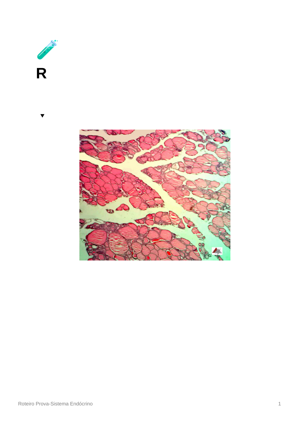 Roteiro Prova-Sistema Endócrino 1 🧪 Roteiro Prova-Sistema Endócrino Tireóide Roteiro Prova-Sistema Endócrino 2 Cápsula de tecido conjuntivo frouxo revestindo externamente, enviando septos para o parênquima da glândula e delimitando os folículos. Folículos revestidos por células foliculares: tecido epitelial cúbico, pavimentoso ou cilíndrico simples. Cavidade folicular preenchida por coloide composto por tireoglobulina Roteiro Prova-Sistema Endócrino 3 Seta - (Revestimento das Vesículas)- Tecido Epitelial de Revestimento Cúbico Simples Hipófise É formada por duas partes distintas; a neurohipófise (origem nervosa) e adenohipófise (origem ectodérmica). Cápsula fibrosa de tecido conjuntivo fibroso modelado: contem vasos e enviam trabéculas para o interior da glândula – sustentação. Roteiro Prova-Sistema Endócrino 4 Neurohipófise: Mais fibrilar (Formada por fibras)- Coloração mais clara Adenohipófise: Coloração mais forte, Constituídas por células cromófobas e cromófilas (acidófilas e basófilas). Possui duas partes separadas por escasso tecido conjuntivo: Pars intermédia e Pars distalis. Se a gente observar o corte histológico da hipófise, vindo da região mais externa para a região mais interna, a gente vai ver inicialmente um cápsula fibrosa de tecido conjuntivo denso fibroso. Essa cápsula pode emitir trabéculas para o interior para dar maior sustentação. As células cromófilas acidófilas são mais avermelhadas, as células cromófilas basófilas são mais roxas e as células cromófobas não se coram. Fissura de Rathke: resquício da bolsa de Rathke;Separa a pars intermédia e distalis da adenohipófise. Coloração diferenciada. Adrenal Roteiro Prova-Sistema Endócrino 5 Roteiro Prova-Sistema Endócrino 6 Roteiro Prova-Sistema Endócrino 7 São formadas por duas partes: Córtex e medula Cápsula de tecido conjuntivo denso fibroso rico em vasos sanguíneos e enviando septos para o interior da glândula Córtex dividido em 3 regiões -Zona Glomerulosa: Mais externa -Zona Fasciculada: Média -Z. Reticular: Interna Medula -Apresenta características degenerativas -Formada por células poliédricas -Repleta de Vasos sanguíneos