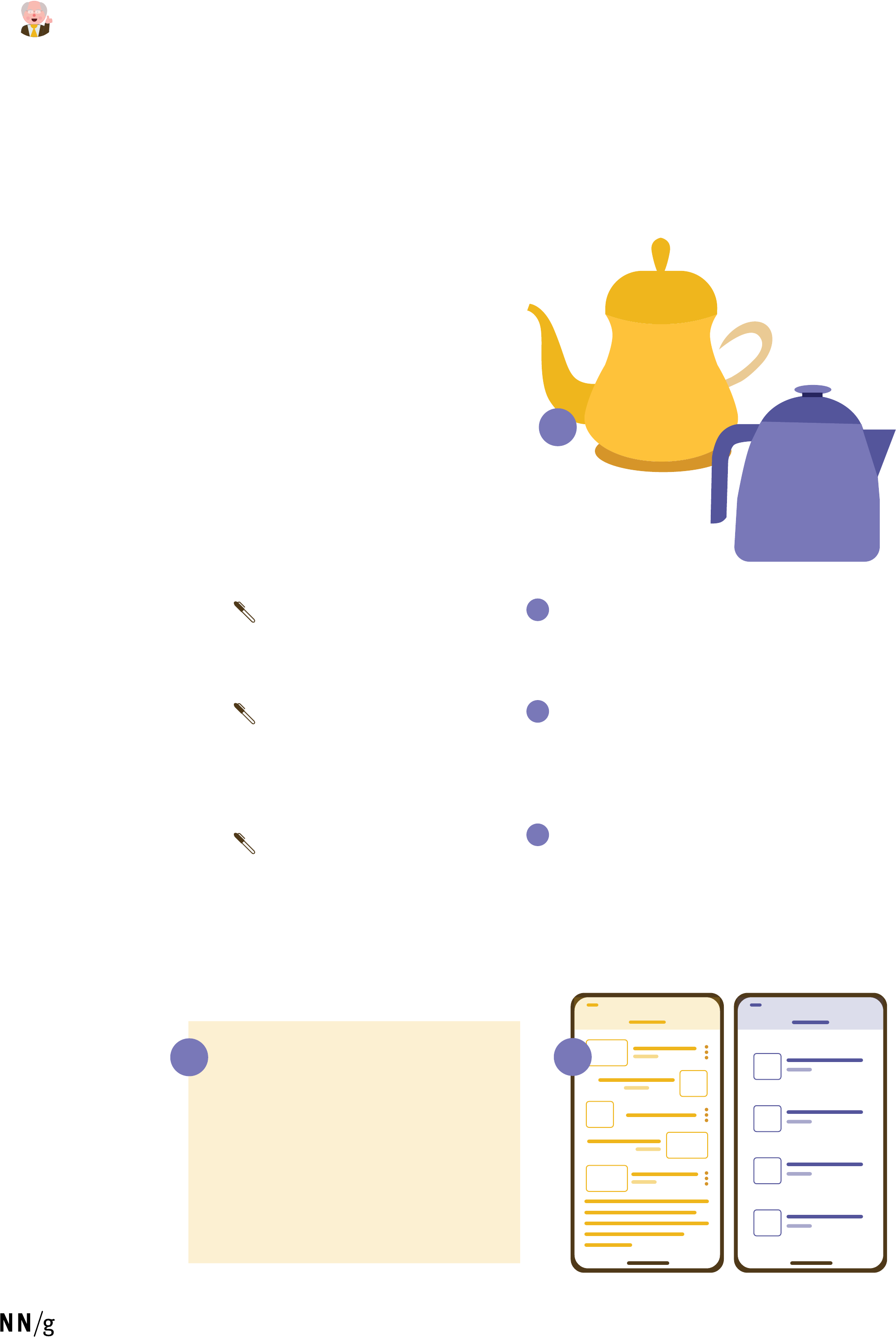 De�nition Interfaces should not contain information which is irrelevant or rarely needed. Every extra unit of information in an interface competes with the relevant units of information and diminishes their relative visibility. Aesthetic and Minimalist Design Jakob’s Heuristic Ornate vs. simple teapot Excessive decorative elements can interfere with usability. Communicate, don’t decorate Over-decoration can cause distraction and make it harder for people to get the core information they need. 8 This doesn't mean you have to use a flat design — it's about making sure you're keeping the content and visual design focused on the essentials. Ensure that the visual elements of the UI support the user's primary goals. ∙ Tip: Keep the content and visual design of UI focus on the essentials. ∙ Tip: Don't let unnecessary elements distract users from the information they really need. ∙ Tip: Prioritize the content and features to support primary goals. www.nngroup.com/articles/aesthetic-and-minimalist-design/ Messy vs organized UI Messy UI increases the interaction cost for users to �nd their desired content; Organized UI lowers the cost. DOn't decorate COMMUNICATE, 2 33 One of our favorite slogans 3 2 1 1