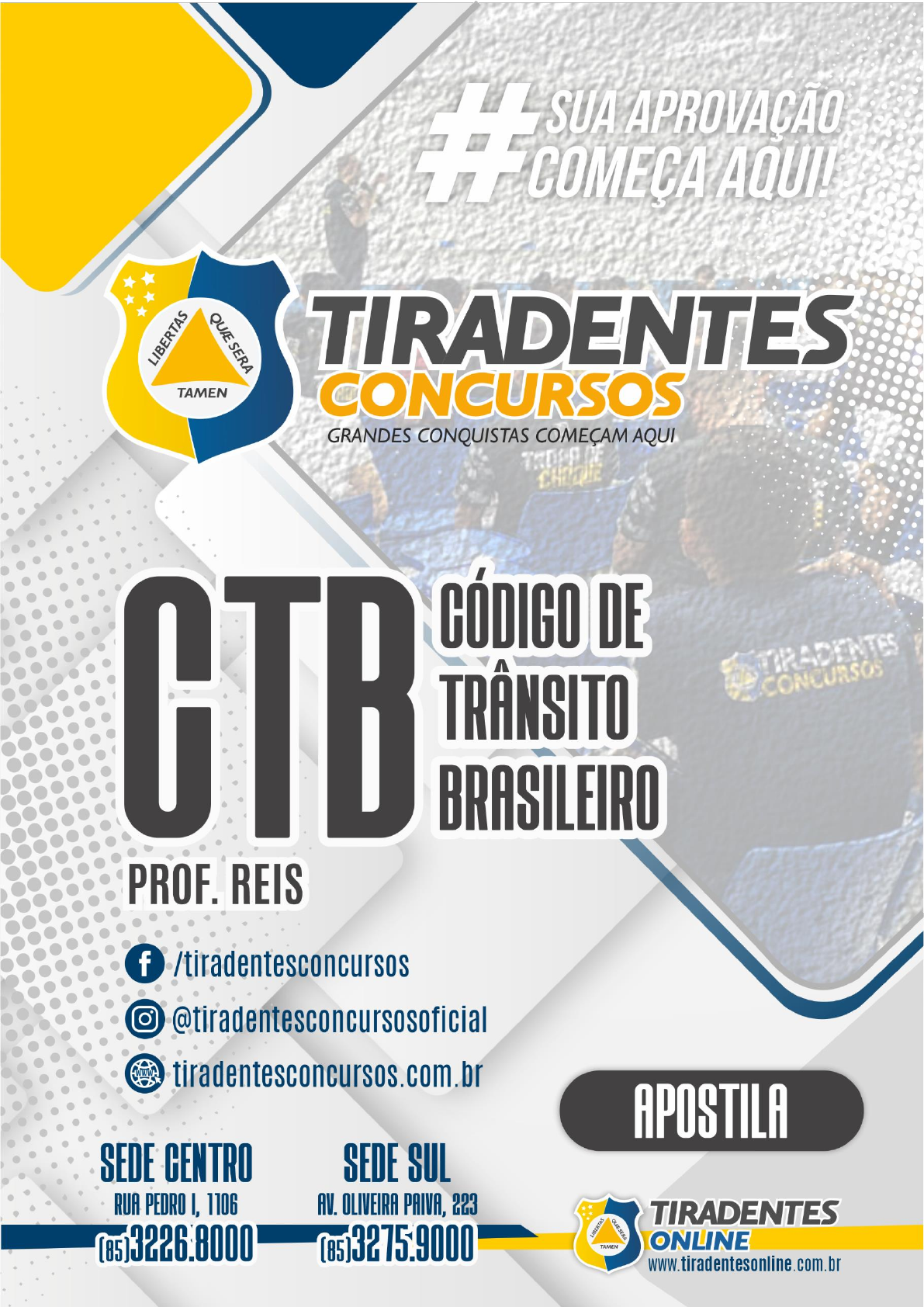 Esse material é de uso exclusivo do adiquerente. É expressamente proibida a reprodução e/ou distribuição desse material, no todo ou em parte, em qualquer meio mecânico, eletrônico, magnético, digital ou quaisquer outros meios que vieram a existir, com ou sem fins econômicos, sem a prévia e expressa autorização do detentor dos seus direitos, qual seja, a CONSETTRAN TREINAMENTOS, nos termos da Lei nº 9.610/1998, pelo que o infrator responderá civil e criminalmente. Solicitamos que nos seja informado sobre qualquer tipo de plágio ou reprodução, pelo que pretendemos tomar providências. Existe a possibilidade de gratificar aquele que auxiliar no sentido de identificar o plágio desde que nos sejam apresentandos a cópia do material e o recibo identificado. VALORIZE SEU INVESTIMENTO E TAMBÉM O NOSSO TRABALHO. Código de identificação do material N º103 – 2022.2 CLARO (85) 991.117.793 VIVO (85) 982.191.049 TIM (85) 999.278.615 (WhatsApp) E-mail: professorreistransito@gmail.com Site: www.consettran.com.br Twitter: @consettran Instagram: Professor_Reis Face: http://www.facebook.com/Consettran mailto:professorreistransito@gmail.com http://www.consettran.com.br/ http://www.facebook.com/Consettran Áreas de Atuação: • COACH INTEGRAL SISTÊMICO • Direito e Legislação de Trânsito; • Direção Defensiva; • Primeiros Socorros; • Mecânica Básica para concursos; • Preparação para avaliações práticas de direção veicular. • (Cursos extras de exercícios / Curso CTB em questões / Aulões / Revisões / Inscrições e Eventos / Formação de Agentes de Trânsito / Cursos de Aperfeiçoamento e Qualificação Profissional) PROF. RENATO REIS: • Bacharel em Direito (Estácio-FIC) com Especialização em “Gestão e Direito de Trânsito” (CEAT/INESP – São Paulo); • Coach Integral Sistêmico formado pela maior instituição de Coach do mundo (FEBRACIS) em parce- ria com a Florida Christian University (FCU); • Treinador oficial dos livros do Dr. Paulo Vieira: O PODER DA AÇÃO e O PODER DA AUTORRESPONSA- BILIDADE; • Diretor/Presidente da CONSETTRAN TREINAMENTOS; • Palestrante na área de trânsito para empresas e instituições; • Professor de cursos preparatórios para candidatos na área de Trânsito; • Responsável pela Coordenação de cursos e Formação de Agentes de Trânsito de vários municípios do Estado do Ceará; • Analista de Recursos Administrativos por Infrações de Trânsito; • Autor e Editor de Apostilas e materiais relativos à temática do Trânsito para Formação de Conduto- res, Agentes de trânsito, Concursos e Educação para o Trânsito; • Avaliador em processos seletivos (Prefeituras Municipais e Empresas Privadas); • Consultor de Empresas em levantamentos de ocorrências de Trânsito; • Consultor Técnico e Diretor Administrativo/Financeiro do IBRADEC (Instituto Brasileiro de Defesa da Cidadania); • Coordenador e Professor de cursos de capacitação e aperfeiçoamento profissional; • Educador e Instrutor de Trânsito Prático e Teórico; • Membro da ABPTRAN (Associação Brasileira de Profissionais de Trânsito); • Professor em Centros de Formação de Condutores da capital e do interior habilitado pelo DE- TRAN/CE; • Técnico em Gestão, Segurança e Direito de Trânsito. Venho atuando há mais de 23 anos na área de trânsito, certificado em mais de 90 cursos, totalizando cerca de duas mil horas em treinamentos, tendo alcançado mais de 900 mil pessoas entre primeira habilitação, concursos e empresas. Hoje também como Consultor, Palestrante e Coordenador de cursos de capacitação e aperfeiçoamento pro- fissional, cursos preparatórios para concursos e Coach nas áreas Life, Família e Carreira/Concursos. ANEXO I DOS CONCEITOS E DEFINIÇÕES Para efeito deste Código adotam-se as seguintes defini- ções: NOTA DO ORGANIZADOR: Observe algumas conexões entre os conceitos e definições através da numeração. Os números, ao final de cada descrição, significam que aque- les tópicos em que aparecem o mesmo numeral devem ser estudados conjuntamente, o que facilita principalmen- te a comparação entre os textos eliminando a possibili- dade de confusão entre eles. Ou seja, cada vez que o lei- tor encontrar um número, o leitor deve buscar as outras definições onde constam o mesmo número. ACOSTAMENTO - parte da via diferenciada da pista de rolamento destinada à parada ou estacionamento de veículos, em caso de emergência, e à circulação de pe- destres e bicicletas, quando não houver local apropriado para esse fim. (1) AGENTE DA AUTORIDADE DE TRÂNSITO - pessoa, civil ou policial militar, credenciada pela autoridade de trânsito para o exercício das atividades de fiscalização, operação, policiamento ostensivo de trânsito ou patrulhamento. (2) AGENTE DA AUTORIDADE DE TRÂNSITO - agente de trân- sito e policial rodoviário federal que atuam na fiscaliza- ção,nocontroleenaoperaçãodetrânsitoenopatrulhamento, competentesparaa lavratura do auto de infração e para os procedimentos dele decorrentes, incluídos o policial mili- tar ou os agentes referidos no art.25-A deste Código, quando designados pela autoridade de trânsito com cir- cunscrição sobre a via, mediante convênio, na forma pre- vista neste Código.(Alterado pela Lei Nº 14.229, de 21 de outubro de 2021)(2) AGENTE DE TRÂNSITO - servidor civil efetivo de carreira do órgão ou entidade executivos de trânsito ou rodoviário, com as atribuições de educação, operação e fiscalização de trânsito e de transporte no exercício regular do poder de polícia de trânsito para promover a segurança viária nos termos da Constituição Federal. (Incluído pela Lei Nº 14.229, de 21 de outubro de 2021) (2) AR ALVEOLAR - ar expirado pela boca de um indivíduo, originário dos alvéolos pulmonares.(Incluído pela Lei nº 12.760, de 2012) (3) ÁREA DE ESPERA - área delimitada por 2 (duas) linhas de retenção, desti