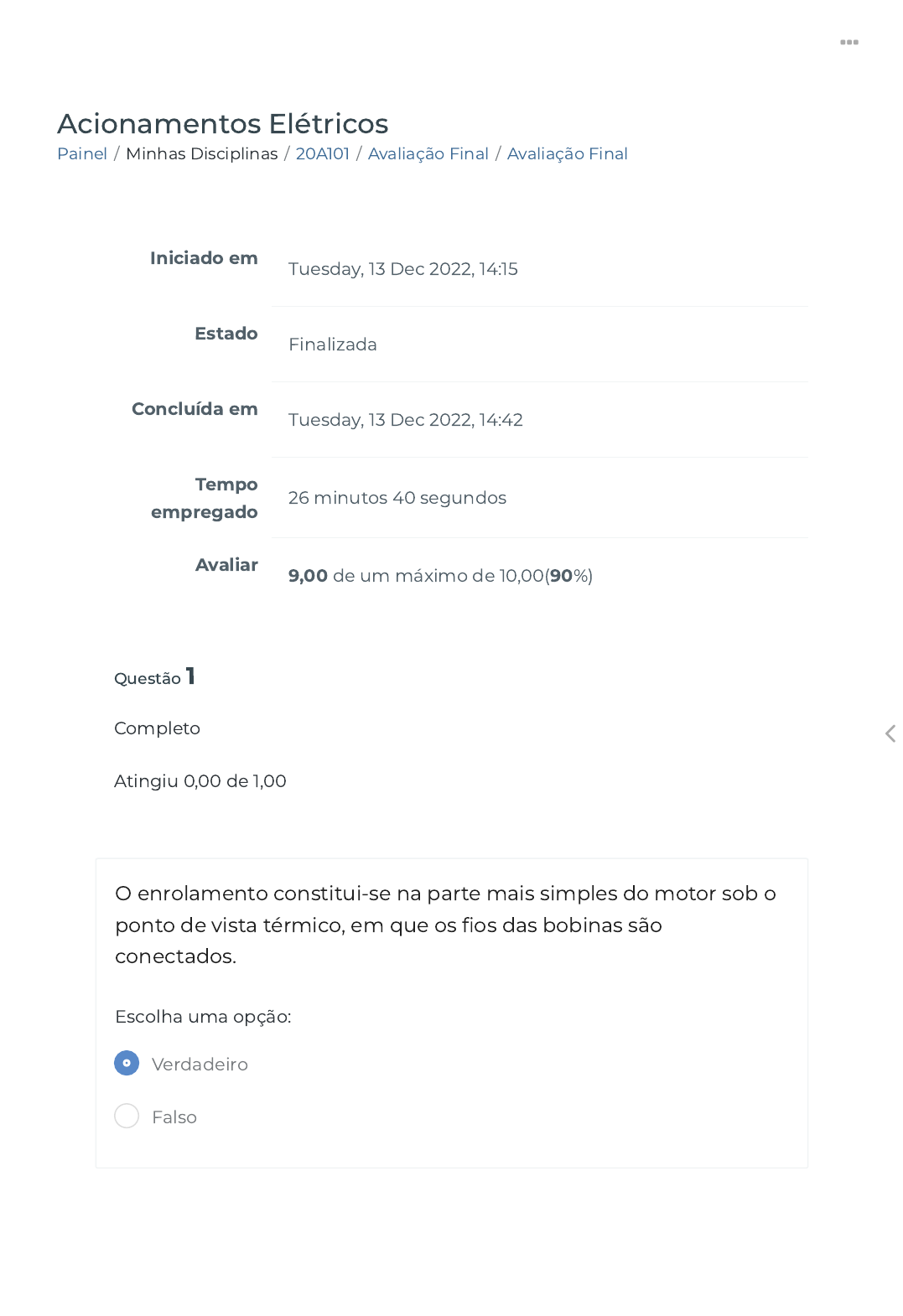 Painel / Minhas Disciplinas / 20A101 / Avaliação Final / Avaliação Final Acionamentos Elétricos Iniciado em Tuesday, 13 Dec 2022, 14:15 Estado Finalizada Concluída em Tuesday, 13 Dec 2022, 14:42 Tempo empregado 26 minutos 40 segundos Avaliar 9,00 de um máximo de 10,00(90%) Questão 1 Completo Atingiu 0,00 de 1,00 O enrolamento constitui-se na parte mais simples do motor sob o ponto de vista térmico, em que os �os das bobinas são conectados. Escolha uma opção: Verdadeiro Falso https://ava.politecnicabr.com.br/my/ https://ava.politecnicabr.com.br/course/view.php?id=935 https://ava.politecnicabr.com.br/course/view.php?id=935#section-9 https://ava.politecnicabr.com.br/mod/quiz/view.php?id=26393 https://ava.politecnicabr.com.br/ Questão 2 Completo Atingiu 1,00 de 1,00 Sua posição original é fechada, ou seja, permanece fechado até que seja aplicada uma força externa. Escolha uma opção: Questão 3 Completo Atingiu 1,00 de 1,00 O Motor trifásico com freio possui o seu freio ativado por um eletroímã̃, cuja bobina opera normalmente dentro de uma faixa de tensão de ±10%, cuja alimentação é fornecida por uma fonte de corrente contínua constituída por uma ponte reti�cadora, alimentada diretamente pela rede elétrica local. Escolha uma opção: a. Chave seletora b. Contato NF c. Chave com retenção d. Contato NA Verdadeiro Falso https://ava.politecnicabr.com.br/ Questão 4 Completo Atingiu 1,00 de 1,00 É o processo pelo qual é realizada a troca de calor entre o interior do motor e o meio externo. Escolha uma opção: Questão 5 Completo Atingiu 1,00 de 1,00 Relacione: Sobrecorrente imediata na saída: Subcorrente imediata: a. Centrifuga b. Ventilação c. Resfriamento d. Exaustão ajusta o máximo valor de corrente que a soft-star ajusta o mínimo valor de corrente que a soft-start ajusta o máximo valor de tensão que a soft-starte https://ava.politecnicabr.com.br/ Questão 6 Completo Atingiu 1,00 de 1,00 Potência reativa é a energia intermediária necessária para qualquer equipamento, como, por exemplo, motores, transformadores, reatores, capacitores, entre outros. E é trocada entre o gerador e a carga, sendo consumida efetivamente. Escolha uma opção: Questão 7 Completo Atingiu 1,00 de 1,00 Podemos a�rmar que os parâmetros de leitura são variáveis que podem ser visualizadas no display, e podem ser alteradas pelo usuário, como, por exemplo, tensão %, corrente %, potência ativa etc. Escolha uma opção: Verdadeiro Falso Verdadeiro Falso https://ava.politecnicabr.com.br/ Questão 8 Completo Atingiu 1,00 de 1,00 Fazem parte do das vantagens dos motores síncronos em relação aos motores de indução exceto em: Escolha uma opção: a. Os rotores dos motores síncronos permitem o uso de entreferros maiores, possibilitando menores tolerâncias. b. Possuem menores torques que auxiliam na indução equivalente, quando trabalham com fator de potencia unitário. c. Possuem rendimentos maiores do que os motores de indução equivalentes, quando trabalham com o fator de potência unitário. d. Os motores síncronos, além de serem utilizados para fornecer força mecânica, têm a característica de corrigir o fator de potência. https://ava.politecnicabr.com.br/ Questão 9 Completo Atingiu 1,00 de 1,00 Podemos a�rmar que os parâmetros de con�guração não de�nem as características da soft-starter e as funções a serem executadas, bem como as entradas e saídas precisarão de parâmetros adicionais aos relés de saída e das entradas da soft-starter. Escolha uma opção: Questão 10 Completo Atingiu 1,00 de 1,00 A Chave seletora possui duas ou mais posições e permite selecionar uma entre várias posições em um determinado processo com (C) ponto de contato comum. Também pode ser chamada de chave comutadora, contato three-way ou contato paralelo. Escolha uma opção: Verdadeiro Falso Verdadeiro Falso https://ava.politecnicabr.com.br/ © 2022 - Escola Politécnica Brasileira Entre em Contato https://www.politecnicabr.com.br 0800 084 2627 0800 084 2627 Links Úteis Dicas da nossa Diretora Acadêmica Planner de Estudos Declaração de Matrícula Orientações do AVA Abertura de Ticket Fale com o Tutor Cronograma de Estudos Manual de Estágio Manual de Competência Siga-nos nas redes sociais https://ava.politecnicabr.com.br/mod/quiz/0 https://www.politecnicabr.com.br/ https://soundcloud.com/user-501638417/sets/escola-politecnica-brasileira https://storage.googleapis.com/sirius-pubstore/semestre_plannerdeestudo%20poli.pdf https://storage.googleapis.com/sirius-pubstore/declaracao_matricula.pdf https://storage.googleapis.com/sirius-pubstore/orientacoes_ava.pdf https://storage.googleapis.com/sirius-pubstore/abertura_ticket.pdf https://storage.googleapis.com/sirius-pubstore/fale_com_tutor.pdf https://storage.googleapis.com/sirius-pubstore/cronograma_estudos.pdf https://storage.googleapis.com/sirius-pubstore/manual_estagio.pdf https://storage.googleapis.com/sirius-pubstore/manual_competencia.pdf https://www.facebook.com/politecnicabr https://www.instagram.com/politecnicabr_oficial https://ava.politecnicabr.com.br/