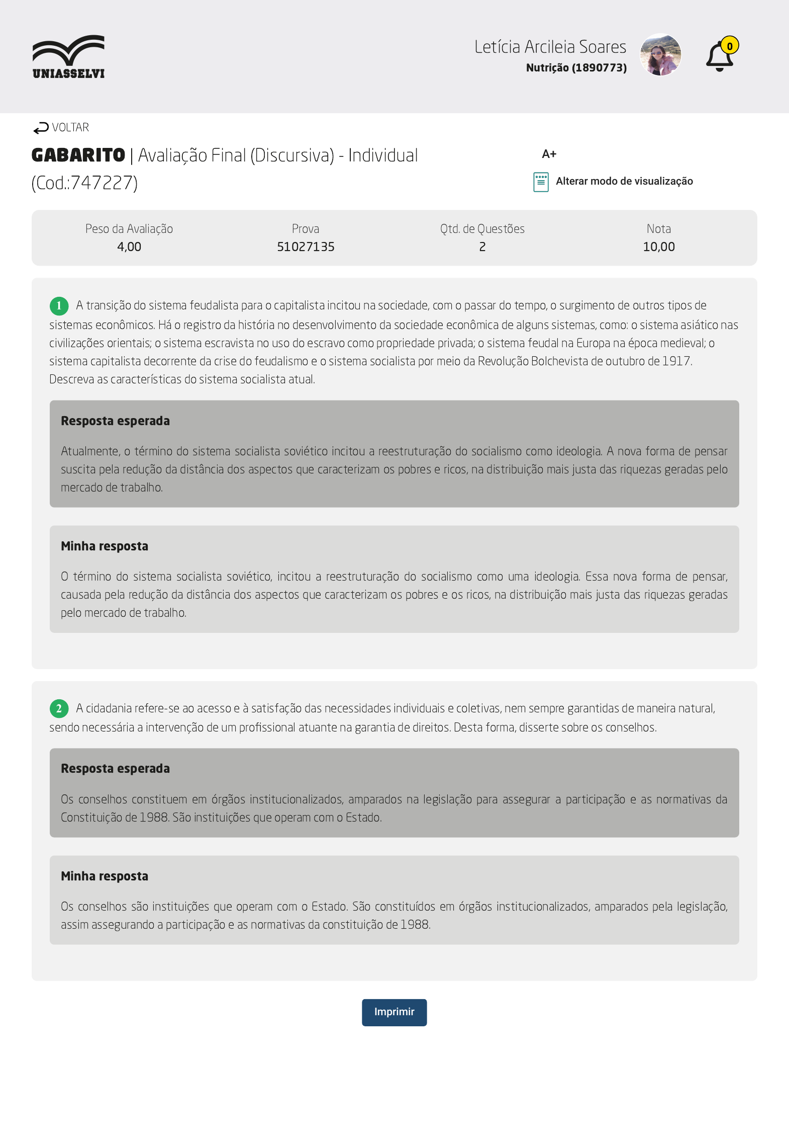 25/04/2023, 12:26 AVA https://ava2.uniasselvi.com.br/subject/grades-and-tests/answer-book/eyJ0ZXN0Ijp7InRlc3RDb2RlIjoiNzQ3MjI3IiwiZGVzY3JpcHRpb24iOiJBdmFsaWHDp8OjbyBGaW5hbCAoRGlzY3Vyc2l2YSkgLSBJbmRpdmlkdWF… 1/1 GABARITO | Avaliação Final (Discursiva) - Individual (Cod.:747227) Peso da Avaliação 4,00 Prova 51027135 Qtd. de Questões 2 Nota 10,00 A transição do sistema feudalista para o capitalista incitou na sociedade, com o passar do tempo, o surgimento de outros tipos de sistemas econômicos. Há o registro da história no desenvolvimento da sociedade econômica de alguns sistemas, como: o sistema asiático nas civilizações orientais; o sistema escravista no uso do escravo como propriedade privada; o sistema feudal na Europa na época medieval; o sistema capitalista decorrente da crise do feudalismo e o sistema socialista por meio da Revolução Bolchevista de outubro de 1917. Descreva as características do sistema socialista atual. Resposta esperada Atualmente, o término do sistema socialista soviético incitou a reestruturação do socialismo como ideologia. A nova forma de pensar suscita pela redução da distância dos aspectos que caracterizam os pobres e ricos, na distribuição mais justa das riquezas geradas pelo mercado de trabalho. Minha resposta O término do sistema socialista soviético, incitou a reestruturação do socialismo como uma ideologia. Essa nova forma de pensar, causada pela redução da distância dos aspectos que caracterizam os pobres e os ricos, na distribuição mais justa das riquezas geradas pelo mercado de trabalho. A cidadania refere-se ao acesso e à satisfação das necessidades individuais e coletivas, nem sempre garantidas de maneira natural, sendo necessária a intervenção de um profissional atuante na garantia de direitos. Desta forma, disserte sobre os conselhos. Resposta esperada Os conselhos constituem em órgãos institucionalizados, amparados na legislação para assegurar a participação e as normativas da Constituição de 1988. São instituições que operam com o Estado. Minha resposta Os conselhos são instituições que operam com o Estado. São constituídos em órgãos institucionalizados, amparados pela legislação, assim assegurando a participação e as normativas da constituição de 1988. VOLTAR A+ Alterar modo de visualização 1 2 Imprimir Letícia Arcileia Soares Nutrição (1890773) 0