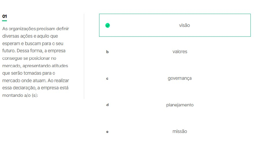 As organizações precisam definir diversas ações e aquilo que esperam e buscam para o seu futuro. Dessa forma, a empresa consegue se posicionar no mercado, apresentando atitudes que serão tomadas para o mercado onde atuam. Ao realizar essa declaração, a empresa está montando a/o (s): De acordo com Silva (2016), para que haja uma estruturação mais adequada da empresa é necessário o estudo da governança corporativa. Isso porque, como ferramenta, ela ajuda na definição de responsabilidades e autoridades. Assim, para o gerenciamento da empresa, suas funções devem ser bem executadas visando o sucesso. Considerando essas informações e os conteúdos estudados, analise as asserções a seguir e a relação proposta entre elas. I. O administrador deve praticar a busca de uma boa gestão organizacional, para que consiga figurar entre as melhores do mercado. Porque: II. Os administradores têm a capacidade de conseguir melhorar a marca e a imagem da organização no mercado. Leia o trecho a seguir: “Ganhar bastante dinheiro não pode ser o principal objetivo de uma empresa, segundo o publicitário e consultor americano Roy Spence: ‘É preciso haver um propósito que diga qual é a diferença que a sua empresa faz para o mundo’, diz ele.” MAXIMIANO, A. C. A. Fundamentos da Administração: Introdução à teoria geral e aos processos da administração. 3 ed. Rio de Janeiro: LTC, 2015. (Adaptado). A partir da leitura do fragmento e considerando os conteúdos estudados no livro da disciplina, o propósito ao qual Roy Spence se refere é a razão de ser de um negócio, e pode ser relacionado com o conceito de: Leia o trecho a seguir: “A governança corporativa converte suas boas práticas em recomendações para os gestores, em prol de uma boa gestão organizacional. A ideia principal é que por meio dela a empresa consiga otimizar seus recursos e melhorar a qualidade da gestão da organização.” INSTITUTO BRASILEIRO DE GOVERNANÇA CORPORATIVA – IBGC. O que é governança corporativa. [s.l.], [s.d.]. Disponível em: https://www.ibgc.org.br/conhecimento/governanca-corporativa. Acesso em: 07 abr. 2020. (Adaptado). A partir da leitura do fragmento e considerando os conteúdos estudados no livro da disciplina, analise as afirmativas a seguir sobre o alinhamento de interesses e benefícios da governança. A gestão organizacional é muito importante para que as empresas consigam um sucesso maior no mercado e uma consequente vantagem competitiva no mercado em que atuam. Para tanto, os administradores devem conseguir realizar bem suas funções. Assim, considerando essas informações e os conteúdos estudados acerca da direção, é função do administrador: Os gestores atuam dentro das organizações de modo a buscar o melhor gerenciamento e desempenho da empresa em questão. Para tanto, o primeiro passo consiste na montagem da tríade missão-visão-valores, que guia os funcionários e stakeholders a respeito da instituição. Assim, considerando as informações apresentadas e o conteúdo estudado, analise os conceitos disponíveis a seguir e associe-os com suas respectivas características. 1. Missão. 2. Visão. 3. Valor. ( ) Refere-se à razão de ser da empresa. ( ) Corresponde aos princípios que regem a organização. ( ) Indica um quadro futuro da organização. Agora, assinale a alternativa que apresenta a sequência correta:
