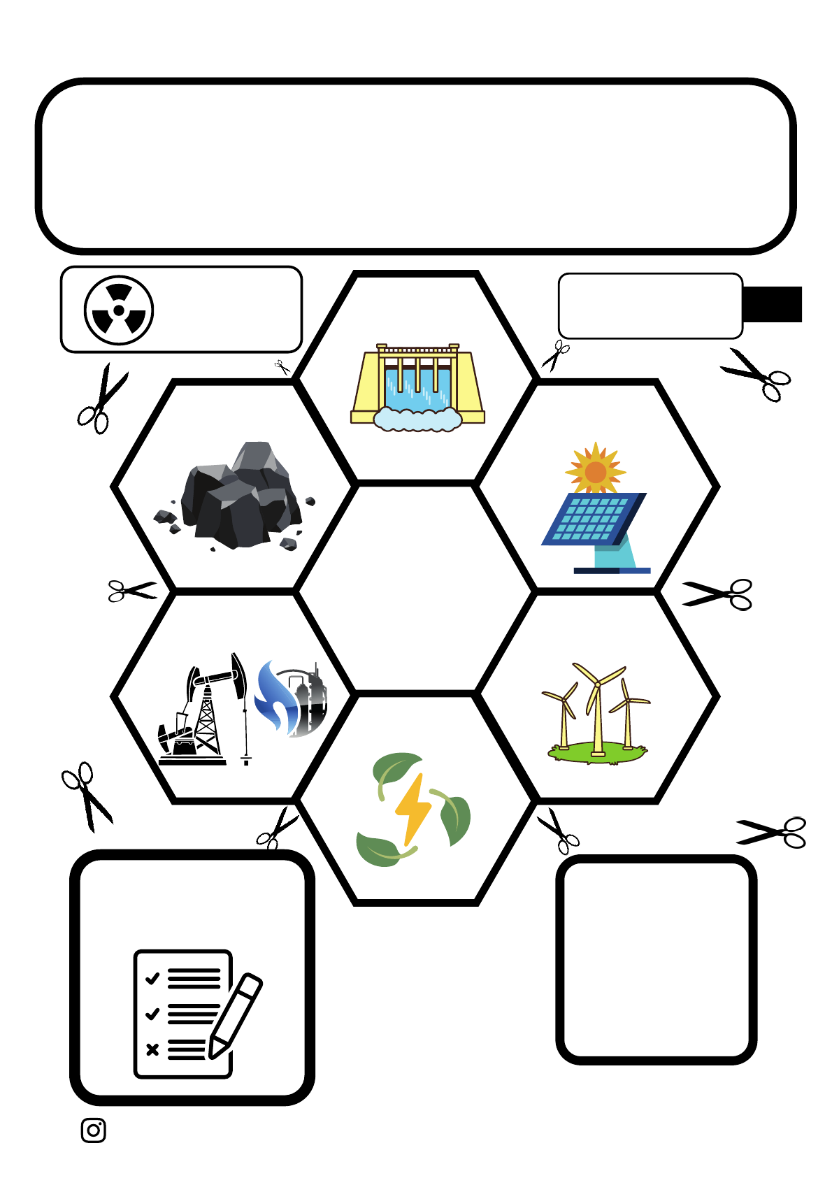 FONTES DE ENERGIA ENERGIA HIDRÁULICA ENERGIA SOLAR ENERGIA EÓLICA BIOMASSA E BIOCOMBUSTÍVEIS CARVÃO MINERAL PETRÓLEO E GÁS NATURAL As fontes de energia estão relacionadas a vários recursos e dependendo da sua origem, podem ser classificadas como fontes não renováveis ou fontes renováveis. RELATÓRIO DO ALUNO PU X E ENERGIA NUCLEAR PRODUZIDA POR MEIO DA FISSÃO DO ÁTOMO, ELEMENTO RADIOATIVO. EXISTEM DUAS USINAS NUCLEARES NO BRASIL: AS USINAS DE DE ANGRA I E ANGRA II. PUXE FONTES DE ENERGIA (ATIVIDADE INTERATIVA) Nesta atividade, os alunos montarão e estudarão as diferentes fontes de energia, organizadas em renováveis e não renovais. PROFª. Juniandra Klatter @junibraga SECUNDÁRIAS COLE A PRIMEIRA PARTE AQUI PRIMÁRIAS P U X E P U X E Energia obtida de recursos naturais. Exemplos: água de rios, petróleo, gás natural, madeira, etc. Energia obtida de transformações das fontes primárias. Exemplos: usinas hidrelétricas (a partir da queda d’água, essa energia é convertida em eletricidade) e usinas termelétricas (queima-se o carvão mineral e o petróleo para gerar energia). OUTRAS FONTES RENOVÁVEIS PUXE GEOTÉRMICA: GERADA A PARTIR DO CALOR INTERIOR DA TERRA. OCEANOS: GERADA A PARTIR DA AÇÃO DOS MARES. HIDROGÊNIO: GERADA A PARTIR DA REAÇÃO ENTRE HIDROGÊNIO E OXIGÊNIO. O que é? É um combustível fóssil que surgiu de um longo processo de decomposição, onde passaram milhões de anos encobertos e submetidas a uma crescente pressão. O que é? É gerada pela força da água, está relacionada às características naturais do ambiente (volume de água de um rio e aos desníveis do relevo). O Brasil possui um grande potencial. O que é? Proveniente do Sol é considerada uma fonte inesgotável, pode gerar eletricidade de maneira direta, por meio dos painéis fotovoltaicos. O que é? É obtida por meio do aproveitamento do vento. São usados aerogeradores, que se assemelham a um grande cata- vento. O que é? Matéria vegetal e orgânica, chamada de biomassa e pode ser aplicada na produção de energia. Exemplos: bagaço de cana-de- açúcar, girassol e restos de alimentos etc. O que é? São encontradas em bacias sedimentares. É, atualmente, a principal fonte primária de energia no Brasil e no mundo P U X E RELATÓRIO DO ALUNO SEQUÊNCIA DA MONTAGEM P U X E RECORTE ESSA BASE E COLE NO CENTRO DO CADERNO. RECORTE TODA EXTREMIDADE E DEPOIS FAÇA O PIQUE COM A TESOURA ATÉ O CENTRO (DEPOIS SOBREPONHA POR CIMA DA OUTRA) FAÇA O RECORTE DAS OUTRAS PARTES (AO USAR A COLA É NECESSÁRIO PASSAR BEM NA EXTREMIDADE INTERNA PARA NAO ATRAPALHAR O ENCAIXE). RESULTADO DA MONTAGEM @junibraga PROFª. Juniandra Klatter