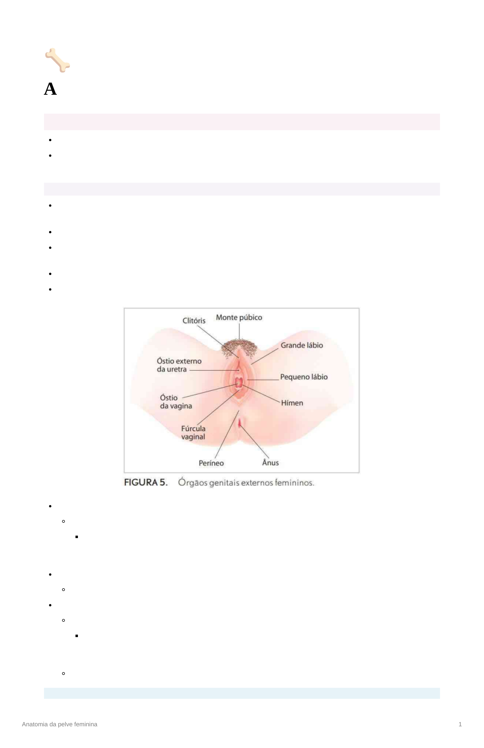 Anatomia da pelve feminina 1 🦴 Anatomia da pelve feminina Região Vulvoperineal Períneo: região losângica situada entre a sínfise púbica e o cóccix Constituída pelos órgãos genitais externos e pelo assoalho pélvico, além de se dividir em um trígono urogenital, anteriormente, e outro anal, posteriormente. Órgãos genitais externos O sexo genético é determ inado desde a fertilização, contudo, até a oitava sem ana de gestação, ambos os sexos se desenvolvem de modo semelhante (estágio indiferente) No embrião feminino, o crescimento do falo é inibido pela ausência de testosterona, formando-se, assim, o clitóris As pregas uretrais permanecem sem se fundir para formar internamente os pequenos lábios (ou ninfas), assim como as intum escências labioescrotais, que dão origem aos grandes lábios. Os genitais externos da mulher estão completamente formados na 12ª sem ana de gestação Esses órgãos incluem o monte púbico, os grandes e pequenos lábios, o vestíbulo da vagina, o clitóris e o hímen Vulva altamente vascularizada Sinal de Jacquemier-Kluge (mais evidente após 8° semana) Durante a gestação há aumento da vascularização, gerando alteração de coloração, a qual fica edemaciada e azulada (sinal de Jacquemier) e a mucosa vaginal também sofre alteração em sua coloração, tornando-se mais violácea (sinal de Kluge) Suprimento sanguíneo: artéria pudenda interna (ramo da a. ilíaca interna) e a. pudenda externa (ramo da a. femoral) Drenagem venosa por veias com nome e posição correspondente ao das artérias Inervação: Resposta morota: inervação simpática e parassimpática A estimulação parassimpática determina a dilatação das arteríolas do tecido erétil genital e a constrição do retorno venoso, enquanto o estímulo simpático causa redução do fluxo arterial para os tecidos eréteis, fazendo com que seus tamanhos diminuam até aqueles que tinham antes da estimulação parassimpática Sensibilidade: inervação somática Monte púbico Anatomia da pelve feminina 2 Elevação mediana anterior à sínfise púbica e constituída principalmente por tecido adiposo Após o amadurecimento puberal, ocorre o crescimento de pelos espessos com distribuição característica Grandes lábios São duas pregas cutâneas alongadas que delimitam entre si uma fenda (rima do pudendo/vulvar) Após a puberdade, apresenta pelos espessos, embora suas faces internas (glabras) sejam livres de pelos e sem rugosidades ou saliências Pequenos lábios Essas estruturas são duas pequenas pregas cutâneas localizadas medialm ente aos grandes lábios e revestidas por uma pele fina, lisa e úmida O espaço entre os pequenos lábios é denominado vestíbulo da vagina Vestíbulo da vagina O vestíbulo da vagina é uma fenda longitudinal delimitada pelos pequenos lábios Na parte superior: o óstio externo da uretra Na parte inferior: o óstio da vagina Lateralmente: os orifícios dos duetos das glândulas vestibulares (glândulas de Bartholin) Essas glândulas são responsáveis pela lubrificação vaginal durante a excitação sexual Para fins obstétricos, ou seja, para a ampliação do canal de parto, caso seja iminente a rotura perineal, faz-se uma incisão cirúrgica a partir do óstio da vagina até o períneo (perineotomia) ou mediolateralmente ao períneo (episiotom ia mediolateral) Clitóris O clitóris é um a pequena projeção arredondada na porção superior dos pequenos lábios Ele possui aproxim adamente 2 cm de comprimento e 0,5 cm de diâmetro, com uma porção exposta (glande) e uma porção não exposta (corpos cavernosos) corpo cavernoso se fixa posteriormente ao arco púbico (ramos do clitóris) Hímen O hímen é um a membrana de tecido conjuntivo que recobre parcialmente o óstio da vagina Tem forma e tamanho variáveis, sendo frequentemente anular, possui uma única abertura e ocasionalmente pode apresentar várias pequenas aberturas (cribriforme), ou, mais raramente, ser completamente fechado (hímen imperfurado) Após a ocorrência de relação sexual, apenas pequenos fragmentos passarão a ser visualizados (carúnculas himenais) Por se tratar de uma membrana de pequena espessura e vascularização reduzida, seu rompimento durante a cópula não é doloroso e não causa profusa hemorragia, como erroneamente é propagado 💡 O desconforto das mulheres às primeiras relações está mais relacionado à falta de relaxamento dos músculos e estruturas vizinhas do que à própria lesão himenal Anatomia da pelve feminina 3 Assoalho Pélvico Composição: diafragma pélvico, diafrgma urogenital, fáscia endopélvica Diafragma pélvico É localizado acima do diafragma urogenital e constituído pelos músculos levantador do ânus e isquiococcígeo, com suas respectivas fáscias O músculo levantador do ânus é uma lâmina muscular composta pelos: feixes puborretal pubococcígeo ileococcígeo O músculo isquiococcígeo tem forma de leque e auxilia o levantador do ânus em suas funções de sustentar as vísceras pélvicas e no ato de defecar O diafragma pélvico não fecha totalmente a pelve, pois em sua porção medial há um espaço ovalado denominado hiato urogenital, pelo qual passam a uretra, a vagina e o reto Diafragma urogenital Encontra-se abaixo do diafragma pélvico, mais precisamente inferior ao hiato urogenital É formado pelo: músculo transverso superficial do períneo, com suas fáscias superior e inferior músculo bulboesponjoso muscúlo isquiocavernoso esfíncter externo do ânus Anatomia da pelve feminina 4 Inervação É dada pelos: nervos pudendo e perineal nervos retais inferiores e ramos perineais do nervo femorocutâneo posterior Anatomia da pelve feminina 5 Pelve óssea relaxina: hormônio que fluidifica as articulações, facilitando o parto