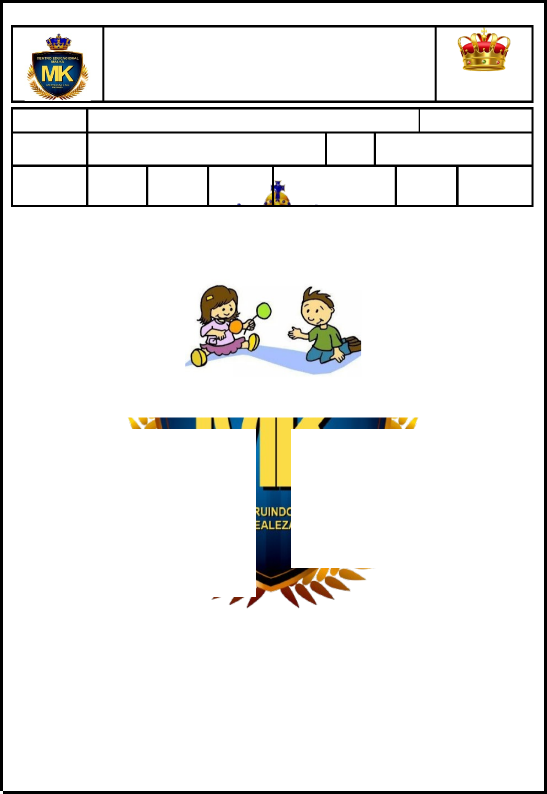 CENTRO EDUCACIONAL MALKA AVALIAÇÃO DIAGNOSTICA – BIMESTRAL – 1° ETAPA CONSTRUINDO A SUA REALEZA ALUNO 5° ANO DISCIPLINA Valores DATA _______/________/________ TOTAL DE ESC ESC OBTIDOS ENSINO FUNDAMENTAL NOTA MEU, SEU, NOSSO Dividir o mundo Repartir abraços Reforçar os laços Mergulhar no fundo Dessa brincadeira Partilhar à vida inteira Nessa festa Eu te empresto E você me empresta também Somos muitos, todos juntos Viajando no mesmo trem Já sei desde cedo Pois não é segredo Ser superbacana Dividir brinquedo Sem fazer esforço Eu digo e reforço Meu e seu, seu e meu Tudo pode ser nosso Mundo Bita 1. A música ensina: a) brincar. b) compartilhar. c) atrapalhar. d) ganhar. 2. Segundo a música, ajudar os outros é semelhante a uma: a) luta. b) música. c) brincadeira. d) adivinhação. 3. Dividir o mundo significa: a) separar os países. b) aproximar os continentes. c) realizar um grande campeonato. d) partilhar coisas boas aos outros. 4. Segundo a música, como estamos viajando no trem? ___________________________________________________________________________________ 5. Você gosta de compartilhar aquilo que possui com as pessoas que não têm? ___________________________________________________________________________________ 6. Partilhar é o mesmo que: a) receber. b) vencer. c) repartir. d) conseguir. 7. Qual desenho abaixo está relacionado ao ato de compartilhar? 8. Ser superbacana significa ser a) cordial. b) grosseiro. c) sério. d) áspero. 9. Observe a imagem e depois escreva uma frase sobre ela. _______________________________________________________________________________________________