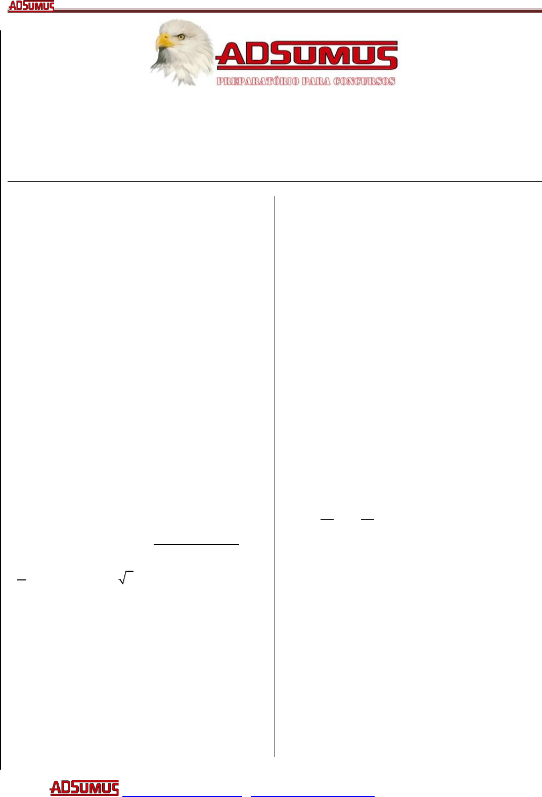 M E L H O R E Q U IP E E M A IO R Í N D IC E D E A P R O V A Ç Ã O – E S T A M O S J U N T O S N E S S A B A T A L H A E M B U S C A D A V IT Ó R IA T E L 3 8 8 5 0 3 9 0 7 8 5 3 0 8 6 5 - M E L H O R E Q U IP E E M A IO R Í N D IC E D E A P R O V A Ç Ã O – E S T A M O S J U N T O S N E S S A B A T A L H A E M B U S C A D A V IT Ó R IA T E L 3 8 8 5 0 3 9 0 7 8 5 3 0 8 6 5 E N S IN O S IS T E M A E D U C A N D U S D E E N S IN O SUA APROVAÇAO É NOSSA MISSÃO! Página 1 CURSO WWW.CURSOADSUMUS.COM – adsumus@cursoadsumus.com - ESTUDE COM QUEM APROVA! A D S U M U S P R E P A R A T Ó R IO P A R A C O N C U R S O S P Ú B L IC O S - A D S U M U S P R E P A R A T Ó R IO P A R A C O N C U R S O S P Ú B L IC O S - A D S U M U S P R E P A R A T Ó R IO P A R A C O N C U R S O S P Ú B L IC O S - A D S U M U S P R E P A R A T Ó R IO P A R A C O N C U R S O S P Ú B L IC O S - A D S U M U S P R E P A R A T Ó R IO P A R A C O N C U R S O S EXERCÍCIO N o 01 - MATEMÁTICA Prof.: Loyola Turma: MÁSTER Data: 07/03/15 Questões da Prova QOAM 2014 1) Sejam A e B conjuntos não vazios tais que n(A – B) = 3 e n(A) = k, logo o total de subconjuntos não vazios de A B é igual a: a) 32k b) 32 1k c) 12k d) 12 1k e) 2 1k 2) Sabendo-se que 8 8 8 8 3 5 4 7 1. . . . A A A A k B B B B B e 4 2 B A o valor de 4 k é: a) 1 b) 2 c) 3 d) 4 e) 5 3) Sejam " " e " "x números reais, tais que 2 2, , 2x é uma progressão aritmética nesta ordem e , ,9x é uma progressão geométrica nesta ordem. A soma dos possíveis valores de é igual a: a) 8 b) 6 c) 4 d) 2 e) 0 4) Analise as afirmativas abaixo. (I) cos215º cos225º (II) 5 5 12 12 tg sen (III) 172º 160ºsen sen Assinale a opção correta: a) Apenas a afirmativa I é verdadeira b) Apenas a afirmativa II é verdadeira c) Apenas a afirmativa III é verdadeira d) Apenas as afirmativas I e II são verdadeiras e) Apenas as afirmativas II e III são verdadeiras M E L H O R E Q U IP E E M A IO R Í N D IC E D E A P R O V A Ç Ã O – E S T A M O S J U N T O S N E S S A B A T A L H A E M B U S C A D A V IT Ó R IA T E L 3 8 8 5 0 3 9 0 7 8 5 3 0 8 6 5 - M E L H O R E Q U IP E E M A IO R Í N D IC E D E A P R O V A Ç Ã O – E S T A M O S J U N T O S N E S S A B A T A L H A E M B U S C A D A V IT Ó R IA T E L 3 8 8 5 0 3 9 0 7 8 5 3 0 8 6 5 E N S IN O S IS T E M A E D U C A N D U S D E E N S IN O SUA APROVAÇAO É NOSSA MISSÃO! Página 2 CURSO WWW.CURSOADSUMUS.COM – adsumus@cursoadsumus.com - ESTUDE COM QUEM APROVA! A D S U M U S P R E P A R A T Ó R IO P A R A C O N C U R S O S P Ú B L IC O S - A D S U M U S P R E P A R A T Ó R IO P A R A C O N C U R S O S P Ú B L IC O S - A D S U M U S P R E P A R A T Ó R IO P A R A C O N C U R S O S P Ú B L IC O S - A D S U M U S P R E P A R A T Ó R IO P A R A C O N C U R S O S P Ú B L IC O S - A D S U M U S P R E P A R A T Ó R IO P A R A C O N C U R S O S 5) As medidas dos arcos x, y e z, em graus, são tais que 13ºx y z , 2 9 x y z rad e 2 12 x y z rad . Sabendo-se que 2 5x z y , o valor de sen é: a) 1 2 b) 2 c) 3 d) 2 2 e) 3 2 6) A senha de um cadeado deve ser formada por uma sequência de 4 algarismos, escolhidos entre os elementos do conjunto 1,2,3,4,7,8,9 . Sabendo que o primeiro algarismo da esquerda é maior do que 4 e que o último algarismo da direita é ímpar, quantas sequências diferentes que podem ser formadas? a) 588 b) 441 c) 386 d) 324 e) 293 7) No plano cartesiano, o quadrado tem vértices nos pontos A(1, 2), B(1, 4), C(3, 4), D(3, 2), e centro no ponto P, enquanto o quadrado tem vértices nos pontos E(2, - 3), F(2, 1), G(6, 1), H(6, - 3), e centro no ponto K. Sendo assim, é correto afirmar que a distância entre os pontos P e K é igual a: a) 4 2 b) 2 5 c) 2 7 d) 4 5 e) 3 2 8) A distância entre os centros de duas faces adjacentes de um cubo é de 4 cm. Quanto é o volume desse cubo, em cm³? a) 8 2 b) 16 2 c) 32 2 d) 64 2 e) 128 2 M E L H O R E Q U IP E E M A IO R Í N D IC E D E A P R O V A Ç Ã O – E S T A M O S J U N T O S N E S S A B A T A L H A E M B U S C A D A V IT Ó R IA T E L 3 8 8 5 0 3 9 0 7 8 5 3 0 8 6 5 - M E L H O R E Q U IP E E M A IO R Í N D IC E D E A P R O V A Ç Ã O – E S T A M O S J U N T O S N E S S A B A T A L H A E M B U S C A D A V IT Ó R IA T E L 3 8 8 5 0 3 9 0 7 8 5 3 0 8 6 5 E N S IN O S IS T E M A E D U C A N D U S D E E N S IN O SUA APROVAÇAO É NOSSA MISSÃO! Página 3 CURSO WWW.CURSOADSUMUS.COM – adsumus@cursoadsumus.com - ESTUDE COM QUEM APROVA! A D S U M U S P R E P A R A T Ó R IO P A R A C O N C U R S O S P Ú B L IC O S - A D S U M U S P R E P A R A T Ó R IO P A R A C O N C U R S O S P Ú B L IC O S - A D S U M U S P R E P A R A T Ó R IO P A R A C O N C U R S O S P Ú B L IC O S - A D S U M U S P R E P A R A T Ó R IO P A R A C O N C U R S O S P Ú B L IC O S - A D S U M U S P R E P A R A T Ó R IO P A R A C O N C U R S O S EXERCÍCIO N o 01 - PORTUGUÊS Prof.: Rafael Dias Turma: MÁSTER Data: 07/03/15 1. Tarefa Morder o fruto amargo e não cuspir Mas avisar aos outros quanto é amargo Cumprir o trato injusto e não falhar Mas avisar aos outros quanto é injusto Sofrer o esquema falso e não ceder Mas avisar aos outros quanto é falso Dizer também que são coisas mutáveis... E quando em muitos a não pulsar – do amargo e injusto e falso por mudar – então confiar à gente exausta o plano de um mundo novo e muito mais humano. CAMPOS, G. Tarefa. Rio de Janeiro: Civilização Brasileira, 1981. Na organização do poema, os empregos da conjunção “mas” articulam, para além de sua função sintática, a) a ligação entre verbos semanticamente semelhantes. b) a oposição entre ações aparentemente inconciliáveis. c) a introdução do argumento mais forte de uma sequência. d) o reforço da causa apresentada no enunciado introdutório. e) a intensidade dos problemas sociais presentes no mundo. 2. (Curso ADSUMUS) Leia o texto a seguir para responder à questão. Há diversas maneiras de fazer uso das mídias em ambiente esco