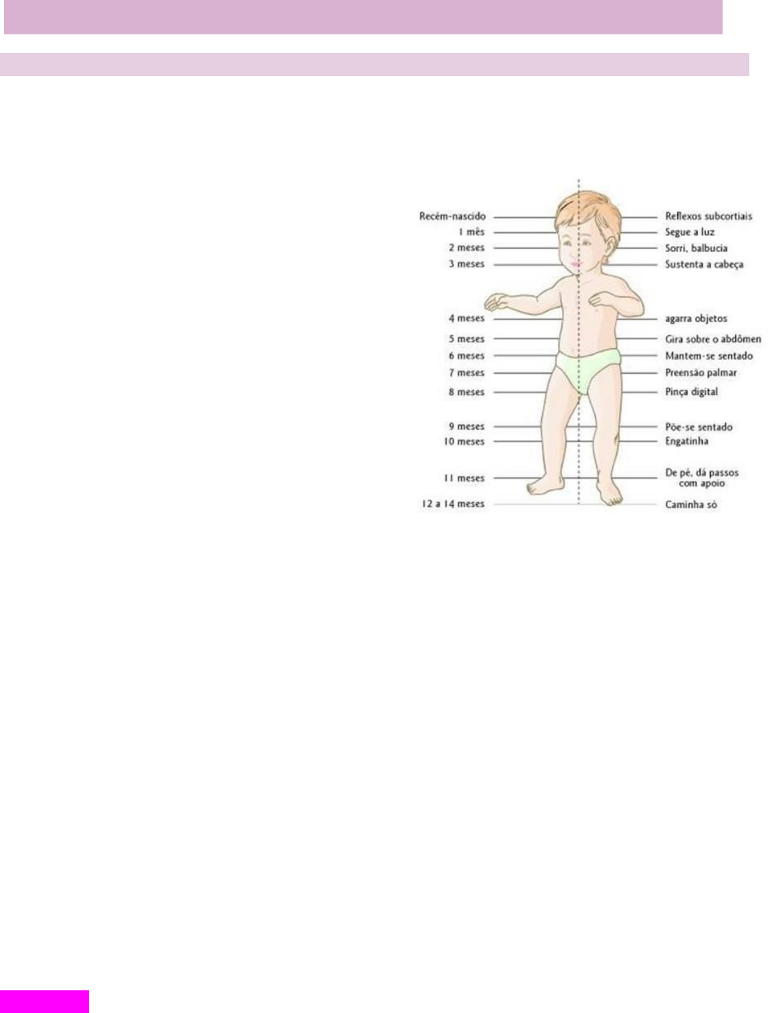 jENNIFER MOURA | 4 PERÍODO DESENVOLVIMENTO DA CRIANÇA 1 mês: sorriso social 1 mês e meio: ri respondendo a faces ou vozes 2 meses: consegue sustentar pescoço, fixa olhar 3 meses: mãos juntas na linha média 4 meses: postura dos braços, reflexo tônico cervical assimétrico desaparece, alcança objetos, reflexo palmar cessa (apertar as coisas com pés e mãos), fixa olhar nas próprias mãos 6 meses: sentando-se por ter controle do tronco, balbucia 7 meses: agarra dedo polegar, inibe com não, atende a ordens 7/8 meses: movimento de pinça 8 meses: descobre brinquedos escondidos 9 meses: engatinhar 10 meses: brinca simbolicamente 12 meses: andando sozinho e articulando 1 a 3 palavras 15 meses: 4 a 6 palavras 16 meses: corre 17 meses; estica para pegar algo, brinca com bonecos 18 meses: 10 a 15 palavras 2 anos: forma frases Reflexo das crianças vão até 4 meses Neonato (0-28 dias) lactente pré-escolar adolescente Neonato: · RN com menos de 2500g = baixo peso · RN com menos de 1500g = muito baixo peso · RN com menos de 1000g = extremo baixo peso · Se um RN nascer com menos de 500g, é considerado aborto · 0 – 28 dias de vida · Peso normal: acima de 2,5kg e menor que 4kg · Idade gestacional normal (a termo): 37 – 42 semanas incompletas · Quando bebe nasce antes das 37 semanas (pré-termo), percebemos um bebê com pele lisa, prematuro, difícil de palpar mamilo, orelha parece não ter cartilagem, muita elasticidade, bebe nasce com vernix que é uma massa branca gordurosa que protege a pele do bebe, já se ele nascer depois de 42 semanas o bebe é pós termo e tem a pele enrugada · Tem mãe como base · Peso relacionado a idade gestacional: · Peso adequado para a idade que a criança nasce · AIG (Peso adequado para idade gestacional) entre P 10-90, · PIG (peso abaixo de P10 – relacionado a mãe hipertensiva ou tabagismo. Criança considerada desnutrida). O sofrimento dentro do útero (não tem nutrição necessária), faz o bebê crescer com proteção pois já está se preparando desde a vida intrauterina criando resistência. Quando adulto, a criança PIG pode ter problemas como HAS, doença coronariana e DM · GIG (peso acima de P90 – relacionado a diabetes gestacional) Ser prematuro tem apenas a ver com a idade gestacional, nem sempre uma PIG é prematura, apenas não tem o peso adequado para aquela idade gestacional · Principal causa de atraso motor: baixo peso ao nascer, distúrbios cardiovasculares, respiratórios e neurológicos, prematuridade, infecção neonatal, baixas condições socioeconômicas, nível educacional precário dos pais que não estimulam a criança de maneira adequada, desnutrição etc. · Incompetência/insuficiência istmo cervical: patologia onde o colo do útero da gestante não suporta o peso do bebê provocando abortos ou partos no segundo trimestre de gestação · Audição desenvolvido pelo lado feminino por conta da mãe · Tem contato visual de 20-30cm por conta da proximidade da mãe, tem preferência por rostos · Reflexo de Moro: segurar a criança pela mão e soltá-la, a criança desce lentamente os braços, desencadeado por um susto, por exemplo. Incompleto antes dos 3 meses e não deve existir depois dos 6 meses. É semelhante ao movimento que nos adultos fazemos quando nos assustamos ou sentimos medo – nos inclinamos para frente – significa que o sistema nervoso do bebê está funcionando de maneira efetiva. · Reflexo cutâneo – plantar: estimulamos a porção lateral do bebê e ele estende o hálux. A partir do 13 mês de vida, o bebê consegue flexionar o hálux, após essa idade a extensão é patológica · Reflexo tônico cervical assimétrico: virar a cabeça do bebê e os membros do lado correto acompanharem · 6 estados comportamentais: · 1: sono profundo (bebê dorme e não acorda com facilidade) · 2: sono ativo (se incomoda caso mexa com ele, mas continua dormindo) · 3: sonolência (bebê acorda, mas sente que ainda está dormindo, inquietude ou choro) · 4: alerta tranquilo (bebê acorda bem e ativo, acompanha objetos ou rostos e se movimenta horizontalmente, não chora alto) · 5: despertar ativo (bebê acorda estressado, inquieto) · 6: choro intenso · Alguns estudos constam que quando a mãe dá banho no bebê, ele fica mais tranquilo do que quando recebe banho de algum enfermeiro, por exemplo · Criança de cesariana é mais ansiosa, tem reflexo de colocar dedo na boca com a a intenção de se auto apaziguar · Bebê precisa ser estimulado, é um dos papeis de o médico aconselhar os pais sobre a importância do estímulo e como fazer. Se o bebê não for estimulado de maneira efetiva pode ter atraso de memória, coordenação visuomotora e linguagem, por exemplo Lactente: · 29 dias – 2 anos incompletos · Bebê começa a usar mais os membros superiores, começa a pegar objetos, manipular. · Ritmo de sono, alimentação e excreção de acordo com a rotina estabelecida · Chamada de primeira infância · Tem sua família como base · Começa ter sua autopercepção · Bebê passa da horizontal para vertical conseguindo uma independência motora – habilidades cada vez mais complexas · 4 pilares: motor grosseiro (sustentar cabeça com 2 meses, perde reflexo tônico cervical, senta-se sem apoio aos 6 meses), motor fino (alcança objetos com 4 meses, reflexo palmar cessa aos 4 meses), comunicação e linguagem (ri respondendo faces ou vozes com 1,5m, balbucia com 6 meses, inibe com não com 7m, primeira palavra com 12m, atende a ordens com gestos com 7m) e cognitivo (atenção, percepção, memoria, raciocínio, juízo, imaginação etc, fixa olhar com 2 m, olhar para próprias mãos com 4m) Pré-escolar: · 2 – 6 anos incompletos · Dependente do estímulo/ambiente porque já tem contato com outras pessoas fora da família, com crianças na creche etc. · Tentativa de independência · Refrear impulsos, excessos de fúria, interação com muitas pessoas, curiosidade sobre genitais e ma