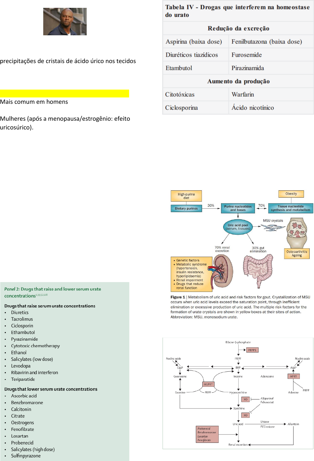 Gota • Conceito e epidemiologia ➢ Doença metabólica hereditária, caracterizada por precipitações de cristais de ácido úrico nos tecidos; ➢ Articulações, bainhas sinoviais, bursas, tecido subcutâneo e rins; ➢ 1,5% da população; ➢ Artrite inflamatória mais comum da população; ➢ Mais comum em homens (90%); ➢ 30 e 60 anos; ➢ Mulheres (após a menopausa/estrogênio: efeito uricosúrico). • Etiopatogenia e classificação ➢ Primária ➢ Secundária: outras condições ou enfermidades ✓ Doenças mieloproliferativas (leucemias, metaplasia mieloide, policitemia vera, linfomas). ✓ Hemoglobinopatias (anemias hemolíticas, drepanocitose). ✓ Obesidade, síndrome metabólica, hipertensão arterial, insuficiência renal, alcoolismo, psoríase, hiperparatireoidismo, cetose, sarcoidose, hipertrigliceridemia. ✓ Dietas ricas em purinas e drogas (salicilatos em baixas doses, pirazinamida, etambutol, L-dopa, diuréticos tiazídicos, quimioterápicos, ciclosporina). ➔Drogas que aumentam e drogas que diminuem a concentração de ácido úrico: ➔Drogas que interferem na homeostase do urato: • Etiopatogenia e classificação ➢ Cristais no interior das articulações → atração de células fagocitárias → fagocitose → liberação de mediadores inflamatórios → vasodilatação da membrana sinovial, edema e infiltrado de células linfomononucleares → artrite ➔Metabolismo do ácido úrico: ➔Metabolismo das purinas: • Quadro clínico ➢ Hiperuricemia assintomática. ➢ Hiperuricemia em 20% dos adultos; ➢ Acido úrico > 9 mg: fator de risco para gota, doença cardiovascular e nefropatia; ➢ Fator preditivo para hipertensão e doença coronariana; ➢ Hiperuricemia com antecedente de nefrolitíase e gota na família, pacientes com risco cardiovascular elevado: abordagem medicamentosa precoce? • Quadro clínico – gota aguda ➢ Atrite; ➢ Primeira metatarsofalangiana do hálux (podagra), tibiotársicas, joelhos, punhos, mãos e cotovelos; ➢ Início monoarticular, podendo tornar-se oligoarticular ou poliarticular (fase crônica); ➢ Dor intensa, edema, calor e hiperemia; ➢ Confunde-se com artrite séptica; ➢ Duração de horas ou alguns dias. Podagra. • Quadro clínico – período intercrítico ➢ Período assintomático variável (6 meses a 2 anos e, em alguns casos, pode não surgir uma segunda nova crise de artrite); ➢ Esse período diminui com a evolução para a fase de poliartrite crônica, onde surgem as lesões osteoarticulares mais graves; ➢ Período que se observa o maior número de abandonos de tratamento. • Quadro clínico – gota tofácea crônica ➢ Praticamente sem períodos intercríticos; ➢ Mono/oligoarticular para poliarticular; ➢ Deformidades e limitações funcionais articulares; ➢ Tofos → deposição de MUS – cristais de monourato de sódio – formando nódulos em diversos locais: superfície extensora dos antebraços, dorso das mãos, joelhos, tornozelos, pés, hélice das orelhas, tendões, bursas, havendo, até mesmo, relatos no miocárdio, na válvula cardíaca, nos olhos e na laringe. • Quadro clínico – tofo ➢ Consistência variável, moles quando recentes, duros quando antigos, pele pode tornar-se fina, hiperemiada e brilhante; ➢ Normalmente não são dolorosos; ➢ Eventualmente ulceram, dando saída a um material branco, pastoso, que lembra pasta de dente ou de giz; ➢ Tratamento adequado e precoce evita o seu aparecimento. • Quadro clínico – gota tofácea crônica ➢ Renal (10 a 30%); ➢ Deposição crônica de MUS no interstício renal “nefropatia por uratos” (lentamente progressiva e dificilmente evolui para hipertensão arterial ou pielonefrite). ➢ Deposição de MUS nos túbulos renais e nos ductos coletores: nefropatia aguda ou formação de litíase renal. ➢ Cálculos: ✓ Pacientes com história familiar de calculose renal, hiperuricemia e hiperexcreção de ácido úrico. • Evolução clínica • Manifestações extra articulares ➢ Tofos → compressão dos nervos ulnar, mediano e fibular. ➢ Gota faríngea: acessos agudos de tosse seca; irritação, rouquidão e disfagia pela presença de tofo na laringe. ➢ Tofos na esclera ou na córnea; ➢ Gota cerebral: cefaleia, afasia, hemiplegia. ➢ Gota cardíaca: válvulas mitral, aórtica e do miocárdio. • Fatores desencadeantes de crise ➢ Trauma ➢ Bebida alcoólica (principalmente cerveja) ➢ Cirurgia ➢ Anestesia ➢ Fatores emocionais ➢ Fatores climáticos ➢ Fatores alimentares ➢ Hemodiálise • Diagnóstico ➢ Laboratório ✓ Uricemia: homem até 7 mg/dl, mulher até 6mg/dl; ✓ Uricosúria de 24h: 350 a 750 mg; ✓ Sedimento urinário, função renal, glicemia, lipidograma, hemograma e provas inflamatórias de fase aguda; ✓ Pesquisa do cristal de MUS em microscopia de luz polarizada, no líquido sinovial ou nos tofos: birrefringência negativa forte, assemelhando-se a pequenas agulhas. • Diagnóstico ➢ Radiologia ✓ Fases iniciais da gota: alterações radiológicas discretas ou mesmo podem estar ausentes. ✓ Após alguns episódios de artrite: aumento de volume de partes moles, presença de osteoporose periarticular ou justa-articular, diminuição do espaço articular, lesões erosivas em “saca bocado”, subluxações e/ou luxações. • Novos critérios – ACR-EULAR 2015 ➢ Gout Classification Criteria. -Maximum score is 23. >8 gota. • Resumo • Calculadora para classificação diagnóstica http://goutclassificationcalculator.auckland.ac.nz ➔US – sinal do duplo contorno: ➔TC – dual energy: • Diagnóstico diferencial ➢ Forma monoarticular ✓ Artrite séptica ✓ Pseudogota ✓ Periartrite classificada por cristais de apatita em sua fase aguda ➢ Forma oligoarticular ✓ Síndrome de Reiter ✓ Enteroartropatias ✓ Artrite psoriásica ➢ Forma poliarticular ✓ Artrite reumatoide • Tratamento*** ➢ Objetivo ✓ Superar a fase intensa da dor