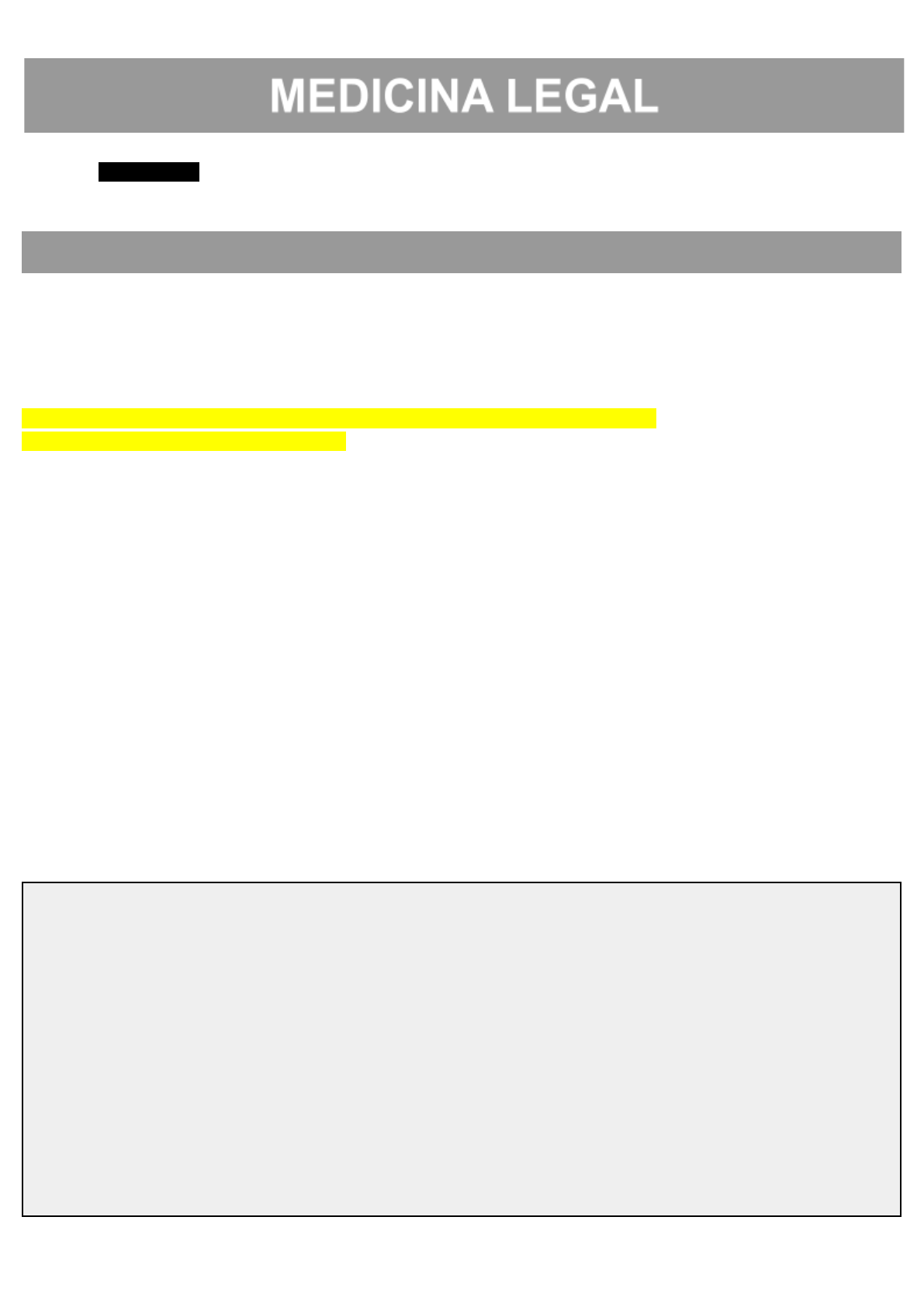 AULA 3 - MED LEGAL Traumatologia RESUMO AULA Finalidade: estuda as implicações jurídica dos traumatismos Trauma: atuação de energia externa sobre o corpo da pessoa, com intensidade capaz de provocar o desvio da normalidade Lesão: alteração estrutural proveniente de uma agressão ao organismo. Instrumento: alteração estrutural proveniente de uma agressão ao organismo. Agente: aquilo que causa alguma lesão. Traumatologia forense - INTERESSE PARA A JUSTIÇA: 1. Presença ou ausência de lesão 2. Tipo de lesão 3. Agente ou instrumento 4. Nexo causal 5. Gravidade da lesão 6. Vitalidade da lesão (vital x pós-mortal) Agentes vulnerantes - capazes de modificar o estado de repouso ou movimento do corpo - podem ter repercussões externas ou internas - ocorre de três maneiras: →meio ativo: objeto em movimento contra corpo parado →meio passivo: objeto parado e corpo em movimento ação mista: objeto e corpo em movimento. Discussão de cena real Pessoa morta em cima de um colchão em um quarto desorganizado, apresenta dois colchões no ambiente. Na janela tem uma grade. A sala pergunta se é um cativeiro, se é maus-tratos. A prof relata que a cena foi adulterada porque a imagem não está completa. A grande dúvida é um suicídio ou um homicídio.? Na camisa tem suspeita de sangue, está rasgada. Tem algum tipo de objeto? Sim, uma faca suja de sangue! O sangue é da pessoa? Pega-se o DNA para saber. Há respingos de sangue na parede, tem um padrão de gota de sangue, da esquerda para a direita. No peito do paciente tem 2 lesões, uma lesão pequena e uma maior. Ângulos agudos presentes na lesão. Lesão de hesitação**: pegou a faca e apoiou na região do tórax, primeiro ele apoiou a faca ali e depois ele deu o corte fatal. **São lesões localizadas em áreas que, normalmente, são utilizadas para suicídio. CLASSIFICAÇÃO DE LORENZO BORRI adotada por FLAMÍNIO FÁVERO: ENERGIAS DE ORDEM: mecânica, física, química, físico-química, bioquímica, biodinâmica, mista (bioquímica + biodinâmica) AQUI ABORDAREMOS AS DE ORDEM MECÂNICA - Paradigma médico legal: “Diga-me da lesão que eu digo-lhe do instrumento”. Portanto, é por meio da lesão que se classifica o instrumento e não o contrário. ENERGIAS DE ORDEM MECÂNICA- CLASSIFICAÇÃO DOS INSTRUMENTOS, LESÕES E AGENTES LESÃO INSTRUMENTO AGENTE Contusa Contudente Corpo (mãos, pés), martelo, marreta Punctória Perfurante Agulha, furador de gelo, prego Incisa Cortante Navalha, bisturi, vidro Pérfurocontusa Pérfurocontudente PAF, cabo de guarda-chuva, espeto Pérfuroincisa Perfurocortante Canivete, espada, punhal Cortocontusa Cortocontundente Dentes, machado, enxada - LESÕES SIMPLES - LESÕES COMPLEXAS Um mesmo agente é capaz de gerar diferentes lesões, como a arma de fogo. Arma de fogo → lesão: - pérfuro-contusa (projétil perfurou) - contusa (escoriação, “coronhada”) - queimadura LOGO: o agente não caracteriza a lesão, mas a lesão caracteriza o instrumento. ★ PERFURANTE - Instrumentos perfurantes: aspecto pontiagudo, alongado, fino e de diâmetro transverso reduzido, têm maiores repercussões na profundidade do corpo da vítima. Mecanismo: Percussão ou Pressão, afastando as fibras dos tecidos e raramente, seccionando-as. Agentes perfurantes: Agulha, prego, furador de gelo, alfinete. - Lesões punctórias ou punctiformes: → Característica da lesão: exterioriza-se por um ponto, abertura estreita, raro sangramento, maior gravidade na profundidade (dependendo do órgão afetado), com menor diâmetro que o instrumento causador. → Trajeto é representado por um túnel estreito (linha escura). → Ferimento de saída (quando ocorre) é irregular e de menor diâmetro que o de entrada. → Leis de Filhos (Edouard Filhos) e Langer (Karl Ritter von Langer) ilustradas a seguir. 2 Em casa de botão : instrumento perfurante de diâmetro maior, como furador de gelo. NÃO PRECISA SABER PARA A PROVA. ★ Cortante Instrumentos cortantes: apresentam um gume mais ou menos afiado. Mecanismo: pressão e deslizamento sobre os tecidos. Agentes: bisturi, navalha, lâmina de barbear. ★ CORTANTE Lesão incisa Formato linear, regularidade das bordas e fundo da lesão, hemorragia abundante, predomínio do comprimento à profundidade, cauda de escoriação voltada para o término da ação do instrumento, vertentes cortadas obliquamente e centro mais profundo que as extremidades. Lesão incisa de formato navicular. Cauda de escoriação: lado onde terminou a ação do instrumento, na pérfuroincisa também pode estar presente. 3 LESÕES INCISAS DE DEFESA LOCALIZADA EM MÃOS, BRAÇOS E PÉS. Lesões incisas de hesitação – única ou geralmente múltiplas, indivíduo ganha confiança para atingir plano com maior profundidade. Espostejamento – Redução do corpo a fragmentos diversos e irregulares (acidentes ferrovias, metrô e rodovias). Esquartejamento – Divisão do corpo em partes por amputação ou desarticulação. → Pode existir intuito de ocultação de cadáver ou ainda de dificultar a identificação. → se a pessoa estava viva durante o sofrimento, a pena aumenta. Degola – lesão incisa localizada na região cervical posterior com seção parcial dos tecidos. Decapitação – lesão incisa com secção completa dos tecidos. Haraquiri – lesão incisa localizada na região abdominal com evisceração. Esgorjamento - lesão incisa localizada na região cervical anterior. ★ Contundente Instrumento contundente: produzida por um corpo de superfície com lesões mais comuns em exame externo podendo ocorrer repercussões na profundidade. Mecanismo: pressão, percussão, explosão, flexão, distensão, deslizamento, compressão, descompressão, torção, sucção, contragolpe ou mista - socos, martelo, marreta. 4 Lesões contusas 1. Rubefação: mancha avermelhada, efêmera e fugaz. Ex: bofetadas em face e nádegas de criança; → tomar cuidado pois podem sumir. 2. Escoriação: arrancamento da