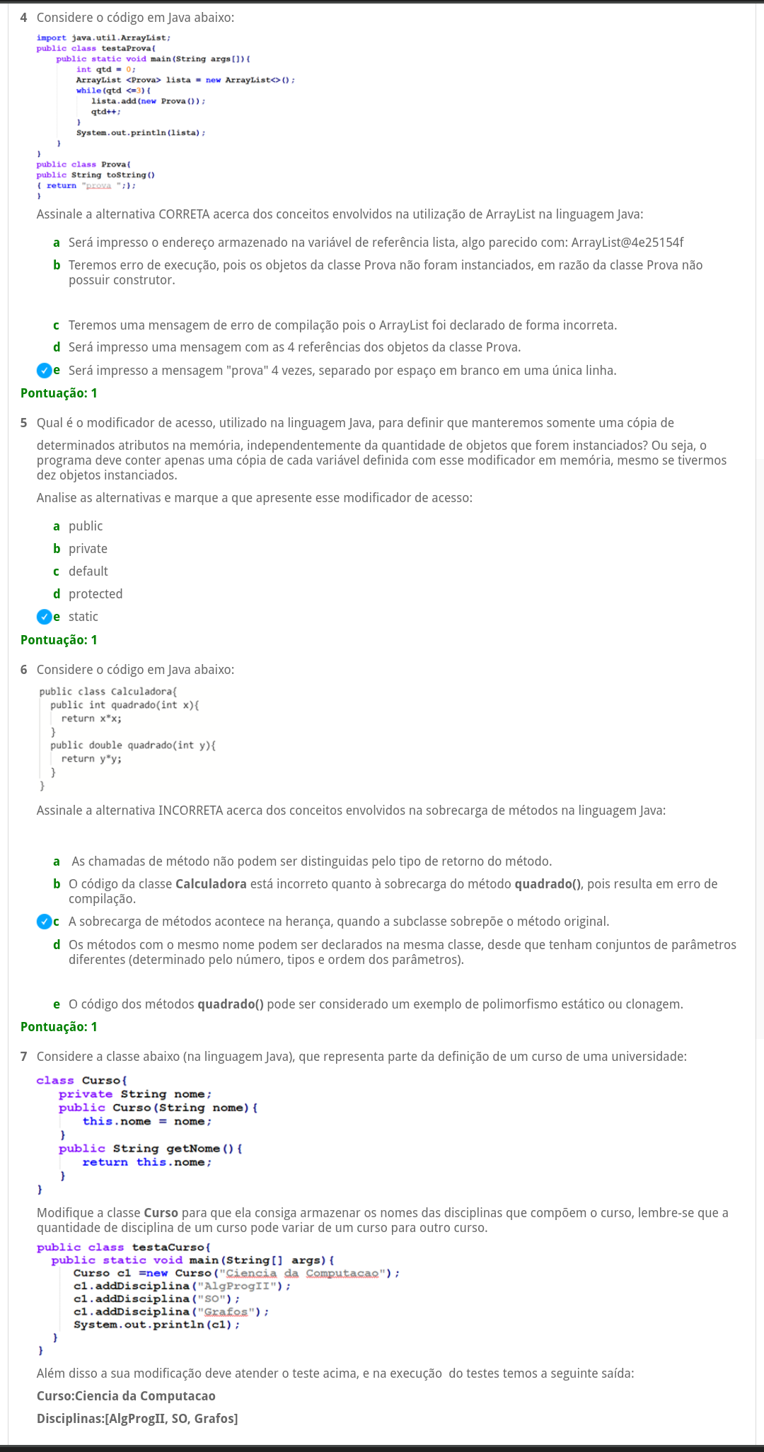 Considere código em Java abaixo: public class Calculadora{ public int int return } public double quadrado(int y){ return y*y; } Assinale a alternativa INCORRETA acerca dos conceitos envolvidos na sobrecarga de métodos na linguagem Java: a- As chamadas de método não podem ser distinguidas pelo tipo de retorno do b- o código da classe Calculadora está incorreto quanto à sobrecarga do método quadrado(), pois resulta em erro de compilação. c- A sobrecarga de métodos acontece na herança, quando a subclasse sobrepõe o método original. d- Os métodos com mesmo nome podem ser declarados na mesma classe, desde que tenham conjuntos de parâmetros diferentes (determinado pelo número, tipos e ordem dos parâmetros). e- o código dos métodos quadrado() pode ser considerado um exemplo de polimorfismo estático ou clonagem.