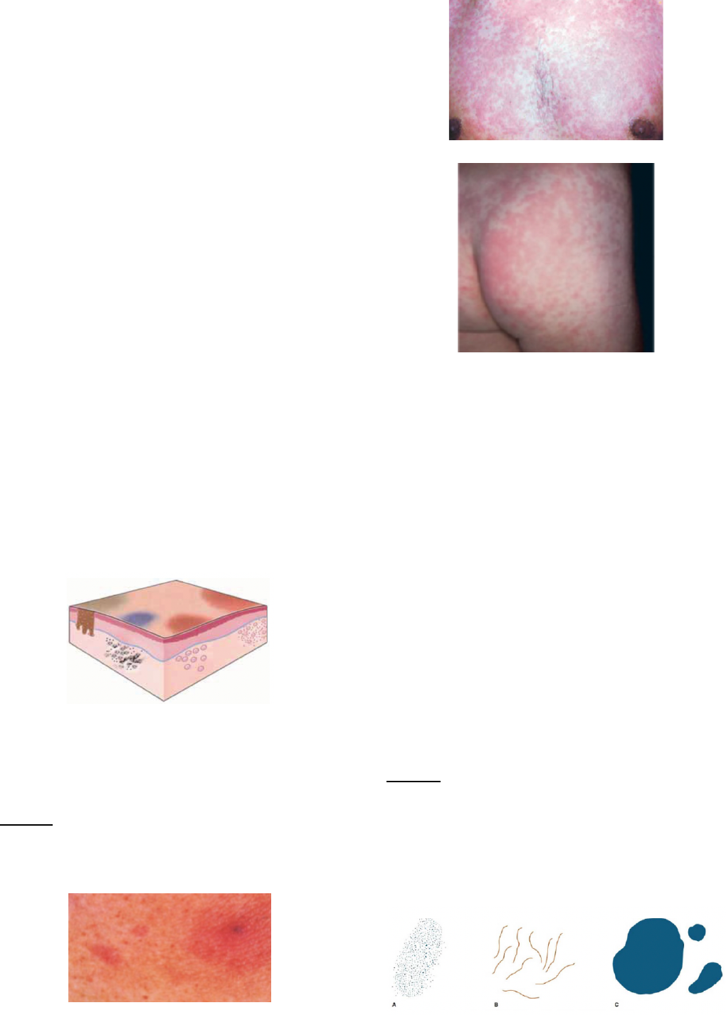 Geovana Sanches, TXXIV LESÕES ELEMENTARES DEFINIÇÃO As lesões elementares ou eflorescências são padrões de alteração do tegumento cujo reconhecimento possibilita a construção de hipóteses diagnósticas. CLASSIFICAÇÃO As lesões elementares são classificadas como primárias, quando uma doença gera a lesão, ou secundárias, quando decorrentes de uma lesão inicial. Elas podem ser classificadas, ainda, em seis grupos bem definidos: 1. Alterações de cor 2. Elevações edematosas 3. Formações sólidas 4. Coleções líquidas 5. Alterações de consistência e/ou espessura 6. Perdas e reparações teciduais Em geral, os números de 1 a 4 se classificam como lesões primárias, enquanto o 5 e o 6 são lesões secundárias. ALTERAÇÕES DE COR: MÁCULAS OU MANCHAS A mancha ou mácula consiste em modificação da cor da pele sem alteração de relevo. São as lesões “que cego não vê”. Dividem- se entre as manchas vasculossanguíneas e as manchas pigmentares. Representação das máculas Manchas vasculossanguíneas As manchas vasculossanguíneas ocorrem por vasodilatação ou constrição ou pelo extravasamento de hemácias. Eritema O eritema é uma mancha de coloração vermelha, decorrente de uma vasodilatação, que desaparece pela dígito ou vitropressão. Meningococcemia Exantema viral Exantema morbiliforme Através da cor, temperatura, localização, extensão e evolução, classifica-se em: • Cianose: eritema arroxeado, por congestão passiva ou venosa, com diminuição da temperatura • Rubor: eritema rubro por vasocongestão ativa ou arterial ou aumento da temperatura • Enantema: eritema em mucosa • Exantema: eritema disseminado, agudo e efêmero. Pode ser: o Morbiliforme (ou rubeoliforme): áreas de manchas entremeadas com pele sã o Escarlatiniforme: difuso e uniforme • Eritema figurado: mancha eritematosa, de borda bem definida, ligeiramente elevada (eventualmente), e de forma e tamanho variáveis Púrpura A púrpura é uma mancha vermelha decorrente do extravasamento de hemácias na derme, que não desaparece a digito ou vitropressão. Na evolução, adquire coloração arroxeada e verde-amarelada pela alteração da hemoglobina. Geovana Sanches, TXXIV Ela é denominada como petéquia (A), se apresenta menos que 1 centímetro de tamanho; equimose (C), quando maior que 1 centrímetro; e víbice (B) se apresenta forma linear. Petéquias Equimoses Mancha angiomatosa A mancha angiomatosa apresenta cor vermelha permanente por aumento névico do número de capilares (neovascularização). Ela regride parcialmente ou totalmente a digito e vitropressão. Mancha angiomatosa Mancha anêmica A mancha anêmica é branca e permanente, decorrente de agenesia vascular. A vitropressão da mancha e da área circunjacente iguala esta à mancha, mostrando haver diminuição ou ausência de rede vascular na derme superficial. Mancha anêmica Telangiectasias As telangiectasias são decorrentes de uma dilatação vascular capilar, de artérias ou veias de pequeno calibre (< 1 mm) presentes na derme superficial. A lesão pode ser linear, sinuosa, estelar ou puntiforme. Telangiectasias Manchas pigmentares As manchas pigmentares ou discromias ocorrem pelo aumento ou diminuição de melanina ou depósito de outros pigmentos na derme. Quando o pigmento é depositado sobre a pele, trata-se de uma mancha artificial. Leucodermia A leucodermia é uma mancha branca por diminuição ou ausência do pigmento melânico na epiderme. É classificada em: • Hipocromia: refere-se à diminuição da melanina, conferindo cor branco-nácar a pele. Hipocromia (Pitiríase alba) • Acromia: refere-se a falta total da melanina, conferindo cor branco-marfim à pele. Acromia (Vitiligo) Hipercromia A hipercromia apresenta cor variável por aumento da melanina ou outros pigmentos. Geovana Sanches, TXXIV O aumento de melanina (melanodermia) se apresenta em várias tonalidades, de castanho- claro, escuro, azulado-castanho até preto. Essa cor também é encontrada pelo depósito de hemosiderina. A cor amarela é causada por pigmentos biliares (icterícia), por caroteno (carotenodermia) ou lipídeos. Drogas via sistêmica como ouro, prata, quinacrina, bismuto, amiodarona, analgésicos e antibióticos (minociclina) também podem causar pigmentações. Melanose Acantose nicgricans Nevo de ota ELEVAÇÕES EDEMATOSAS As elevações edematosas são elevações circunscritas causadas por edema na derme ou na hipoderme. Urtica A urtica é uma elevação efêmera, irregular na forma e extensão (de milímetros a vários centímetros), de cor variável (do branco-róseo ao vermelho) e pruriginosa, circundada por halo eritematoso ou anêmico. É resultante do extravasamento de plasma e desenvolvimento de um edema dérmico circunscrito. A absorção do edema causa o desaparecimento da lesão em algumas horas. Representação das urticas Edema angioneurótico O edema angioneurótico (ou edema de Quincke) é uma área de edema circunscrito que pode ocorrer no subcutâneo, causando tumefação ou saliência em superfície. Edema de Quincke FORMAÇÕES SÓLIDAS As formações sólidas resultam de processo inflamatório ou neoplásico, atingindo, isolada ou conjuntamente, a epiderme, a derme e a hipoderme. Pápula A pápula é uma lesão sólida, circunscrita, elevada, menor que 1 cm em tamanho, com superfície plana ou encurvada. Representação das pápulas Decorre de processo patológico epidérmico, dérmico ou misto. Placa A placa é uma lesão sólida, elevada, maior que 1 cm, geralmente com superfície plana. A superfície também pode ser descamativa, em crostas, queratinizadas ou maceradas. Geovana Sanches, TXXIV Representação das placas Pode ser constituída pela confluência de diversas pápulas (placa papulosa). Nódulo O nódulo é um infiltrado sólido, circunscrito, geralmente bem delimitado, persistente, saliente ou não, com 1 a 3 cm de tamanho. Em geral, é uma lesão mais palpável do que vis