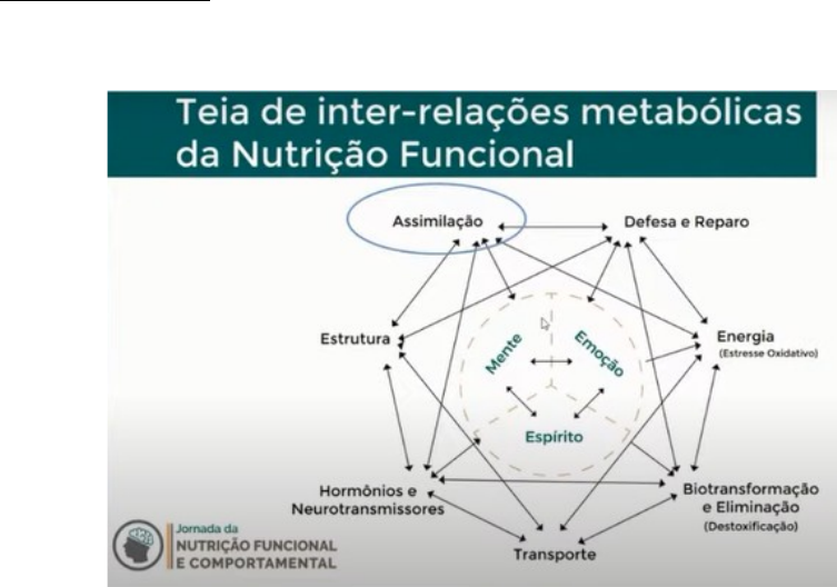 NUTRIÇÃO FUNCIONAL E OMPORTAMENTAL Princípios básicos da nutrição funcional: 1. Individualidade bioquímica 2. Tratamento centrado no paciente 3. Equilíbrio nutricional e biodisponibilidade de nutrientes 4. Inter-relações com fatores fisiológicos (TEIA) 5. Saúde como vitalidade positiva Nutrição funcional: Tem o objetivo de atingir o equilibro do organismo do paciente como um todo: Saúde física, emocional, qualidade de vida por meio de nutrientes e fito químicos. A base para a nutrição funcional é a Teia de inter-relações metabólicas. O objetivo é entender o que está acontecendo com o paciente e a partir daí organizar a melhor conduta nutricional de acordo com os principais sintomas e quais as suas causas, ou seja, o foco é na origem dos sintomas. Os 6 pontos da teia estão relacionados aos sinais e sintomas do paciente sendo que há interferência entre esses. Os sinais e sintomas são colocados nos pontos que estão mais associados. Ex: Dor de cabeça relacionada a TPM – Hormônios e neurotransmissores. Assimilação: É via intestino que ocorre a assimilação de nutriente. Portanto, está relacionado com os sintomas relacionados ao trato gastrointestinal (mastigação, digestão, trânsito intestinal, gases, se algum alimento faz mal, absorção de nutrientes, etc). Defesa e reparo: Relacionado ao sistema imunológico. (resfriados, candidíases, micose, herpes, doenças autoimunes, doenças inflamatórias, queda de imunidade, asma, sinusite, etc.) Hormônios e neurotransmissores: Resistencia a insulina, SOP, endometriose, TPM, fertilidade, depressão, ansiedade, medo, estresse, etc – Como esses fatores estão relacionados com hormônios e neurotransmissores. Biotransformação e eliminação: Desintoxicação. Como o aumulo de toxinas interferem nos fatores citados acima, no desenvolvimento de doenças e como diminuir essas toxinas. Estrutura: Dores corporais, osteopenia, osteoporose, como a pessoa se sente, etc. Ex: Como stress leva a menopausa precoce. Energia: Estresse oxidativo e funcionamento das mitocôndrias. Como alguns fatores levam a menor funcionamento da mitocôndria e queda de ATP. Transporte: Circulação do paciente, transporte de nutrientes até as células. Parte central da Teia: Mente: Relacionada a cognição, desempenho, etc. Emoções: Tristeza, raiva, nervosismos, etc. – Estão muito relacionadas com neurotransmissores ou deficiências de nutrientes. Espírito: Relação com propósitos, conexões, etc. ANAMNESE Rastreamento metabólico: Primeiro passo para identificar os sinais e sintomas. Fundamental para entender o que causa os sinais e sintomas do paciente, para entender o que está acontecendo. É composto por uma lista de sinais e sintomas que são pontuadas da seguinte forma: 0. Nunca ou quase nunca teve o sintoma; 1. Ocasionalmente teve, efeito não severo; 2. Ocasionalmente teve, efeito foi severo; 3. Frequentemente teve, efeito não foi severo; 4. Frequentemente teve, efeito foi severo; *Severo: Afeta o dia a dia e a vida do paciente. Quanto maior a pontuação final, mais indica as alterações de saúde. Exemplo de lista (incompleta): A pontuação final também pode ser utilizada a critério de comparação com consultas anteriores ou utilizar esse rastreamento metabólico apenas como um guia para saber sobre os sinais e sintomas do paciente e fazer uma investigação mais completa. Comparar as queixas relatadas pelo paciente com os sinais e sintomas e ver em qual local da teia está ligado. · Muitas vezes as múltiplas alergias estão relacionadas com sobrecarga hepática. · Náusea entra na parte de detox pois tem haver com fígado Com esse rastreamento, pode-se definir em qual parte da teia começará a tratar o paciente. Toxinas, Inflamação e estresse Magnésio: Cofator de mais de 600 reações enzimáticas e enzimas de fase II de destoxificação e da triptofano hidroxilase que converte o triptofano em serotonina. É responsável por regular a excitabilidade de receptores cerebrais NMDA. Estudos indicam que indivíduos com enxaqueca apresentam queda nos níveis séricos durante e entre os ataques. Quando o paciente está muito estressado, baixo magnésio, baixa de vitamina b6, resistência à insulina, presença de muitas toxinas e inflamação, observa-se um bloqueio na enzima que converte o triptofano em serotonina que é o neurotransmissor responsável pelo bem estar. Nesse caso, o triptofano é desviado para uma outra via metabólica que produz ácido quinolínico que deixa a pessoa mais irritada. Exposição a toxinas, gordura abdominal e resistência à insulina: Poluentes ambientais como agrotóxicos e poluição do ar é um fator de predisposição ao desenvolvimento de resistência à insulina e síndrome metabólica, aumentam o processo inflamatório acarretando no acumulo de gordura. Receptor de insulina: Toxinas, stress, espécie reativas de oxigênio, excesso de glicose, aumento da AGL-TNF alfa (ácidos graxos livres) e IL-6 (citoxinas inflamatórias) ocorre ativação de vias metabólicas que impedem o funcionamento da insulina causando um acumulo na corrente sanguínea. Polifenóis: Aumenta o fator NRF-2 que aumenta o efeito das enzimas antioxidantes e e desentoxicantes. Efeito imuno-protetor, neuroprotetor, hepatoprotetor, protetor renal, reduz danos ao DNA , efeito anticancerígeno, etc. Quecetina: Melhora todo metabolismo hormonal NUTRIÇÃO COMPORTAMENTAL O hábito é o ultimo degrau do comportamento, logo, não deve ser a primeira estratégia de mudança. Ciclo do hábito: O instituto de Tecnologia de Massachusetts (MIT) desenvolveu estudos que mostram áreas do cérebro que se desenvolvem como uma forma evolutiva de poupar esforços, ou seja, atua de forma de automatização de economia de energia. Portanto, é por isso que os hábitos são tão difíceis de serem desfeitos pois são realizados de forma automática para poupar energia. Quando o paciente está no loop do hábito, é precis