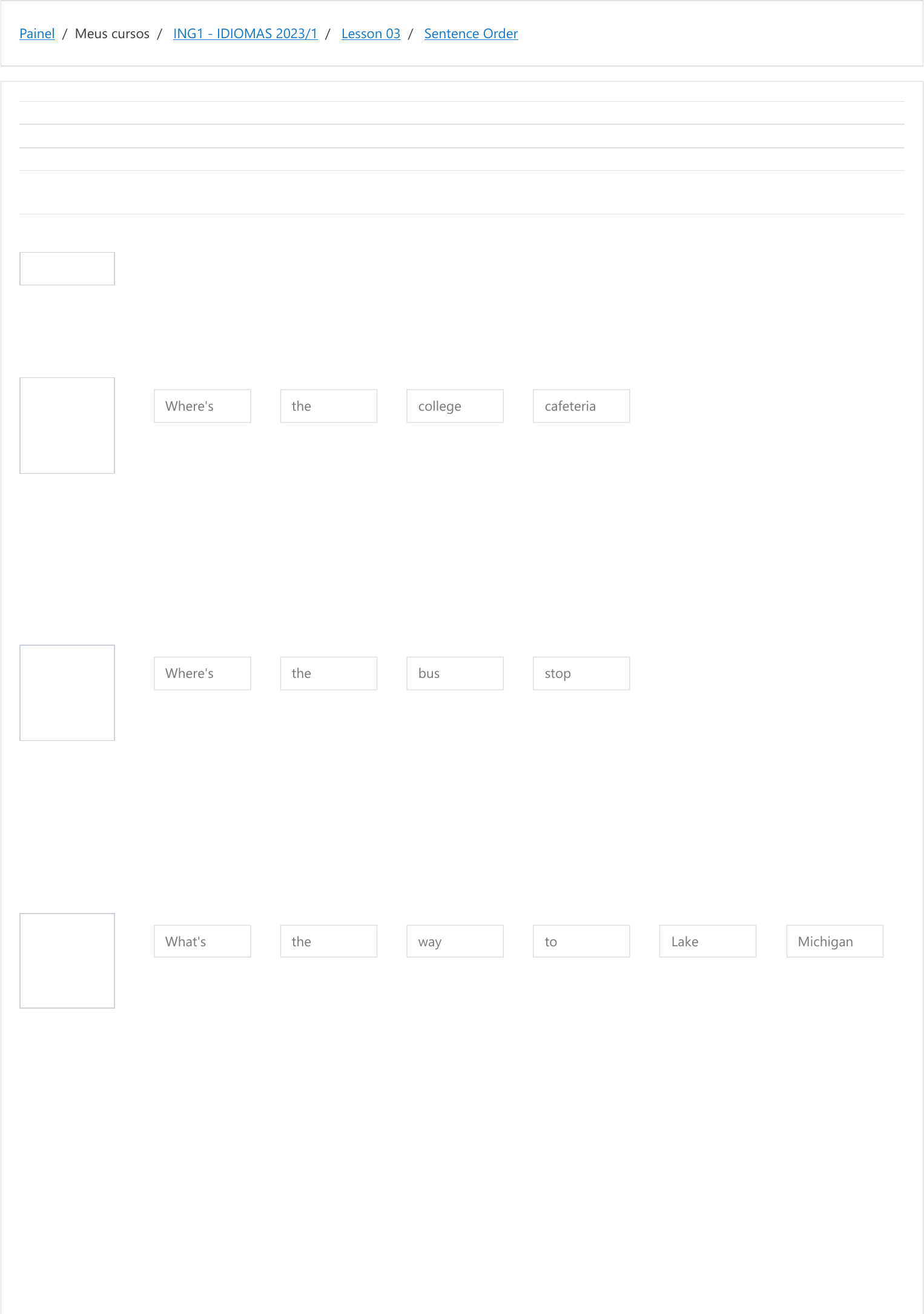 Painel / Meus cursos / ING1 - IDIOMAS 2023/1 / Lesson 03 / Sentence Order Informação Questão 1 Correto Atingiu 2,50 de 2,50 Questão 2 Correto Atingiu 2,50 de 2,50 Questão 3 Correto Atingiu 2,50 de 2,50 Iniciado em quarta, 19 abr 2023, 11:11 Estado Finalizada Concluída em quarta, 19 abr 2023, 11:17 Tempo empregado 5 minutos 36 segundos Avaliar 10,00 de um máximo de 10,00(100%) These sentences are out of order. Select the words and put them in the correct order of a question. ?Where's the college cafeteria Sua resposta está correta. A resposta correta é: [Where's] [the] [college] [cafeteria]? ?Where's the bus stop Sua resposta está correta. A resposta correta é: [Where's] [the ] [bus ] [stop]? ? What's the way to Lake Michigan Sua resposta está correta. A resposta correta é: [What's] [the] [way] [to] [Lake] [Michigan]? https://moodle.ifsul.edu.br/novohamburgo/my/ https://moodle.ifsul.edu.br/novohamburgo/course/view.php?id=336 https://moodle.ifsul.edu.br/novohamburgo/course/view.php?id=336#section-5 https://moodle.ifsul.edu.br/novohamburgo/mod/quiz/view.php?id=53202 Questão 4 Correto Atingiu 2,50 de 2,50 the ? What's the way to shopping mall Sua resposta está correta. A resposta correta é: [What's ] [the ] [way] [to] the [shopping] [mall]? ◄ How to get there (apostila) Seguir para... Positions ► https://moodle.ifsul.edu.br/novohamburgo/mod/resource/view.php?id=53200&forceview=1 https://moodle.ifsul.edu.br/novohamburgo/mod/quiz/view.php?id=53203&forceview=1