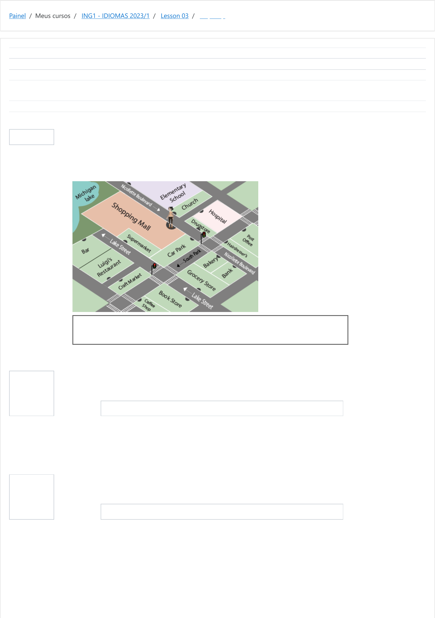 Painel / Meus cursos / ING1 - IDIOMAS 2023/1 / Lesson 03 / City Map Informação Questão 1 Correto Atingiu 1,00 de 1,00 Questão 2 Correto Atingiu 1,00 de 1,00 Iniciado em quarta, 19 abr 2023, 12:08 Estado Finalizada Concluída em quarta, 19 abr 2023, 12:22 Tempo empregado 14 minutos 31 segundos Notas 4,00/4,00 Avaliar 10,00 de um máximo de 10,00(100%) Rosa is sightseeing. Read and listen to the directions and write the places where our character needs to go. She always starts her way to the different places at the shopping mall entrance door. Ao responder essa atividade, por favor, observe a pontuação correta e gramática. Não coloque ponto final na resposta. Resposta: bakery A resposta correta é: bakery Resposta: coffee shop A resposta correta é: coffee shop https://moodle.ifsul.edu.br/novohamburgo/my/ https://moodle.ifsul.edu.br/novohamburgo/course/view.php?id=336 https://moodle.ifsul.edu.br/novohamburgo/course/view.php?id=336#section-5 https://moodle.ifsul.edu.br/novohamburgo/mod/quiz/view.php?id=53211 Questão 3 Correto Atingiu 1,00 de 1,00 Questão 4 Correto Atingiu 1,00 de 1,00 Resposta: post office A resposta correta é: post office Resposta: bar A resposta correta é: bar ◄ Places in the City Seguir para... Phone Calls ► https://moodle.ifsul.edu.br/novohamburgo/mod/quiz/view.php?id=53210&forceview=1 https://moodle.ifsul.edu.br/novohamburgo/mod/quiz/view.php?id=53212&forceview=1