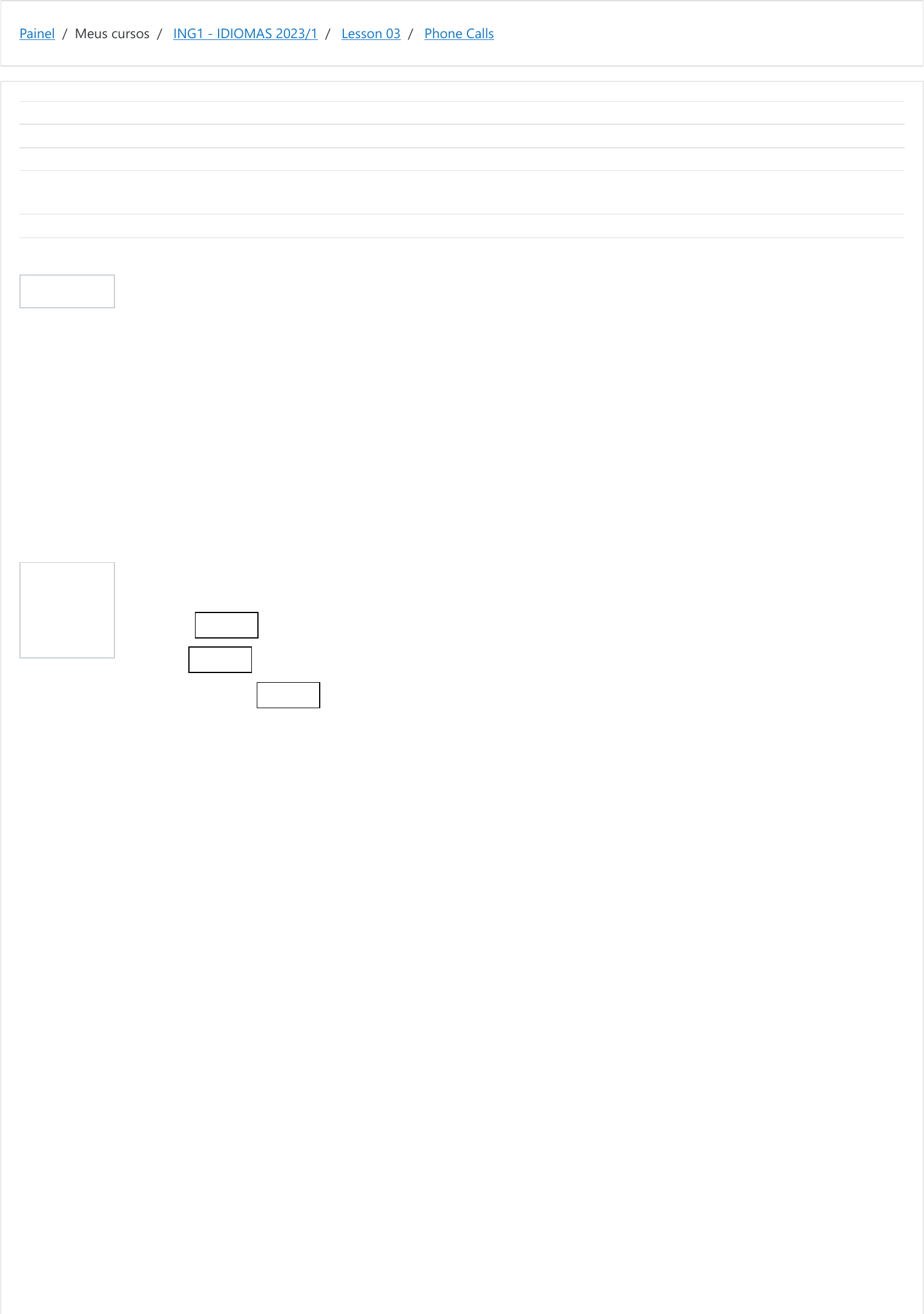 Painel / Meus cursos / ING1 - IDIOMAS 2023/1 / Lesson 03 / Phone Calls Informação Questão 1 Correto Atingiu 1,00 de 1,00 Iniciado em quarta, 19 abr 2023, 12:24 Estado Finalizada Concluída em quarta, 19 abr 2023, 12:29 Tempo empregado 5 minutos 39 segundos Notas 2,00/2,00 Avaliar 10,00 de um máximo de 10,00(100%) Rosa is making some phone calls. Listen to the conversations and complete the information about each dialogue. There is one example to help you. Observe the example: Place: hairdresser Date: 7th Month: May Day of the week: Thursday Place: Date: Day of the week: Sua resposta está correta. A resposta correta é: Place: [pub] Date: [21st] Day of the week: [Saturday] pub Saturday 21st https://moodle.ifsul.edu.br/novohamburgo/my/ https://moodle.ifsul.edu.br/novohamburgo/course/view.php?id=336 https://moodle.ifsul.edu.br/novohamburgo/course/view.php?id=336#section-5 https://moodle.ifsul.edu.br/novohamburgo/mod/quiz/view.php?id=53212 Questão 2 Correto Atingiu 1,00 de 1,00 Place: Date: Month: Day of the week: Sua resposta está correta. A resposta correta é: Place: [bus station] Date: [23rd] Month: [October] Day of the week: [Friday] ◄ City Map Seguir para... What’s the way to? ► 23rd bus station October Friday https://moodle.ifsul.edu.br/novohamburgo/mod/quiz/view.php?id=53211&forceview=1 https://moodle.ifsul.edu.br/novohamburgo/mod/url/view.php?id=53213&forceview=1