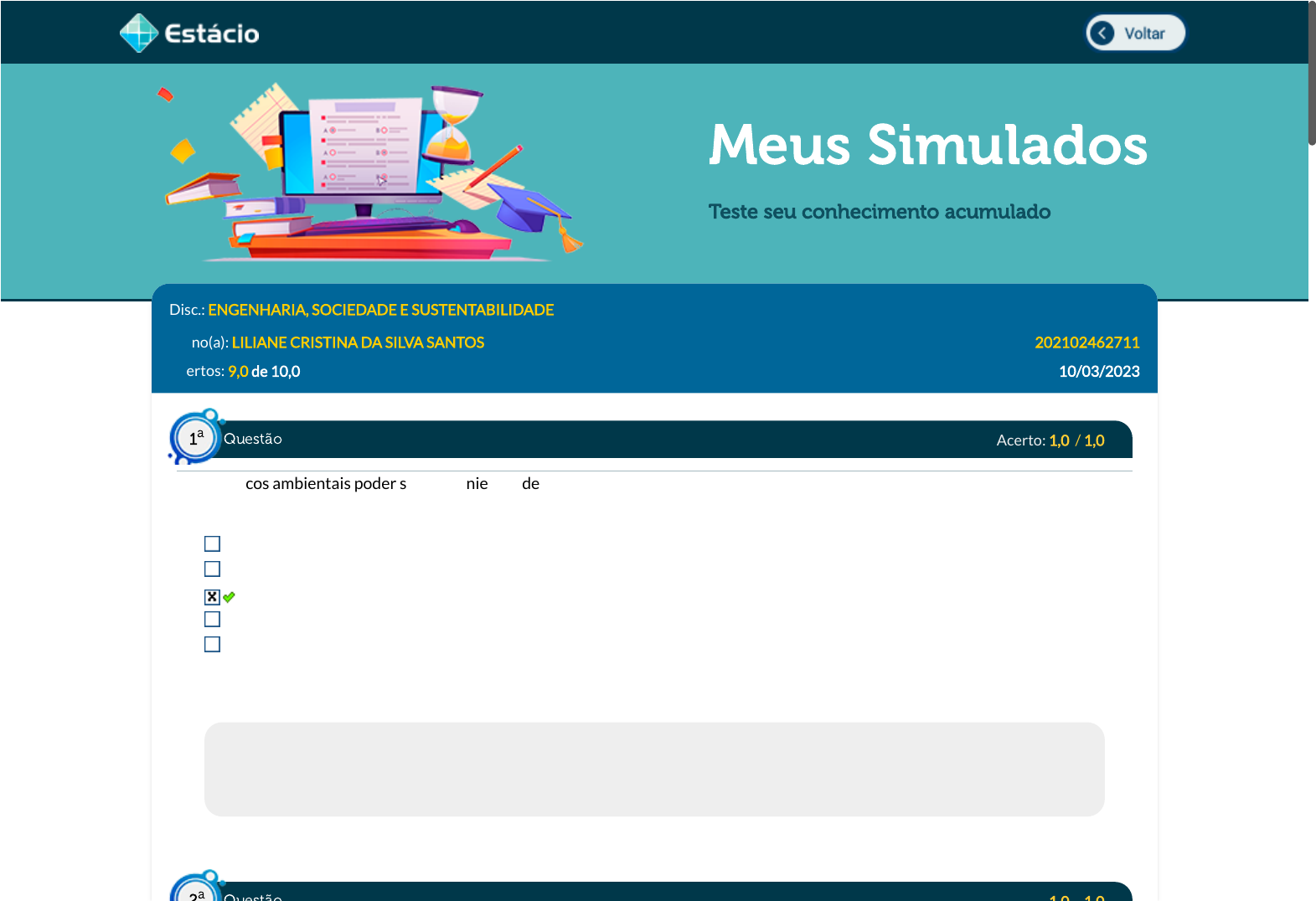 Meus Simulados Teste seu conhecimento acumulado Disc.: ENGENHARIA, SOCIEDADE E SUSTENTABILIDADE Aluno(a): LILIANE CRISTINA DA SILVA SANTOS 202102462711 Acertos: 9,0 de 10,0 10/03/2023 Acerto: 1,0 / 1,0 Os riscos ambientais poder ser provenientes de diversas fontes. Quando provenientes de organismos vivos, como bactérias e vírus, recebem o nome de: naturais. químicos. patogênicos. microbióticos. diretos. Respondido em 10/03/2023 22:24:12 Explicação: Eles também podem ser patogênicos (organismos vivos como bactérias e vírus, que podem causar doenças em outro organismo) ou resultado da destruição da camada de ozônio, das mudanças climáticas e da escassez de água. Acerto: 1 0 / 1 0 Questão1 a Questão2 a https://simulado.estacio.br/alunos/inicio.asp javascript:voltar();