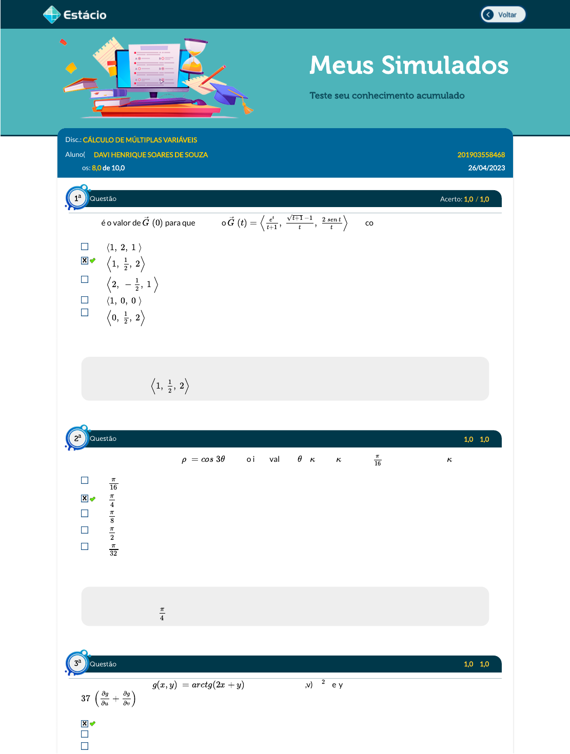Meus Simulados Teste seu conhecimento acumulado Disc.: CÁLCULO DE MÚLTIPLAS VARIÁVEIS Aluno(a): DAVI HENRIQUE SOARES DE SOUZA 201903558468 Acertos: 8,0 de 10,0 26/04/2023 Acerto: 1,0 / 1,0 Qual é o valor de para que a função seja contínua em t = 0? Respondido em 26/04/2023 18:06:55 Explicação: A resposta certa é Acerto: 1,0 / 1,0 A área de�nida pela equação , para o intervalo 0 < < , com > 0, vale . Qual é o valor de ? Respondido em 26/04/2023 18:11:36 Explicação: A resposta correta é Acerto: 1,0 / 1,0 Considere a função . Sabe-se que x(u,v)=u v e y(u,v)=uv. Determine o valor da expressão para (u,v)=(1,2). 13 12 15 →G (0) →G (t) = ⟨ , , ⟩e t t+1 √t+1 −1 t 2 sen t t ⟨1, 2, 1 ⟩ ⟨1, , 2⟩1 2 ⟨2, − , 1 ⟩1 2 ⟨1, 0, 0 ⟩ ⟨0, , 2⟩1 2 ⟨1, , 2⟩1 2 ρ = cos 3θ θ κ κ π 16 κ π 16 π 4 π 8 π 2 π 32 π 4 g(x, y) = arctg(2x + y) 2 37 ( + )∂g ∂u ∂g ∂v Questão1 a Questão2 a Questão3 a https://simulado.estacio.br/alunos/inicio.asp javascript:voltar(); 11 14 Respondido em 26/04/2023 18:11:39 Explicação: A resposta correta é: 13 Acerto: 1,0 / 1,0 Seja a função , onde x = (u+1) , y = u+ 2v e z = v cos u. Determine o valor da derivada parcial de f em relação a v para u = 0 e v = 1. -19 -12 10 14 20 Respondido em 26/04/2023 18:11:42 Explicação: A resposta correta é: -19. Acerto: 1,0 / 1,0 Determine , usando a integral dupla na forma polar, onde S é a região de�nida por . Respondido em 26/04/2023 18:12:14 Explicação: A resposta correta é: Acerto: 1,0 / 1,0 Determine o valor da integral , sendo S a área de�nida pelas retas x +y - 4 = 0, x = y e 0 ≤ x≤ 3. Respondido em 26/04/2023 18:12:56 Explicação: A resposta correta é: f(x, y, z) = x3y − z4y2 ev−1 ∬ S sen (x2 + y2)dx dx x2 + y2 ≤ π e x ≥ 0 5π 3π 4π π 2π 2π ∬ S (x + 2y)dx dy 86 3 46 3 76 3 56 3 96 3 76 3 Questão4 a Questão5 a Questão6 a Acerto: 1,0 / 1,0 Seja o sólido limitado pelos planos e pelo paraboloide . Sabe-se que sua densidade volumétrica de massa é dada pela equação . Marque a alternativa que apresenta a integral tripla que determina o momento de inércia em relação ao eixo z. Respondido em 26/04/2023 18:14:14 Explicação: A resposta correta é: Acerto: 1,0 / 1,0 Determine o valor de 30 50 60 40 70 Respondido em 26/04/2023 18:14:39 Explicação: A resposta correta é: 40 Acerto: 0,0 / 1,0 Uma ferramenta matemática muito importante é a integral de linha, pois permite trabalhar com um campo vetorial, quando se depende de várias variáveis. Considere C o círculo unitário com centro na origem, percorrido no sentido anti-horário, o valor das integrais de linha de é: -2 -1 2 1 0 Respondido em 26/04/2023 18:15:33 Explicação: z = 9 z = 25 − x2 − y2 δ (x, y, z) = x2y2 4 ∫ 0 √16−x2 ∫ 0 25−x2−y2 ∫ 0 (x2 + y2)x2y2dzdydx 4 ∫ −4 √16−x2 ∫ −√16−x2 25−x2−y2 ∫ 9 x2y2dxdydz 4 ∫ −4 √16−x2 ∫ −√16−x2 25−x2−y2 ∫ 9 (x2 + y2)x2y2dzdydx 4 ∫ 0 √16−x2 ∫ −√16−x2 25−x2−y2 ∫ 0 (x2 + y2)x2y2dzdydx 5 ∫ −5 √16−x2 ∫ −√16−x2 25−x2−y2 ∫ 9 (x2 + y2)x2y2dxdydz 4 ∫ −4 √16−x2 ∫ −√16−x2 25−x2−y2 ∫ 9 (x2 + y2)x2y2dzdydx 1 ∫ 3 1 ∫ −1 2 ∫ 0 (x + 2y − 3z)dxdydz ∮ C [sen(xy) + xycos(xy)]dx + (x2cos(xy))dy Questão7 a Questão8 a Questão9 a Acerto: 0,0 / 1,0 Determine a integral de linha , onde a curva C é um retângulo centrado na origem, percorrido no sentido anti-horário, com lados (1,2), ( -1,2), (-1, -2) e (1, -2). Respondido em 26/04/2023 18:16:10 Explicação: Resposta correta: ∮ C eydx + 4xeydy 3(e2 − e−2) 6(e−2 − e2) 4(e−2 − 2e2) 3(2e−2 − e2) 6(e−2 + e2) 6(e−2 − e2) Questão10 a