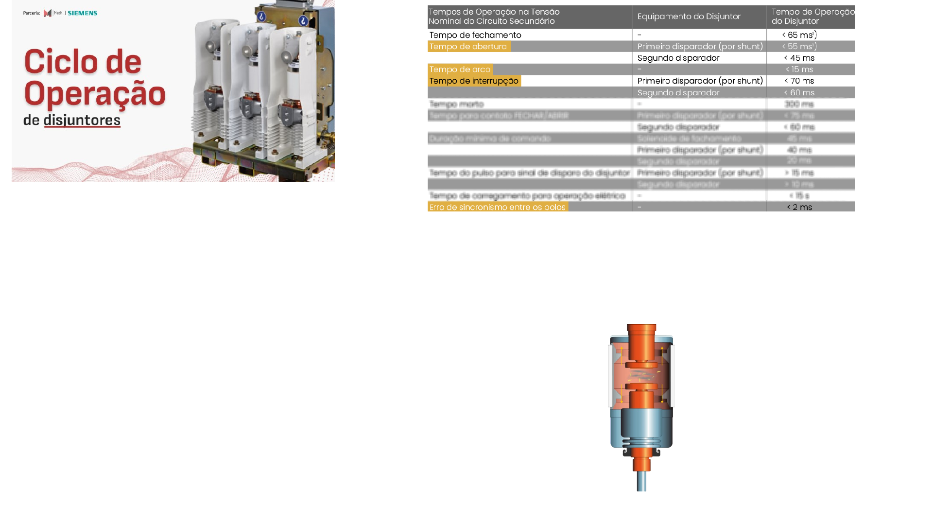 Em disjuntores de média/alta tensão é importante a especificação do ciclo de operação, mas para entendermos melhor o que significa isso iremos abordar alguns termos para termos uma melhor compreensão desse tema. Tempo de arco Leva em consideração o tempo previsto do arco elétrico no disjuntor Tempo de Abertura Máximo Tempo em que os contatos levam para abrir os contatos sem considerar o tempo de arco nos contatos Tempo de interrupção É o tempo que o contato leva desde a energização da bobina até a extinção completa do arco elétrico. Erro de sincronismo entre polos É o erro máximo permitido do tempo da abertura ou fechamento que o primeiro polo tem em relação ao último polo podem ter entre si. Situação de Abertura e Fechamento dos Contatos Em um cenário em que necessite abrir o sistema, o disjuntor será acionado. No momento da abertura dos contatos haverá um arco elétrico na câmara de extinção. Como consequência do arco elétrico irá formar vapor metálico e elevação de temperatura nos contatos. Na situação em que o disjuntor religar o sistema, irá ocorrer fechamento dos contatos. Nessa situação já haverá a presença de vapor metálico e os contatos já estarão com a temperatura elevada. No fechamento os contatos irão se aproximar gradativamente, porém com a presença de vapor metálico o arco elétrico irá ter uma duração maior ocasionando novamente no aumento de temperatura dos contatos. Caso isso se repita por intervalos muito curtos pode haver rompimento da rigidez dielétrica da câmara de extinção ou fusão dos contatos devido ao aquecimento causado pelos arcos elétricos. Ciclo de Operação O ciclo de operação de um disjuntor nada mais é que o tempo mínimo necessário para fazer o religamento de um disjuntor sem que possa diminuir sua vida útil. Segundo a norma da IEEE C37.04-2018 estabelece em que se siga um padrão de: O – Abertura do contato t_r – Tempo de espera necessário para religamento após uma condição de falta CO – Fechamento e consequentemente a abertura dos contatos em condição de falta t'_r - Tempo de espera necessário para religamento após uma condição de falta Sobre questões dos tempos de espera possuem 3 medidas usuais em que os disjuntores podem ser dimensionados: Sendo os mais utilizados serão os: Esse dado vem na placa do disjuntor. Por: Mesh Engenharia Slide 1 Slide 2