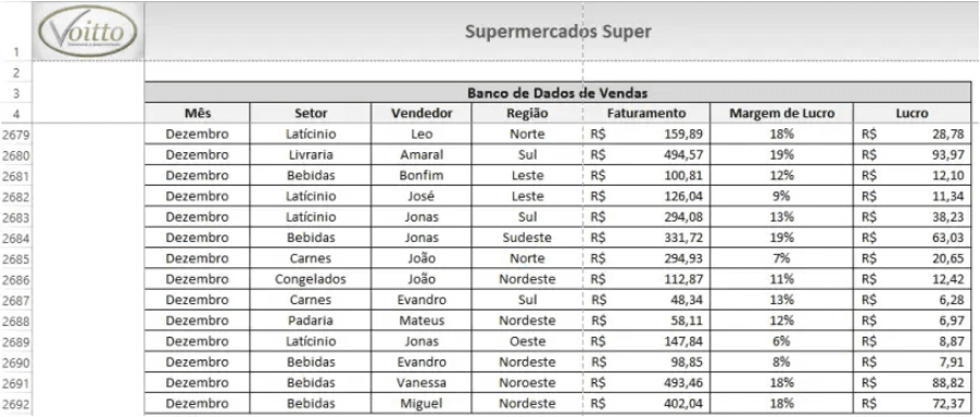 O que é Tabela Dinâmica? Tabela Dinâmica é uma planilha interativa na qual podemos resumir facilmente uma grande base de dados. Com ela, você pode mover as linhas e as colunas de modo que sua formatação facilite a compreensão das principais informações. Além disso, é possível criar filtros ou exibir detalhes das áreas de interesse. O uso da tabela dinâmica é recomendado quando desejamos obter outra visão sobre os totais e médias relacionados. Essa ferramenta é muito útil quando a base de dados apresenta grande número de informações repetidas. Nesse sentido, ela pode inclusive substituir as funções SOMASE, CONT.SE, CONT.SES e outras. Portanto, a tabela dinâmica é um dos recursos mais importantes do Excel e é usada amplamente por milhões de pessoas. A análise de dados é simples, fácil e rápida. Esteja a frente da concorrência! O Excel tem sido um pré-requisto no mercado de trabalho, colocando profissionais que não o dominam nas últimas posições dos processos seletivos. Uma das funções mais importantes dessa ferramenta são as Tabelas Dinâmicas: com elas, você organiza dados de maneira rápida e eficiente. Temos um banco de dados das vendas de uma rede chamada "Supermercados Super". Todos os dados estão separados por: mês, setor, vendedor, região, valor, margem de lucro e lucro de cada venda efetuada. Pretendemos trabalhar esses dados para que possamos extrair informações de forma rápida e dinâmica. Veja que ela possui 2692 registros e cada registro possui cinco campos. Fazer a análise desses dados com as ferramentas que já conhecemos pode ser muito trabalhoso, por isso vamos verificar como utilizar os recursos da tabela dinâmica. Para usar a tabela dinâmica, basta seguir os seguintes passos: · Clique em qualquer célula dentro da tabela e depois na guia Inserir > Tabela Dinâmica. · Selecionando a opção Tabela Dinâmica, aparecerá a janela mostrada na figura abaixo. Certifique-se de que o intervalo de dados está selecionado corretamente (no caso,B4:H2692). · Clique OK e uma nova guia será criada. Essa guia terá a seguinte aparência: Como se pode perceber, foi gerada uma nova planilha de trabalho, na qual é possível escolher à sua direita vários campos listados. Vamos entender um pouco mais sua funcionalidade no próximo tópico. Quer saber mais sobre como fazer tabela dinâmica? Confira o vídeo a seguir: Campos da Tabela Dinâmica Os campos alteram o design da tabela dinâmica e ajudam na organização dos elementos. Você pode escolher quais dados da sua tabela base quer inserir no seu relatório. Confira a seguir a função de cada parte: Escolha os campos para adicionar ao relatório: aqui são exibidos os campos da tabela original. Ao clicar em algum deles, eles serão inseridos como valor na tabela dinâmica gerada. Repare que você pode adicionar os valores clicando nesse campo ou clicando e arrastando o campo desejado até a área VALORES Filtro de Relatório: clique em um campo acima e arraste até essa área. Observe que o campo escolhido se tornou um filtro da nova planilha Rótulos de Linha: clique em um campo acima e arraste até essa área. Verá que o campo escolhido se tornou um rótulo de linha da nova planilha Rótulos de Coluna: clique em um campo acima e arraste até essa área. Verá que o campo escolhido se tornou um rótulo de coluna da nova planilha Valores: clique em um campo e arraste até essa área. Verá que o campo escolhido terá o somatório dos valores de acordo com os requisitos estabelecidos acima nas colunas, linhas e filtros. Utilizando a Tabela Dinâmica Para compreender na prática o que pode ser feito com uma tabela dinâmica, faremos uma suposição. Vamos começar com uma pergunta básica em relação ao supermercado que está sendo estudado. Qual foi o faturamento do supermercado neste ano? Para trabalhar com os dados, basta arrastá-los para as áreas desejadas. Por exemplo, arraste o item "Faturamento" para área VALORES ou então, nesse caso, apenas clique no campo desejado: Ainda trabalhando nesse resultado, vamos agora verificar qual é a média do valor das compras feitas durante o ano, relatadas ainda na coluna "Faturamento". · Clique com o botão esquerdo sobre o resultado anterior e, no menu que se abrirá, escolha a opção "Configurações de Campo de Valor..." · Na caixa de diálogo que aparece, escolha agora a opção no campo resumir por: e clique em OK. Agora, aprenderemos o real diferencial da tabela dinâmica: a relação desses valores com outras variáveis do sistema. Imagina, então, que queremos saber a soma por cada região do Brasil. Arraste o campo "Região" para a área Rótulo de Coluna: Veja que agora temos o valor total de compras, separadas por região: E se quisermos ainda o valor separado por região e por setor do supermercado? Basta arrastar o campo "Setor" para a área Rótulos de Linha. Veja o resultado: E se quisermos ainda o valor separado por região e por setor do supermercado somente no mês de janeiro? · Arraste para a área Filtro de Relatórios o campo "Mês". · Selecione na lista o mês de Janeiro e dê OK. Como resultado final, o Excel criará: Por que fazer uma Tabela Dinâmica? · Possibilidade de analisar dados de uma planilha; · Auxilia no processo de tomada de decisão; · Permite resumir e explorar seus dados de maneira qualitativa; · Transformar informações em relatórios dinâmicos sem a necessidade de criar fórmulas complexas; Como fazer uma Tabela Dinâmica atualizar automaticamente? Após a criação da tabela dinâmica, você pode querer alterar alguns dados da planilha base. Caso os elementos alterados estejam dentro do quadro selecionado eles serão atualizados. Por exemplo, é possível incluir mais linhas de dados e alterar valores que já existem. No entanto, para quem quer adicionar mais colunas, a recomendação é criar uma nova tabela dinâmica. · Como é feita a atualização de uma tabela dinâmica? · C