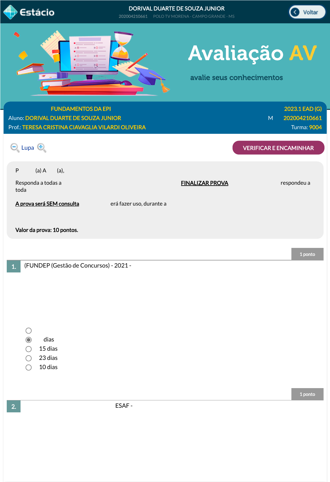 DORIVAL DUARTE DE SOUZA JUNIOR Avaliação AV 202004210661 POLO TV MORENA - CAMPO GRANDE - MS avalie seus conhecimentos 1 ponto (FUNDEP (Gestão de Concursos) - 2021 - CRM - MG - Estatístico) A seguir tem-se o tempo, em dias, de espera para uma amostra aleatória de sete pacientes que agendaram suas consultas em um posto de saúde local. O X representa o tempo de espera do último paciente. 12 8 25 15 2 3 X Sabendo-se que a média aritmética do tempo de espera foi de 10 dias, pode-se concluir que a mediana do tempo de espera desses pacientes foi igual a: (Ref.: 202010310976) 1 ponto (Adaptado de SEFAZ/SP - APOFP - ESAF - 2009) João, aluno da biomedicina, desenvolveu seu projeto de TCC visando entender como a suplementação de vitamina C pode alterar a função renal. Para isso, 23 participantes de pesquisa tomaram durante 7 dias vitamina C 1 x ao dia pela manhã e no oitavo dia eles tiveram a urina coletada para EAS e retiraram amostra de sangue para exame laboratorial, para veri�car alguns marcadores da função renal como ureia e creatinina. Para a dosagem de ureia (mg/mL) ele encontrou as seguintes observações: 17, 12, 9, 23, 14, 6, 3, 18, 42, 25, 18, 12, 34, 5, 17, 20, 7, 8, 21, 13, 31, 24, 9. A partir desses dados qual é o valor da mediana? (Ref.: 202010310977) Disc.: DGT0504 - FUNDAMENTOS DA EPI Período: 2023.1 EAD (G) Aluno: DORIVAL DUARTE DE SOUZA JUNIOR Matr.: 202004210661 Prof.: TERESA CRISTINA CIAVAGLIA VILARDI OLIVEIRA Turma: 9004 Lupa VERIFICAR E ENCAMINHAR Prezado(a) Aluno(a), Responda a todas as questões com atenção. Somente clique no botão FINALIZAR PROVA ao ter certeza de que respondeu a todas as questões e que não precisará mais alterá-las. A prova será SEM consulta. O aluno poderá fazer uso, durante a prova, de uma folha em branco, para rascunho. Nesta folha não será permitido qualquer tipo de anotação prévia, cabendo ao aplicador, nestes casos, recolher a folha de rascunho do aluno. Valor da prova: 10 pontos. 1. 5 dias 8 dias 15 dias 23 dias 10 dias 2. javascript:voltar(); javascript:diminui(); javascript:aumenta(); 1 ponto (CONSULPLAN/FSERJ-2020/Adaptado) Em uma área com 100 mil habitantes, foram noti�cados cerca de 50 casos de sarampo nos últimos dois meses. Com essas informações, os serviços de saúde podem construir indicadores a respeito desse agravo. Considerando tais informações, assinale o indicador de saúde que poderá ser elaborado com os dados descritos. (Ref.: 202010308353) 1 ponto A epidemiologia estuda o processo saúde-doença das populações, por meio da análise de dados para produção de indicadores que contribuem para a geração de informações úteis ao entendimento da situação de saúde de determinada população e ao delineamento de medidas de prevenção, promoção e recuperação da saúde. Portanto, os dados são ferramentas fundamentais da epidemiologia. Sobre os dados pode-se a�rmar que: (Ref.: 202010308351) 1 ponto Um dos objetivos da Epidemiologia é estudar a distribuição dos fenômenos saúde-doença, bem como seus fatores determinantes, em diversas populações. Sobre população e amostra, analise as a�rmativas abaixo: I - O tamanho da amostra não impacta no poder estatístico do estudo epidemiológico. II - A "margem de erro", geralmente entre 5% a 10%, representa a chance daquela amostra retratar o todo. III - A amostragem não probabilística não leva em consideração as probabilidades de cada indivíduo ser incluído na amostra. IV - São exemplos de amostragem probabilística a amostragem por conglomerados e amostragem estrati�cada proporcional. Marque a alternativa que apresenta as a�rmativas corretas. 17 14,5 13,5 14 15,5 3. Taxa de letalidade. Coe�ciente de incidência. Coe�ciente de prevalência. Coe�ciente de morbidade geral. Taxa de epidemia. 4. Os dados podem ser coletados apenas periodicamente. Os dados naturais são aqueles produzidos em condições controladas. .Os dados devem ser expressos sempre de maneira relativa. Os dados podem ser expressos a partir de números (quantidade) ou de categorias (qualidade). Os dados experimentais são aqueles que existem sem a intervenção do pesquisador. 5. (Ref.: 202010307493) 1 ponto Para realizar o levantamento dos índices de infestação domiciliar por Aedes aegypti em certo bairro, os pesquisadores envolvidos, inicialmente, listaram sequencialmente todos os imóveis da região. Em seguida, dividiram o número total de imóveis da região pelo número amostral adequado para a realização do estudo. Conseguiram um resultado de 5 imóveis. Com isso, os pesquisadores sortearam qual imóvel seria o primeiro a ser investigado e, em seguida, contaram o intervalo de 5 imóveis para o próximo a ser avaliado e assim sucessivamente, até completarem o número amostral. Fonte: A autora. Ícone de https://www.�aticon.com/free-icon/house_609803? term=house&page=1&position=6&page=1&position=6&related_id=609803&origin=search. Com base no enunciado, no esquema e nos seus conhecimentos sobre o tema, marque a alternativa que apresenta o método de amostragem foi utilizado na pesquisa acima. (Ref.: 202010307497) 1 ponto Qual o ramo da epidemiologia que avalia a combinação de variáveis grupais ou ecológicas (desigualdade de renda, local da moradia) com variáveis individuais que não permitem a separação e a identi�cação das variáveis de cada indivíduos provenientes do mesmo ambiente? (Ref.: 202010301895) 1 ponto (Quadrix - 2019 - Prefeitura de Jataí - GO) No que se refere aos determinantes sociais da saúde, assinale a alternativa correta. Em I e III. Em II e IV. Em III e IV. Somente em III. Somente IV. 6. Amostragem não probabilística. Amostragem sistemática. Amostragem por conveniência. Amostragem por conglomerados. Amostragem aleatória. 7. Epidemiologia nutricional. Epidemiologia molecular. Epidemiologia genética. Ecoepidemiologia. Epidemiologia geral. 8. (Ref.: 202010301593) 1 ponto Analise a situação problem