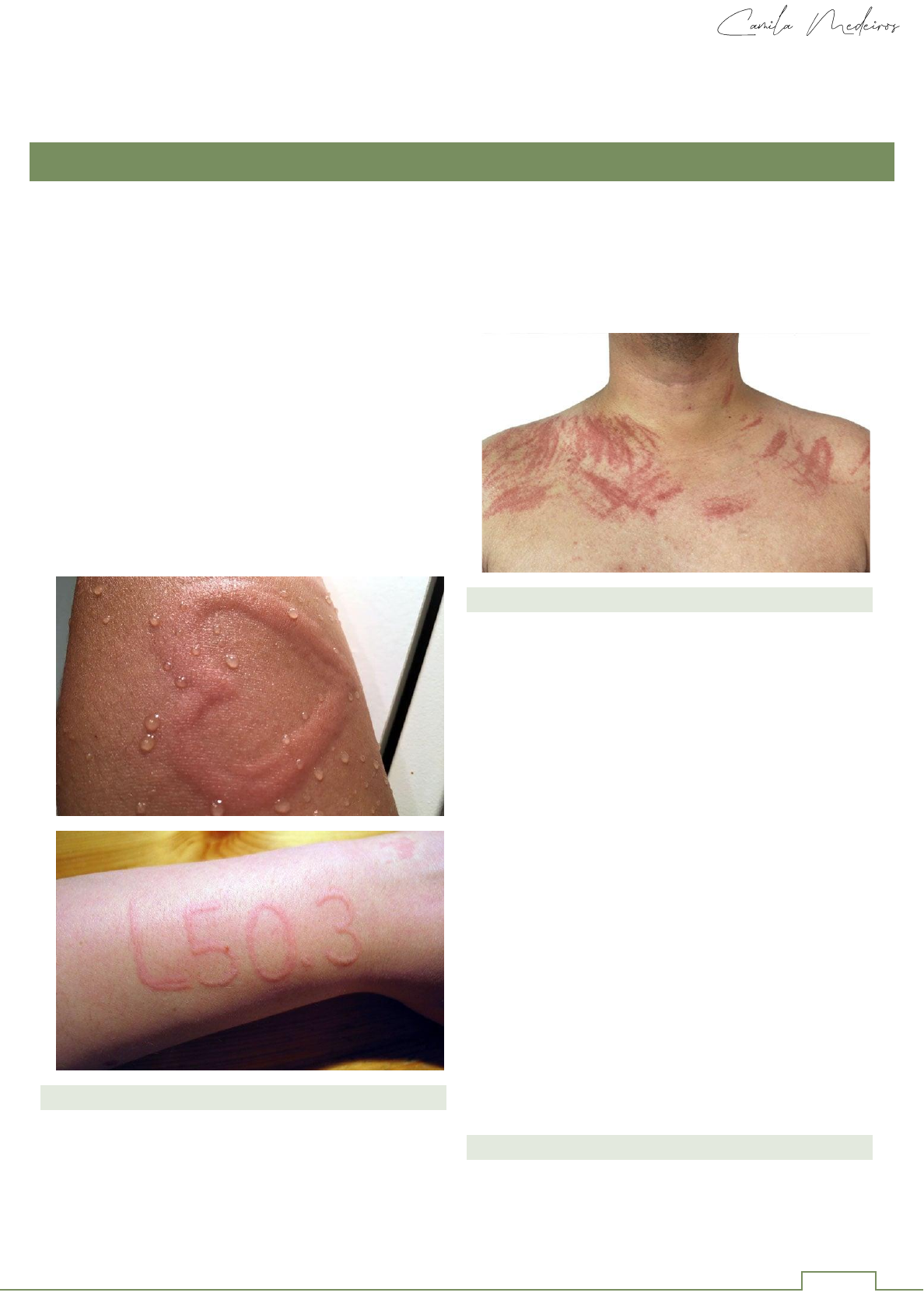 1 O dermografismo, também chamado de urticária dermográfica, urticária factícia, dermatografismo ou dermatografia, é um quadro caracterizado por exagerada reação da pele quando a mesma é arranhada, mesmo que de forma leve O termo dermografismo significa, literalmente, escrever na pele; Os pacientes com essa condição desenvolvem uma reação inflamatória de rápido início, que se apresenta com vermelhidão e inchaço ao longo do trajeto do arranhão ou da pressão na pele; Em alguns pacientes, as lesões coçam bastante; As marcas avermelhadas que surgem são temporárias e desaparecem após cerca de 15 a 30 minutos. Essa resposta exagerada após arranhões ocorre em até 5% da população. TIPOS O dermografismo pode ser dividido em dois tipos: Dermografismo sintomático: é a forma menos comum. As lesões são elevadas, avermelhadas e coçam. Dermografismo simples: é a forma mais comum. As lesões são elevadas, avermelhadas, mas não provocam coceira. O dermografismo é a forma mais comum de urticária induzida, que é um tipo de alergia na pele. CAUSAS A causa exata da urticária dermográfica ainda não está bem esclarecida. A condição é provavelmente uma resposta alérgica, com envolvimento de mastócitos, histamina e imunoglobulina E (IgE), como qualquer outra forma de alergia. Porém, nenhum alérgeno específico já foi identificado. Coisas simples podem desencadear sintomas de dermatografia, por exemplo, arranhões (mesmo leves), toalhas ou fricção da roupa na pele; O dermografismo pode aparecer em qualquer pessoa e em qualquer idade, mas é mais comum em adultos jovens; o pico de incidência é na segunda e terceira décadas de vida; Pessoas com pele seca ou com dermatites apresentam risco mais elevado; Em alguns casos, o paciente pode desenvolver dermografismo após episódios de estresse emocional, picadas de mosquito, uso de medicamentos, como a penicilina, atorvastatina ou famotidina, doenças da tireoide ou infecções, como por vírus, H.pylori ou escabiose. SINTOMAS Na maioria das pessoas, se você faz um arranhão na pele com a unha, a lesão apresenta-se inicialmente branca e depois fica levemente avermelhada com pouca ou nenhuma elevação. dermografismo IMUNOLOGIA o que é 2 Nos pacientes com dermografismo simples, cerca de 6 a 7 minutos após o arranhão, surge uma vermelhidão e elevação na pele que podem durar de 15 a 30 minutos; A lesão é tão restrita ao local arranhado, que é possível fazer desenhos e escrever na pele; Nos pacientes com dermografismo sintomático, o quadro é semelhante, mas as lesões surgem mais rapidamente, com menos de 5 minutos, são pruriginosas e duram cerca de 30 minutos; Calor, suor, exercício físico ou estresse emocional podem tornar as lesões mais exuberantes. PROGNÓSTICO A urticária dermográfica é uma condição benigna que raramente provoca algum transtorno mais grave à vida do paciente. A coceira é o sintoma que mais incomoda. A história natural da doença é imprevisível, ela pode durar meses, anos ou estar presente apenas forma intermitente ao longo da vida; Na maioria dos pacientes, a condição melhora gradualmente e desaparece após vários anos. Cerca de 36% curam-se após 5 anos, e 51% após 10 anos. PREVENÇÃO Para reduzir o desconforto e prevenir os sintomas da dermatografia, algumas atitudes podem ajudar: Evite produtos que possam irritar a pele, como sabonetes ásperos ou escovas de banho; Não use roupas feitas de material que coçam, como lã; Evite banhos quentes; Evite roupas apertadas ou que causem fricção; Evite esportes com muito contato físico, como lutas; Não risque sua pele. Não “brinque” com a doença, fazendo desenhos na pele; Mantenha a pele bem hidratada, com hidratantes, cremes ou óleos apropriados; Evite estresse e tente dormir pelo menos 7 a 8 horas por noite; Banhos de sol de manhã ou no final da tarde costumam ajudar. TRATAMENTO No dermografismo simples, como o paciente não tem sintomas, o tratamento é basicamente de prevenção, com as medidas citadas acima. No dermografismo sintomático, o tratamento depende da intensidade da coceira e da vontade do paciente. Muitas vezes, apenas as medidas de prevenção já são suficientes para controlar a doença; Anti-histamínicos em comprimidos, como hidroxizina, difenidramina, fexofenadina, dexclorfeniramina, loratadina ou cetirizina, são boas opções para reduzir a coceira; Nos casos mais severos de dermografismo sintomático, o omalizumab, um anticorpo monoclonal recombinante humanizado contra imunoglobulina E (IgE), tem sido usado com sucesso.