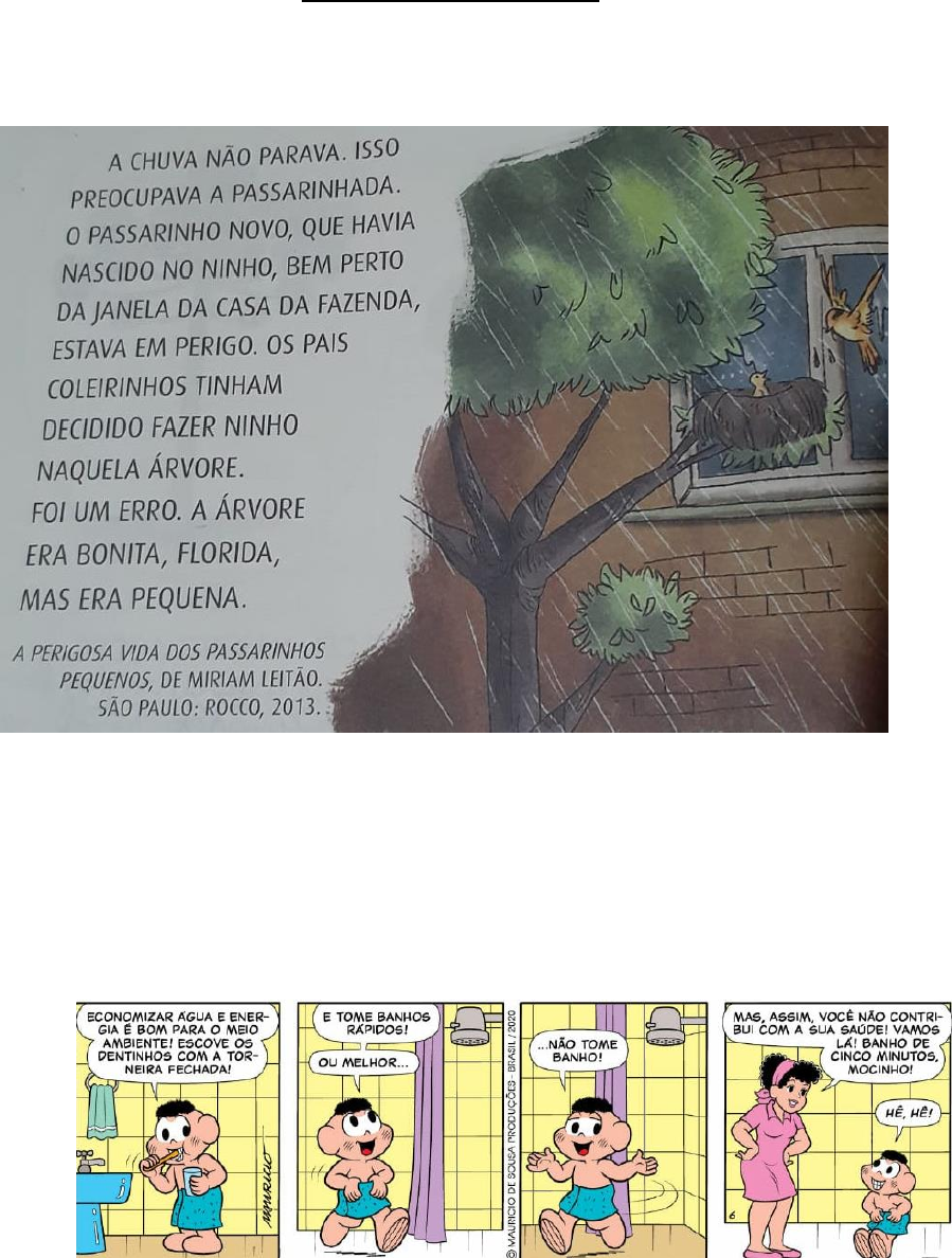 ESCOLA MUNICIPAL “SECUNDINO VIEIRA DE MELO” TURMA: A 2º ANO DATA:_____/____/_______ ALUNO(ª)__________________________________________________ PROFESSORA: LOURDES AVALIAÇÃO DE CIÊNCIAS 1) Leia o texto a seguir e, depois faça o que se pede. 2) Complete a frase a seguir: a) A chuva não parava. Isso preocupava a _______________________ 3) Escreva um componente natural citado no texto. ______________________________________________________ 4) Qual é o assunto do texto? A ( ) Economizar água e nergia C ( ) Ligar a torneira B ( ) Despediçar água D ( ) Tomar banho 5) Nós utilizamos muitas plantas na alimentação. Elas fornecem nutrientes importantes para o bom funcionamento do nosso corpo. Como raizes, caules, folhas, flores e frutas. 6) Complete as frases informando a parte da planta que é consumida. Do __________________ As ____________________ da cana-de-açúcar pode ser da couve-flor são comestiveis produzido o açúcar. e nutritivas. As ____________________ da alface são usados em saladas. 7) Sala de frutas Você sabe como se faz uma salada de frutas? Siga a receita: Ingredientes: Frutas variadas (por exemplo, Banana, mamão, manga, morango e maçã); Suco de laranja (opcional); Garfo (ou faca) ; Tigela. Modo de fazer: 1. Lave as mão comágua e sabão. 2. Lave as frutas em água corrente. 3. Descasque e pique as frutas, Peça a ajuda de um adulto para cortá- las. 4. Junte todas as frutas picadas e o suco de laranja em um recipiente grande e misture. Pronto! Agora é só comer! Para responder! Numere as imagens a seguir de acordo com as etapas da receita. ( ) ( ) ( ) ( )
