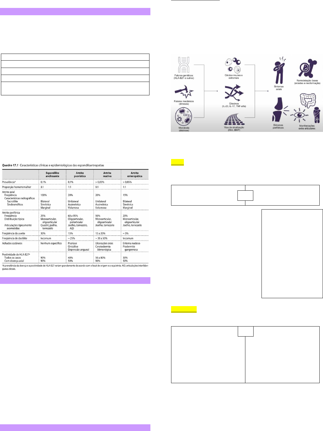 ESPONDILOARTRITES CONCEITOS: Grupo de doenças inter-relacionadas com superposição de manifestações clínicas e compartilhamento de marcadores genéticos NOVO CONCEITO Patologia única com expressão clínica heterogênea e distribuição espectral ESPONDILITE ANQUILOSANTES ARTRITE PSORIÁSICA ARTRITE REATIVA ARTRITE DAS DOENÇAS INFLAMATÓRIAS INTESTINAIS ESPONDILOARTRITES INDIFERENCIADAS (pcte com sintomas, rnm de espondiloartrite mas rx normal) Predomínio masculino Classifica como axial x periférica (onde é predominante e não exclusivo) Anquilosante (simétrico – bilateral) – fusão fina Psoriatica – fusão grosseira (alça de jarra), assimétrica Dentro das manifestações extra-articulares a principal é a uveíte – pcte com uveíte anterior aguda e recorrente pensar em espondiloartrite CARACTERÍSTICAS COMUNS: Acometimento tanto do esqueleto axial quanto periférico Frequente acometimento inflamatório das enteses (local onde o tendão entra no osso) Negatividade para pesquisa FR (soronegativas) Associação com HLA-B27 Tendência a superposição entre diversas enfermidades HLA-B27 Receptor de membrana responsável por pegar proteína e apresentar para o linfócito Quem tem esse subtipo, produz HLA com defeito, estimula sistema inflamatório sem ter estimulo (vírus, bacteria). DOENÇA AUTOINFLAMATORIA E NÃO AUTOIMUNE Subtipo do gene responsável pela produção do MHC de Classe I MHC é responsável pela apresentação de antígenos à linfócitos CD8 HLA-B27 pode ativar linfócitos T a reagirem de forma cruzada com antígenos próprios FISIOPATOLOGIA Reação cruzada do HLA-B27 com Linfócitos T CD8 levando à perda do reconhecimento ‘’self’’ ERAP1: enzima responsável pela manipulação e clivagem de peptídeos – que ‘’corta’’ errado e ativa cascata de inflamação ESTRESSE MECÂNICO: - Êntese: sítio onde se iniciam as alterações fisiopatológicas das EpA - Estresse mecânico na entese atua como iniciador de uma resposta pouco propensa à resolução - Formação de entesófitos acomete principalmente áreas sujeitas à tensão, enquanto as erosões ocorrem nas áreas sujeitas à compressão DIAGNÓSTICO: 1º Classificar se é Axial x Periférica AXIAL PACIENTE COM DOR LOMBAR ≥ 3 MESES E IDADE DE INÍCIO <45 ANOS SACROILIÍTE NA IMAGEM* + ≥1 CARACTERÍSTICA EpA HLA-B27 + ≥ 2 CARACTERÍSTICAS EpA CARACTERÍSTICAS EpA: - dor lombar inflamatória - artrite - Entesite - Uveíte - Dactilite - Psoríase / Crohn / Colite ulcerativa - Boa resposta a AINEs - Hist. familiar de EpA - HLA-B27 - PCR elevada PERIFÉRICA ARTRITE OU ENTESITE OU DACTILITE + ≥1 característica EpA - Uveíte - Psoríase / Crohn / Colite ulcerativa - Infecção precedente - HLA-B27 - Sacroiliíte pela imagem ≥2 características EpA - Artrite - Entesite - Dactilite - Dor lombar de ritmo inflamatório - Historia famíliar de EpA *Sacroiliíte na imagem* Inflamação ativa (aguda) na RNM, altamente sugestiva de sacroileite associado a EpA Sacroiliíte radiológica definida, de acordo com os critérios modificados de New York [grau II bilateral ou 3 e 4 unilateral] OU OU ESPONDILITE ANQUILOSANTE CONCEITOS: Protótipo das Espondiloartrites – forma mais frequentemente observada EPIDEMIOLOGIA: Predomínio em homens 2 a 4:1 Início dos sintomas entre os 20 e 35 anos Acomete cerca de 0,1 a 0,2 da população geral, chegando 1% no norte europeu CARACTERÍSTICA: Afeta esqueleto axial, as enteses e, ocasionalmente articulações periféricas PRINCIPAL CARACTERÍSTICA: DOR LOMBAR INFLAMATÓRIA + SACROILEÍTE RADIOGRÁFICA Manifestações extra-articulares: uveíte (anterior) , doença cardíaca (alterações de condução), pulmonar (fibrose apical) e renal (nefropatia por aine – amiloidose) CLÍNICA Queixa mais comum: dor lombar e/ou nas articulações sacroilíacas Dor pode irradiar para MMII, em geral bilateral ou unilateral alternante sem sintomas parestésicos Exame físico: retificação da lordose lombar Quadril: deformidade em flexão e eventualmente, destruição articular acometimento de quadril – MARCADOR DE DOENÇA GRAVE Ombro estreitamento do espaço articular e alterações erosivas no aspecto súperolateral da cabeça do úmero ACOMENTIMENTO PERIFÉRICO Oligoartrite assimétrica predominantemente em extremidades inferiores Acometimento – dor, edema, calor e limitação Mais comum nas grandes articulações – coxofemorais, joelhos, ombros e tornozelos ENTESITE: mais comum fáscia plantar MANIFESTAÇÃO EXTRA-ARTICULAR: - Ocular: 25% = 90% uveíte anterior (iridociclite) com hiperemia ocular intensa, visão borrada, dor, fotofobia e lacrimejamento de início súbito - Cardíacas (0,9-10%)= aortite, regurgitação aórtica e anomalias de condução - Pulmonares (0,9-3%) = espessamento pleural, apneia obstrutiva do sono e até fibrose pulmonar apical - Renal (0,9-3%) = amiloidose secundária, nefropatia por AINE - Osteoporose: dx complicado por falsos aumentos da DMO na coluna em decorrência da ossificação EXAME FÍSICO: TESTE DE SCHOBER TESTE DE SCHOBER MODIFICADO - Paciente em pé, traça uma linha imaginária ligando as duas espinhas ilíacas póstero-superiores - No meio dessa linha, 10 cm acima (na vertical) traça outra linha paralela - Pede para o paciente fletir o tronco ao máximo com os joelhos bem estendidos (tocar os pés com as mãos) - Medir a distância entre as duas marcas – NORMAL deve ultrapassar 15 cm AVALIAÇÃO DA INCLINAÇÃO LATERAL – flexão axial lateral DISTANCIA TRAGUS-PAREDE / DISTÂNCIA OCCIPITO-PAREDE AVALIAÇÃO DA EXPANSABILIDADE TORÁCICA Mãos repousam sobre/atrás da cabeça Medida no 4ºEIC anteriormente Diferença entre inspiração máxima (1) e expiração (2) é anotada Registrar melhor valor de duas tentativas DISTANCIA INTERMALEOLAR Afastar o máximo possível pernadas com joelhos estendidos e artelhos apontando para cima Distância entre os maléolos mediais é a medida ROTAÇÃO CERVICAL AVALIAÇÃO RADIOLÓ
