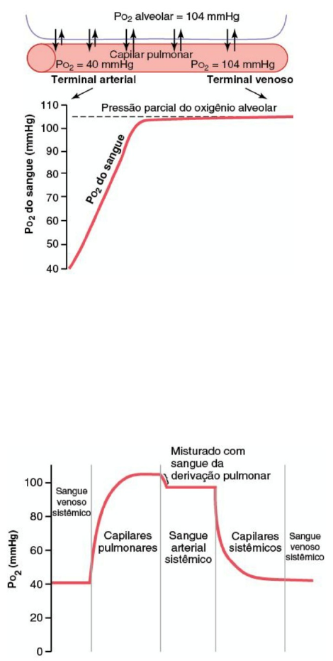 Fisiologia Transporte de O2 e CO2 no sangue e nos tecidos · Transporte de 02 dos pulmões para os tecidos corporais: A hemoglobina consegue transportar o 02 de uma maneira mais rápida do que se ele fosse dissolvido no plasma. A troca de gases se dá devido a diferença de pressão entre membranas e o transporte ocorre a partir da difusão. Com isso, como a pressão de O2 dentro dos alvéolos é a maior é mais fácil que esse gás passe dos alvéolos para o sangue fazendo o sangue arterial ter maior porcentagem de O2 comparado ao espaço intersticial, por exemplo (PO2 sangue>PO2 espaço intersticial>PO2 intracelular). Na figura acima: nota-se o alvéolo e o capilar pulmonar, com isso, no começo a concentração de oxigênio no capilar é de 40 mmHg (é o valor normalmente encontrado no sangue venoso – após ter percorrido pelos tecidos). A pressão alveolar é de 104 mmHg, logo como a pressão é maior o gás irá se difundir em direção ao lugar de menor pressão, ou seja, o capilar pulmonar. Após isso, no final a pressão no capilar se iguala a do alvéolo e passa a ser 104 mmHg. No sangue venoso sistêmico a PO2 vai estar em torno de 40 mmHg e quando chega aos capilares pulmonares ela vai aumentando até atingir em torno de 104 mmHg. Além disso, existe uma derivação pulmonar que é um sangue provido das artérias brônquicas faz com que essa pressão caio um pouco e fique em torno de 95 mmHg e esse sangue que chega no átrio esquerdo e ser distribuído até chegar aos capilares sistêmicos e ai começa a ocorrer trocas gasosas e essa pressão sofre uma queda e retorna ao sistema venosa com uma pressão de 40 mmHg. Quando esse sangue chega nos tecidos periféricos a PO2 é de 95 mmHg e o liquido intersticial tem uma concentração de oxigênio mais baixa de 40 mmHg. Ademais, dentro da célula a PO2 é ainda menor em torno de 23 mmHg. Existem 2 fatores que determinam a velocidade/quantidade desse transporte: 1. Fluxo sanguíneo: se aumenta o fluxo sanguíneo é natural que chegue mais O2 e eleve a PO2 do tecido B -> aumento do fluxo sanguíneo -> maior consumo de O2 C -> baixa do fluxo sanguíneo -> queda no consumo de O2 2. Metabolismo tecidual: se há o aumento do metabolismo do O2 pelos tecidos gera uma queda na PO2 do liquido intersticial (devido ao maior consumo pelo tecido) Quando diminui esse consumo (1/4 do normal) a PO2 aumenta muito no liquido intersticial. · Transporte de CO2 dos tecidos corporais para os pulmões O metabolismo do O2 é a formação de CO2 e isso aumenta consideravelmente a pressão de CO2 dentro da célula (PCO2 em torno de 46 mmHg). Além disso, o CO2 é mais difusível que o O2 (cerca de 20X mais), ou seja, é preciso ter pequenas diferenças de pressão para conseguir deslocar o CO2 de um lugar para outro. PC02 da célula > PCO2 do espaço intersticial (45 mmHg) > PCO2 dos capilares (40 mmHg) Na extremidade de chegada do capilar a PCO2 chega com 45 mmHg e dentro dos alvéolos está com pressão de 40 mmHg e ocorre a troca e a PCO2 volta ao normal (40 mmHg). No CO2 o metabolismo e o fluxo sanguíneo também são fatores que alteram o valor da PCO2 como ocorre para o O2. Quando a redução de fluxo sanguíneo há um acúmulo de CO2 no tecido e aumenta a PCO2 do liquido intersticial. A -> normal B -> queda no fluxo sanguíneo e aumento da PCO2 do liquido intersticial C -> aumento do fluxo sanguíneo e queda da PCO2 Quanto maior for o metabolismo do tecido maior será a produção de CO2 e a queda do metabolismo diminui a produção de CO2 pelo tecido. · Papel da hemoglobina no transporte de O2 Hemoglobina -> possui 4 agrupamentos HEME, no qual recebem e se ligam a moléculas de O2 -> cada hemoglobina transporta 4 moléculas de O2 Essa ligação do O2 com a hemoglobina é uma ligação que é frouxa e outra que é reversível, ou seja, no momento em que o tecido precisa de uma concentração maior de oxigênio e esse gás consegue se soltar da hemoglobina e chegar nesse tecido, caso ocorra o contrário, quando o sangue não tem necessidade desse gás ele não se solta e continua preso a hemoglobina. No gráfico: quando maior a PO2 (maior concentração de O2 nos capilares pulmonares) maior é a saturação da hemoglobina, ou seja, maior a quantidade de O2 ligado a hemoglobina. Logo, conforme o sangue vai oxigenando os tecidos o valor da PO2 também cai e consequentemente há uma queda da saturação da hemoglobina. A hemoglobina funciona como tampão para PO2 tecidual, ou seja, se não fosse esse transporte que ela faz (oxigênio ligado) haveria uma alteração na pressão parcial do O2 nos tecidos e isso poderia levar prejuízo aos tecidos. A hemoglobina mantém constante essa variação de pressão evitando alterações bruscas. · Fatores que desviam a curva de dissociação de O2-Hb O pH normal é de 7,4 e em situações que ocorre o aumento desse valor é chamado de alcalose e quando ocorre a queda leva o nome de acidose. Essa curva de dissociação mostra alguns fatores que interferem em como a hemoglobina vai se desgrudar do O2 (todos esses fatores desviam a curva para a direita -> acidose): 1. Mais íons de hidrogênio: o aumento da concentração desses íons leva a diminuição do pH -> a curva desvia para a direita, ou seja, ocorre uma diminuição da junção da hemoglobina com a molécula de O2 (menor saturação/aumenta a dissociação). Por outro lado, quando há a queda da concentração desses íons gera o aumento do pH e levando a curva para a esquerda (alcalose) e, dessa forma, há o aumento da saturação de O2 (aumenta a ligação do O2 com a hemoglobina/diminui a dissociação). 2. CO2 elevado: o aumento desse gás leva a uma acidose, isso ocorre devido a um aumento do metabolismo do tecido e, com isso, passou a produzir um número alto de CO2 e hidrogênio ou existe algum processo patológico no organismo que está produzindo acidose. Logo, nosso organismo entende que é necessário ofertar uma quantidade maior de oxigênio 