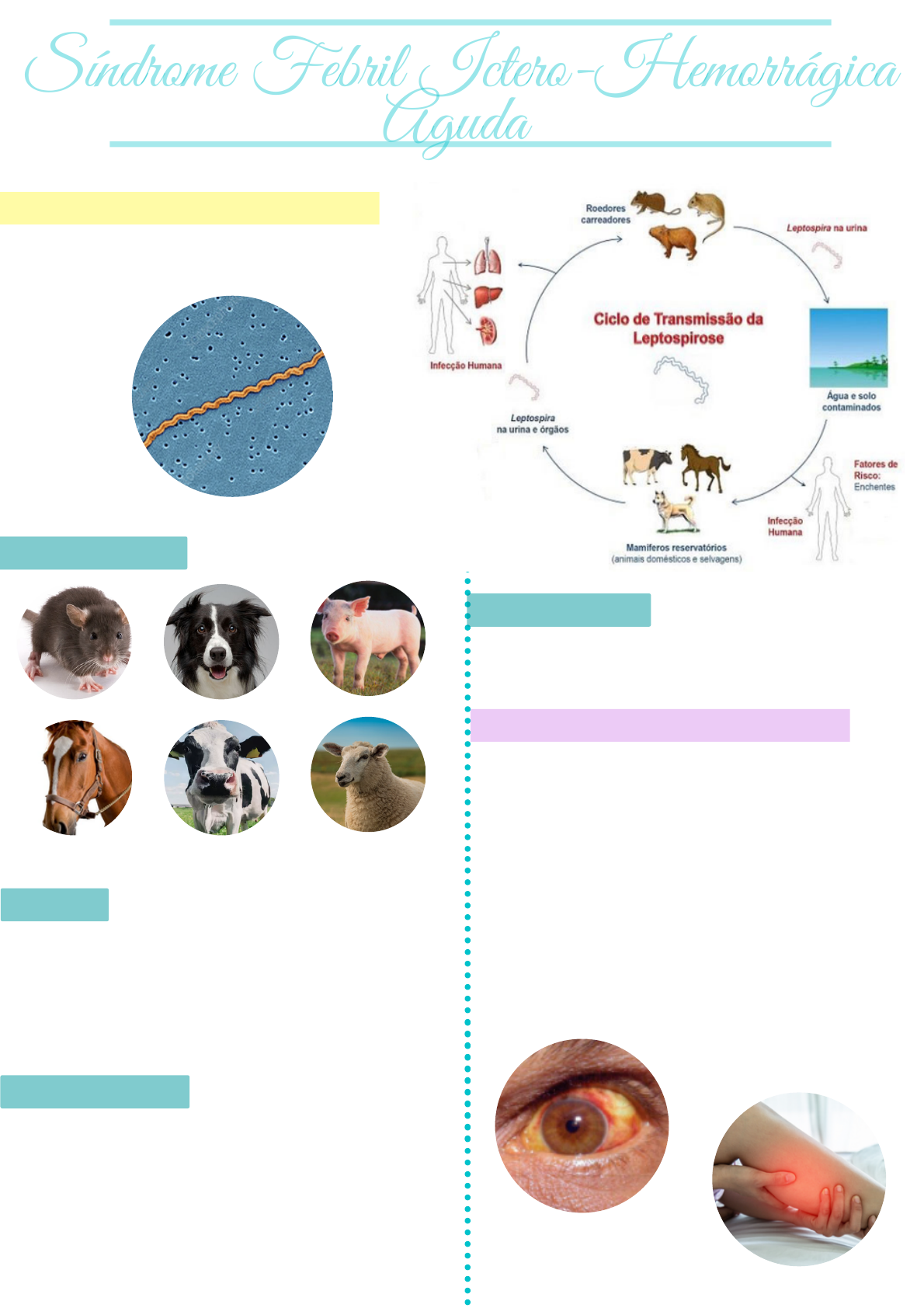 Leptospirose Verônica Crisci Síndrome Febril Ictero-HemorrágicaSíndrome Febril Ictero-Hemorrágica *Leptospira spp - bactéria, espiroqueta *Urina, água e lama contaminada *Atentar para profissionais de pet shop -> pele em contato com água e animais contaminados AgudaAguda RESERVATÓRIOS NATURAIS TRANSMISSÃO *Endêmica, todos os meses do ano *Surtos em áreas rurais e após desastres naturais LEPTOSPIROSE NO BRASIL MANIFESTAÇÕES CLÍNICAS *Incubação: 1 a 30 dias (para surgimento de IgM: 5 a 14 dias) Fase Precoce *Início abrupto *Duração: 3 a 7 dias *Febre, cefaleia, anorexia, náuseas e vômitos *Mialgia (principalmente na panturrilha) *Hemorragia conjuntival *Exantema maculopapular (20%) *Hepatoespleno e adenomegalia pouco comuns *Artralgia, diarreia, dor ocular e tosse podem ocorrer DIAGNÓSTICO *Sorológico - ELISA - IgM *Microaglutinação (MAT) Malária Fase Tardia *10% dos pacientes *Após uma semana de início *Síndrome de Weil icterícia, insuficiência renal e hemorragias *Hemorragia pulmonar *Período que vai da cura até o desaparecimento total dos sintomas *Astenia e anemia *Desaparecimento gradual da icterícia *Uveíte até 18 semanas Fase de Convalescença EXAMES BIOQUÍMICOS *Elevação de Bilirrubina *Plaquetopenia *Leucocitose com desvio à esquerda (com predomínio de neutrófilos) *IRA com hipocalemia (na fase aguda da doença) *Lesão muscular (CPK e TGO) *Casos Leves - Doxiciclina (100mg): 12/12h por 7 dias (droga de primeira escolha) - Amoxicilina (500mg): 08/08h por 7 dias - Azitromicina (500mg): 2cps no primeiro dia + 1cp/dia por 2 dias TRATAMENTO *Casos Graves - Ceftriaxona IV: 2g/dia por 7 dias (escolha em caso de suspeita clínica) - Penicilina IV: 1,5 milhões UI 06/06h por 7 dias (escolha em caso de confirmação diagnóstica) - Doxiciclina (100mg): 1cp 12/12h por 7 dias MEDIDAS DE PREVENÇÃO *Cuidados com a água para consumo *Limpeza de lama residual de enchentes *Limpeza de reservatórios domésticos de água *Saneamento básico *P. falciparum - mais grave *Causada por protozoários (Plasmodium) *Espécies existentes no Brasil: *P. vivax - mais comum *Transmitida pelo mosquito Anopheles QUADRO CLÍNICO *Mal-estar *Calafrios *Sudorese *Febre terçã (a cada 48h) *Os sintomas acima devem ser correlacionados à presença ou não de área endêmica no caso do paciente 1) Picada do mosquito Anopheles transmite esporozoítos para o sangue humano 2) Os esporozoítos infectam as células hepáticas 3) Lá, esporozoítos amadurecem para esquizontes 4) Os esquizontes se rompem e liberam merozoítos 5) Os merozoítos infectam os eritrócitos e se reproduzem de forma assexuada 6) Merozoítos se tornam trofozoítos 7) Trofozoítos se diferenciam em gametócitos 8) Mosquito pica o indíviduo infectado e ingere gametócitos 9) Dentro do mosquito, os gametócitos se transformam em esporozoítos e o ciclo se reinicia OBS: no ciclo do P. vivax, existe uma etapa adicional no desenvolvimento do patógeno, denominada "hipnozoíto", que trata-se de uma forma latente capaz de causar recidivas da doença DIAGNÓSTICO *Método mais utilizado: microscopia de gota espessa de sangue (visualização do parasita) *Outro método: teste rápido para Plasmodium TRATAMENTO *Fármacos utilizados: - Primaquina e Cloroquina -> P. vivax - Artemeter Lumefantrina e Artesunato Mefloquina -> P. falciparum e casos graves de P. vivax *OBS: no 1° dia de tratamento contra o P. falciparum, é utilizada Primaquina para eliminação de gametócitos e interrupção da transmissão da doença VERIFICAÇÃO DE CURA *O exame deve ser repetido em: 3, 7, 14, 21, 28 e 42 dias após o início do tratamento *OBS: no caso de P. vivax, repetir também após 63 dias Febre Amarela *Objetivos do tratamento: - interrupção da esquizogonia sanguínea - destruição de formas latentes (P. vivax) - interrupção da transmissão do parasita *Atualmente, no Brasil, o ciclo da Febre Amarela é silvestre MANIFESTAÇÕES CLÍNICAS *Pode ser assintomática *Formas leves: - febre alta - cefaleia - mal estar *Formas graves: - retorno da febre - cefaleia - icterícia - oligúria *Doença febril aguda *Vírus RNA, da família Flaviridae e gênero Flavivirus *Dois mosquitos transmissores: Aedes aegypti e Haemagogus MEDIDAS DE PREVENÇÃO PARA PICADAS DE INSETOS *Uso de medidas de barreira (telas nas portas e janelas) *Uso de roupas claras e com manga longa, durante atividades de exposição elevada *Uso de repelente à base de DEET - tontura - prostração - mialgia - hemorragia - choque - morte DIAGNÓSTICO *Direto (detecção do vírus): - PCR (até 5 dias do início dos sintomas) - isolamento viral - histologia (até 12 horas opós a morte) *Indireto (sorologia): - após 5 dias do início dos sintomas (repetir com 14 dias) TRATAMENTO *Não há tratamento específico para a doença PREVENÇÃO *Vacinação -> 1 dose após 9 meses de idade *Evitar regiões endêmicas *Medidas para proteção contra insetos *Evitar regiões de matas Febre Maculosa *Bactérias intracelulares obrigatórias *Principal agente etiológico: R. rickettsii *Principal vetor: Amblyomma sculptum (carrapato estrela) DIAGNÓSTICO *Reação de imunofluorescência indireta (RIFI) - diagnóstico padrão-ouro - anticorpos específicos para febre maculosa - 7° ao 10° dia de sintomas - coleta de 2 amostras (uma na fase aguda, e outra entre 14 a 21 dias depois) - requisito para confirmação diagnóstica: aumento de 4x no número de anticorpos, quando comparadas as amostras *Pesquisa direta da Riquétsia: - imuno-histoquímica (amostras de tecido para diagnóstico de vasculite) - biologia molecular (PCR) - isolamento da bactéria (amostra sanguínea) Erupção maculopapular com petéquias centrais MANIFESTAÇÕES CLÍNICAS *Período de incubação: 2 a 14 dias *Sintomas: - febre - mal estar generalizado - hiperemia conjuntival - náuseas e vômitos - cefaleia - exantema - cefaleia - mialgia Erupção petequial purpúrica em estágio avançado COMPL
