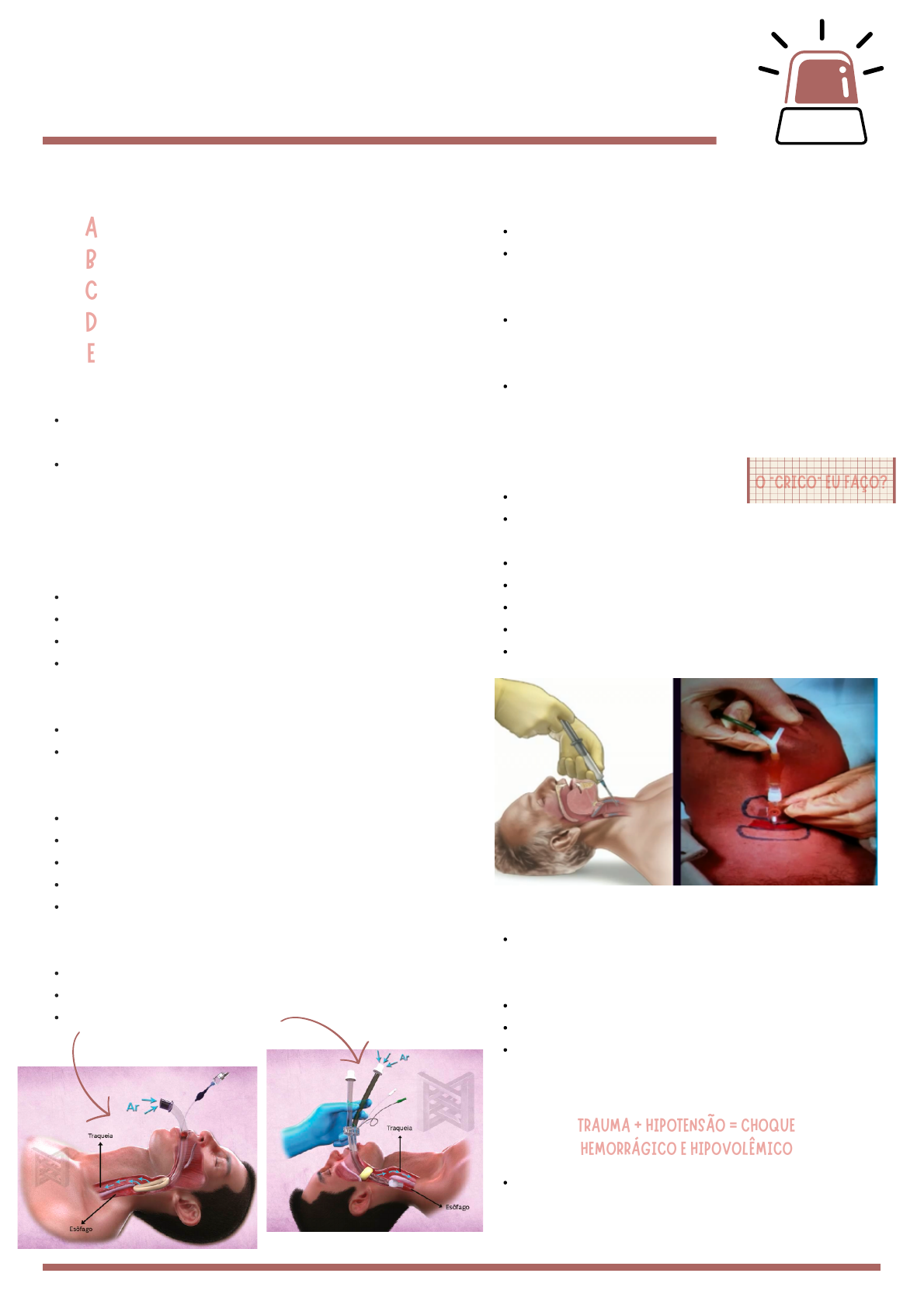 Visualização e exame físico Capnografia e RX tórax Máscara laríngea (ML) Combitubo (CT) Definitiva Cirúrgica Criança < 12 anos ou sufoco Tenporária 15 l/min (40 - 50 PSI) 1:4 segundos Máximo: 30 - 45 min (carbonarcose) 2º/3º anel traqueal Oferecer 02 (10 - 12 L/min) Ex. aparelho respiratório Oximetria de pulso Acesso venoso INTUBAÇÃO OROTRAQUEAL Avaliação do tubo Se não consigo intubar Temporária Não necessita de laringoscopia Temporária Se não tem ou não quero ML ou CT 1.Cricotireoidostomia cirúrgica 2.Cricotireoidostomia por punção 3.Traqueostomia B - RESPIRAÇÃO C - CIRCULAÇÃO + CONTROLE DA HEMORRAGIA Perifério (2x) Veia central, dissecação de safena, intra-ósseo Estabilizar a coluna cervical Via aérea Apneia Proteção VA Incapacidade de manter oxigenação TCE grave - Glasglow ≤ 8 Definitiva - protege a VA Temporária Protege a VA - balonete na traqueia Intubação orotraqueal (+ utilizada) Intubação nasotraqueal Cricotireoidostomia cirúrgica Traqueostomia Não protege a VA Cricotireoidostomia por punção Máscara laríngea e combitubo A - COLUNA CERVICAL + VIA AÉREA Colar + prancha + coxins Está pérvia? Fonação preservada? Sim - Oferecer O2 (10 - 12 L/min) VIA AÉREA ARTIFICIAL Indicações Tipos Definitiva Temporária O "CRICO" EU FAÇO?O "CRICO" EU FAÇO? Amanda Vieira Sampaio - Medicina UFMA PHO TRAUMA - ATENDIMENTO INICIAL 1º GARANTIR SUA SEGURANÇA AA BB CC DD EE Coluna cervical + Via aérea Respiração Circulação + controle da hemorragia Disfunção neurológica Exposição + controle do ambiente TRAUMA + HIPOTENSÃO = CHOQUETRAUMA + HIPOTENSÃO = CHOQUE HEMORRÁGICO E HIPOVOLÊMICOHEMORRÁGICO E HIPOVOLÊMICO Amanda Vieira Sampaio - Medicina UFMA PHO TRAUMA - ATENDIMENTO INICIAL Cristaloide (RL ou SF 0,9%) aquecido Estimativa de perda volêmica Até 1 litro e 20 ml/kg na criança Escala de coma de Glasglow; pupilas e extremidades Expor o paciente Controle da temperatura Extra-hospitalar Se exsanguinando: primeiro comprime D - DISFUNÇÃO NEUROLÓGICA E - EXPOSIÇÃO + CONTROLE DO AMBIENTE X-ABCDE (PHTLS 9ª Ed.) PA mínima para garantir a perfusão - não no TCE > 10 UI/24h ou > 4 UI/1h 1CH : 1P : 1CP Classe IV 1ª dose (1g) em 3 hrs e reforço (1g) em 8 hrs 0,5 ml/kg/h; Criança 1 ml/kg/h Sangue no meato uretral, retenção urinária, hematoma perineal, fratura de pelve - Não sondar Afastar lesão de uretra Uretrocistografia retrógada Comprimir feridas sangrantes Hipotensão permissiva Transfusão maciça Ácido tranexâmico - antifibrinolítico Diurese Controle da hemorragia