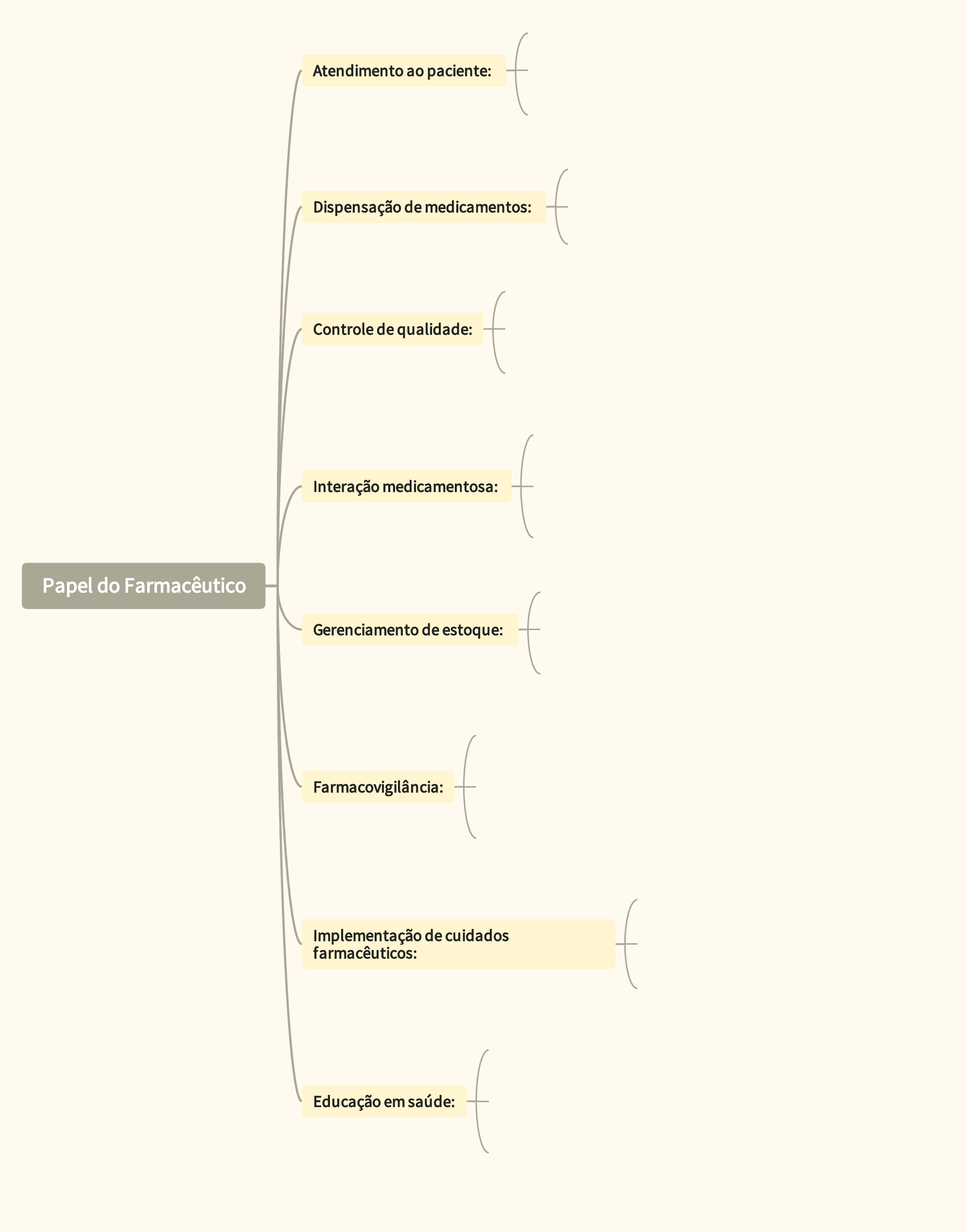 Papel�do�Farmacêutico Atendimento�ao�paciente: Dispensação�de�medicamentos: Controle�de�qualidade: Interação�medicamentosa: Gerenciamento�de�estoque: Farmacovigilância: Implementação�de�cuidados farmacêuticos: Educação�em�saúde: Orientação�sobre�o�uso�correto�do�medicamento; Esclarecimento�de�dúvidas�sobre�o�tratamento; Monitoramento�do�paciente�durante�o�uso�do medicamento. Realização�de�campanhas�de�prevenção�e conscientização�sobre�doenças�e�medicamentos; Orientação�para�promoção�da�saúde�e�prevenção�de doenças; Atividades�de�educação�continuada�para�outros profissionais�da�saúde. Verificação�da�qualidade�do�medicamento; Verificação�da�validade�do�medicamento; Fiscalização�do�armazenamento�adequado�do medicamento. Identificação�e�notificação�de�reações�adversas�a medicamentos; Tratamento�de�queixas�técnicas�(reclamações�de usuários�sobre�medicamentos); Participação�em�estudos�de�monitoramento�pós- comercialização. Acompanhamento�de�pacientes�com�doenças crônicas; Desenvolvimento�de�planos�individuais�de�cuidado; Avaliação�da�efetividade�do�tratamento�e�adaptação do�mesmo�quando�necessário. Controle�do�estoque�de�medicamentos; Verificação�do�prazo�de�validade�dos�medicamentos; Realização�de�pedido�de�medicamentos�para�a reposição�do�estoque. Identificação�de�possíveis�interações medicamentosas; Orientação�sobre�a�administração�conjunta�de medicamentos; Alerta�sobre�efeitos�adversos�e�possíveis�alterações na�terapia. Verificação�da�prescrição�médica; Preparação�e�rotulagem�do�medicamento; Armazenamento�adequado�do�medicamento.