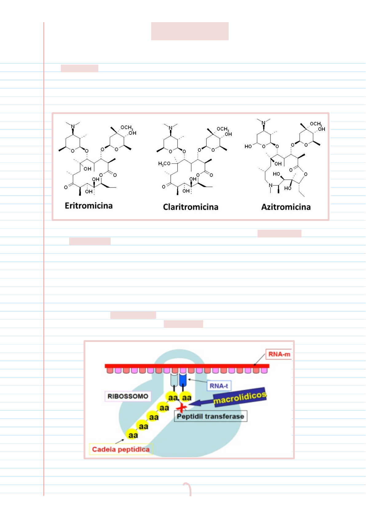 Eritromicina: é o macrolídeo mais antigo. Já foi considerada a única opção para tratamento em gram-positivos (Streptococcus sp e Staphylococcus sp) para pacientes alérgicos a beta- lactâmicos, mas hoje em dia já apresenta muita resistência • Todos os macrolídeos possual anel lactônico onde se ligam radicais que definem quimicamente o antibiótico • Atualmente os com efeito antimicrobiano mais eficaz são a Claritromicina e a Azitromicina (mais lipofílicos) • Mecanismo de ação Inibem a síntese proteica • Atuam na subunidades 50s impedindo a translocação (leitura dos códons de aminoácido ao longo do RNAm) • Como o sítio de ação é muito próximo do Clorafenicol, haverá competição- associação não benéfica • Eritromicina: bacteriostática• Azitromicina e Claritromicina: Bactericidas • Espectro de ação Staphylococcus aureus • Staphylococcus epidermis Macrolídeos Wednesday, September 30, 2020 3:27 PM Espectro de ação Staphylococcus aureus • Staphylococcus epidermis • Streptococcus (grupos A, B, C, F e G) • Streptococcus pneumoniae • Propioibacterium acne • Corynebacterium diphteria • Bordetella pertussis: coqueluche • Campylobacter jejuni • Helicobacter pylori• Moraxella catarrhalis • Haemophylus ducreyi • Neisseria gonorrhoaeae • Clamidia sp • Mycoplasma pneumoniae • Farmacocinética da azitromicina Facilmente absorvida • Utilização por via oral ou via endovenosa • A concentração em tecidos moles atinge valores superiores aos da claritromicina e até 100 vezes maior em relação a eritromicina • Essa difusão tecidual ocorre pela elevada lipofilia da azitromicina • Por ser muito lipofílica é utilizada no tratamento da acne, também • COVID: por sua rápida absorção e distribuição devido á lipofilicidade foi pensado em seu uso no tratamento da COVID, mas também é característico da Doxiciclina, não justificando o uso clínico. Outra justificativa utilizada seria uma imunomodulação causada pela azitromicina, que leva a uma melhora inicial com posterior piora do quadro imunológico (podem ocorrer infecções oportunistas). Interferência sob a resposta cardíaca: Prolongamento do intervalo QT que leva a uma possibilidade da ocorrência de uma arritmia cardíaca de alto risco de morte súbita (hidroxicloroquina também prolonga o intervalo QT) ○ • Indicações terapêuticas Acne • Trato respiratório inferior• Trato respiratório superior • Infecção genital por Chlamydia, Neisseria e Haemplhylus• Coqueluche (eritromicina) • Difteria (eritromicina) • Otite média • Reações adversas e contraindicações Hipersensibilidade • Hepatite colestática (eritromicina após 10-20 dias): náuseas, vômitos, cólicas abdominais, icterícia, febre, leucocitose • Gestantes: Risco C• Estratégias de resistência Produção de esterases: quebra dos esteres do anel lactônico • Modificação do sítio de ligação ribossômico • Redução da permeabilidade da membrana • Positivos Negativos Intra celular obrigatório Eritomicina é indicado por ser o menos usado, então as bactérias não teriam resistência Produção de metilase no sítio de ligação ribossômico: Alguns esteres estão ligados a metis, sendo assim, a metilase quebra essa ligação. Pode aparecer com resistência cruzada • RENAME Eritromicina • Espiramicina • Azitromicina: ISTs por Clhamydia trachomatis • Claritromicina: Streptococcus e Helicobacter pylori•