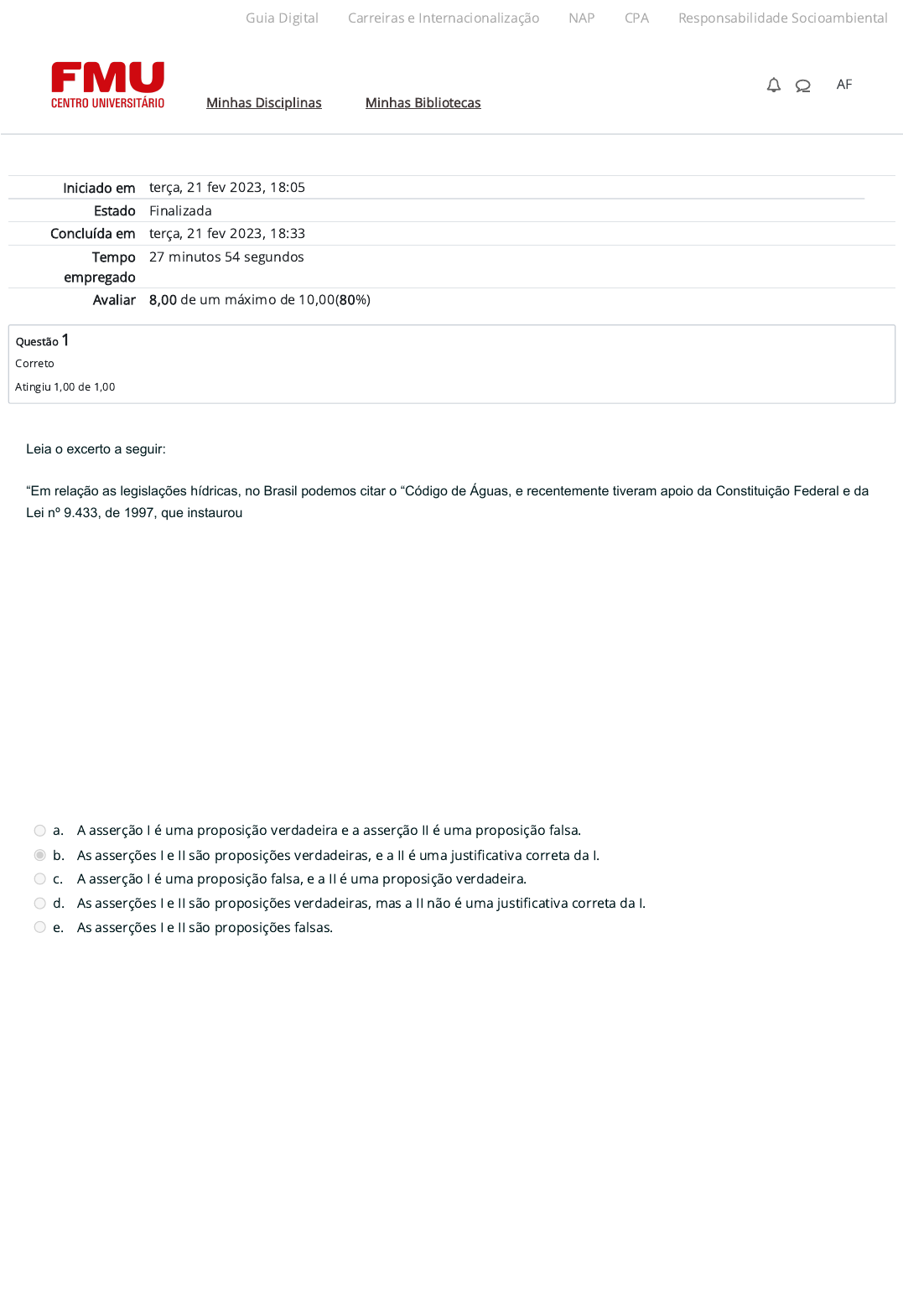 21/02/2023 18:33 Atividade 4 (A4): Revisão da tentativa https://ambienteacademico.com.br/mod/quiz/review.php?attempt=1770275&cmid=768454 1/6 Iniciado em terça, 21 fev 2023, 18:05 Estado Finalizada Concluída em terça, 21 fev 2023, 18:33 Tempo empregado 27 minutos 54 segundos Avaliar 8,00 de um máximo de 10,00(80%) Questão 1 Correto Atingiu 1,00 de 1,00 Leia o excerto a seguir: “Em relação as legislações hídricas, no Brasil podemos citar o “Código de Águas, e recentemente tiveram apoio da Constituição Federal e da Lei nº 9.433, de 1997, que instaurou a Política Nacional de Recursos Hídricos (PNRH) e o Sistema Nacional de Gerenciamento de Recursos Hídricos (Singreh), bem como da Lei nº 9.984, de 2000, que criou a Agência Nacional de Águas (ANA).” Fonte: SANTELLO, F. L. P. Direito tributário ambiental: recursos hídricos. Barueri, SP: Manole, 2017. p.13. Em relação a Lei nº 9.433 de 1997, considere as afirmações a seguir: I. A cobrança pelo uso de recursos hídricos, instituída pela Lei n. 9.433/1997, apesar de ter sido criada como se fosse um preço público, é tratada como taxa e possui natureza jurídica de tributo. DESTA FORMA II. A lei, no entanto, não contém os requisitos necessários à instituição de um tributo no ordenamento jurídico, o que vicia sua eficácia e impede a incidência da norma jurídica sobre o fato ocorrido, referente ao uso e consumo da água. A seguir, assinale a alternativa correta: a. A asserção I é uma proposição verdadeira e a asserção II é uma proposição falsa. b. As asserções I e II são proposições verdadeiras, e a II é uma justi�cativa correta da I. c. A asserção I é uma proposição falsa, e a II é uma proposição verdadeira. d. As asserções I e II são proposições verdadeiras, mas a II não é uma justi�cativa correta da I. e. As asserções I e II são proposições falsas. Guia Digital Carreiras e Internacionalização NAP CPA Responsabilidade Socioambiental Minhas Disciplinas Minhas Bibliotecas AF https://codely-fmu-content.s3.amazonaws.com/Moodle/GuiaDigital/Guia+digital/index.html https://informa.fmu.br/carreiras/ https://codely-fmu-content.s3.amazonaws.com/Moodle/NAP/inicial/nap/fmu/index.html https://codely-fmu-content.s3.amazonaws.com/Moodle/CPA/landing_CPA/index.html https://portal.fmu.br/sustentabilidade https://ambienteacademico.com.br/ https://ambienteacademico.com.br/ https://ambienteacademico.com.br/course/view.php?id=236 21/02/2023 18:33 Atividade 4 (A4): Revisão da tentativa https://ambienteacademico.com.br/mod/quiz/review.php?attempt=1770275&cmid=768454 2/6 Questão 2 Correto Atingiu 1,00 de 1,00 Questão 3 Incorreto Atingiu 0,00 de 1,00 Carlos Eduardo é produtor rural, e possui algumas cabeças de gado. Infelizmente, neste ano os índices pluviométricos ficaram muito abaixo da média, e devido a estiagem, houve grandes prejuízos econômicos ao produtor. Desta forma, ele teve a ideia de abrir um poço artesiano. Em relação a abertura de um poço artesiano, analise as questões a seguir: I. Deve ser solicitado a outorga de água. DESTA FORMA II. Deve-se recorrer ao órgão ambiental estadual, visto que águas subterrâneas são de competência estadual. A seguir, assinale a alternativa correta: a. As asserções I e II são proposições falsas. b. A asserção I é uma proposição falsa, e a II é uma proposição verdadeira. c. As asserções I e II são proposições verdadeiras, mas a II não é uma justi�cativa correta da I. d. As asserções I e II são proposições verdadeiras, e a II é uma justi�cativa correta da I. e. A asserção I é uma proposição verdadeira e a asserção II é uma proposição falsa. Compete à ANA outorgar, por intermédio de autorização, o direito de uso de recursos hídricos em corpos de água de domínio da União, bem como emitir outorga preventiva. Também é competência da ANA a emissão da reserva de disponibilidade hídrica para fins de aproveitamentos hidrelétri cos e sua consequente conversão em outorga de direito de uso de recursos hídricos. A Figura a seguir apresenta os instrumentos de implementação da Lei nº 9433/97, ou seja, da Política Nacional de Recursos Hídricos. Fonte: PINTO-COELHO, R. M.; HAVENS, K. Gestão de recursos hídricos em tempos de crise. Porto Alegre: Artmed, 2016, p. 191. Neste sentido, assinale a alternativa que refere-se respectivamente aos pontos 1 e 2: a. Alvará de uso e outorga. b. Licenciamento ambiental e Alvará de uso c. Cobrança pelo uso da água e licenciamento ambiental. d. Outorga de cobrança pelo uso da água e. Licenciamento ambiental e outorga de água Guia Digital Carreiras e Internacionalização NAP CPA Responsabilidade Socioambiental Minhas Disciplinas Minhas Bibliotecas AF https://codely-fmu-content.s3.amazonaws.com/Moodle/GuiaDigital/Guia+digital/index.html https://informa.fmu.br/carreiras/ https://codely-fmu-content.s3.amazonaws.com/Moodle/NAP/inicial/nap/fmu/index.html https://codely-fmu-content.s3.amazonaws.com/Moodle/CPA/landing_CPA/index.html https://portal.fmu.br/sustentabilidade https://ambienteacademico.com.br/ https://ambienteacademico.com.br/ https://ambienteacademico.com.br/course/view.php?id=236 21/02/2023 18:33 Atividade 4 (A4): Revisão da tentativa https://ambienteacademico.com.br/mod/quiz/review.php?attempt=1770275&cmid=768454 3/6 Questão 4 Correto Atingiu 1,00 de 1,00 Leia o excerto a seguir: “O monitoramento envolve o acompanhamento contínuo dos aspectos quantitativos e qualitativos das águas. É essencial para a implementação da Política Nacional de Recursos Hídricos, já que é central no desenvolvimento do Sistema Nacional de Informações de Recursos Hídricos (SNIRH), que constitui um dos instrumentos de gerenciamento estabelecidos na Lei nº 9.433/1997.” Fonte: SILVA, L. P. Hidrologia: engenharia e meio ambiente. 1 ed. Rio de Janeiro: Elsevier, 2015, p. 299. Existem diferentes instrumentos para o gerenciamento de recursos 