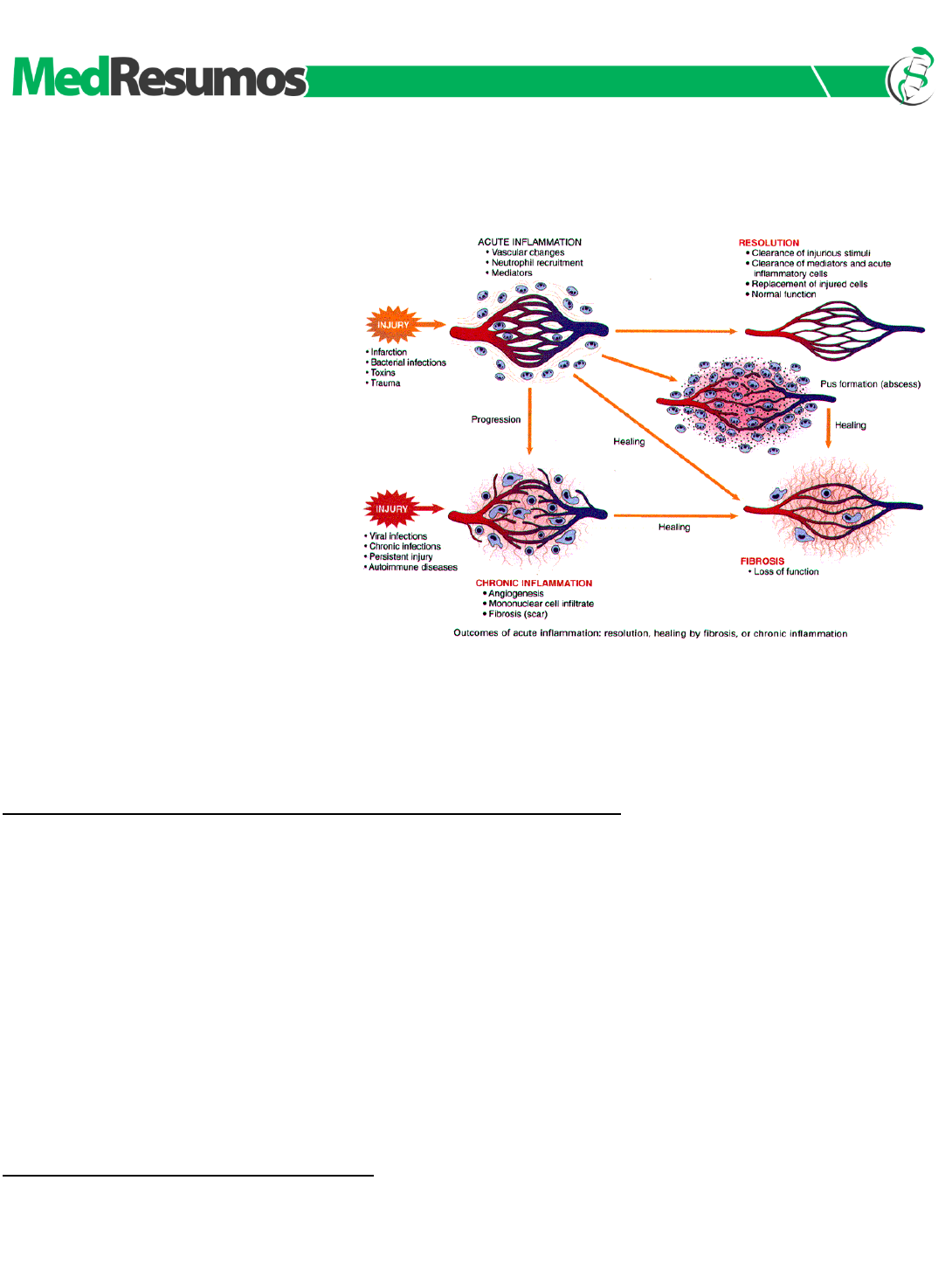 Arlindo Ugulino Netto ● MEDRESUMOS 2018 ● PATOLOGIA 1 @medresumosoficial INFLAMAÇÃO CRÔNICA A inflamação crônica é considerada um tipo de inflamação prolongada (semanas ou meses depois da instalação da inflamação aguda) na qual a destruição tissular e a tentativa de reparar os danos ocorrem simultaneamente. Para se entender a instalação da chamada fase crônica da inflamação, devemos descrever os possíveis destinos do processo inflamatório agudo: Resolução completa; Cicatrização pela substituição do tecido conjuntivo; Formação de abscesso (coleção localizada de secreção purulenta, constituída de tecido destruído, células inflamatórias e bactérias piogênicas); Progressão tecidual a inflamação crônica. Isso pode se seguir à inflamação aguda, ou a reposta pode ser crônica praticamente desde o início. A transição de aguda para crônica ocorre quando não há uma resolução da resposta inflamatória aguda devido à persistência do agente nocivo ou a alguma interferência com o processo normal de cicatrização. Apesar de poder ser a continuação de uma inflamação aguda, como descrito anteriormente, a inflamação crônica frequentemente começa de maneira insidiosa como uma reação pouco intensa, geralmente assintomática. Este último tipo de inflamação crônica é a causa de dano tecidual em algumas das doenças humanas mais comuns e debilitantes, como a artrite reumatoide, aterosclerose, tuberculose e as doenças pulmonares crônicas. CARACTERÍSTICAS DO PROCESSO INFLAMATÓRIO CRÔNICO Enquanto que o processo inflamatório agudo se caracteriza por eventos vasculares, formação de edema e presença marcante de neutrófilos no foco inflamatório, o processo inflamatório crônico apresenta particularidades que divergem da inflamação aguda: É desencadeado por um processo inflamatório agudo prévio não eficiente, de modo que o agente agressor ainda persista, desencadeando os mediadores que promovem a instalação da inflamação crônica; Os focos inflamatórios são caracterizados por infiltrados celulares mononucleares: linfócitos, macrófagos (chegam com cerca de 24 – 48h depois de instalado o processo inflamatório) e plasmócitos. Os eosinófilos, mastócitos e neutrófilos só surgem caso o agente agressor persista no processo lesivo. As concentrações de neutrófilos são muito menores quando comparadas às da inflamação aguda; Proliferação de fibroblastos e vasos sanguíneos (angiogênese); Aumento do tecido conjuntivo com deposição de colágeno e tecido fibrosado; Destruição tissular: o processo inflamatório, ao tentar debelar o agente agressor, passa a destruir por meio de suas enzimas o tecido da região onde o processo se instalou. É um processo específico (diferentemente da inflamação aguda que, mais primitiva filogeneticamente, é inespecífica) e mais sofisticado (envolvendo apresentações antigênicas e mais outras reações características da resposta imune adaptativa). CAUSAS DA INFLAMAÇÃO CRÔNICA A inflamação crônica surge nas seguintes situações: Nas infecções persistentes por determinados micro-organismos, como o bacilo da tuberculose, o Treponema pallidum (causador da sífilis) e determinados vírus, fungos e parasitas. A exposição prolongada a agentes potencialmente tóxicos e nocivos, sejam eles endógenos ou exógenos. Um exemplo de agente exógeno é a sílica, material não-degradável que, quando inalado por longos períodos, causa Arlindo Ugulino Netto. PATOLOGIA 2018 Arlindo Ugulino Netto ● MEDRESUMOS 2018 ● PATOLOGIA 2 @medresumosoficial uma doença pulmonar inflamatória conhecida como silicose. A aterosclerose é considerada uma doença inflamatória crônica da parede arterial induzida por componentes endógenos (lipídios tóxicos do plasma). Autoimunidade (como é o caso das doenças autoimunes). Nessas doenças, os auto-anticorpos desencadeiam uma reação imunológica que se autoperpetua, causando lesão tecidual e inflamação crônicas. Como exemplo: artrite reumatoide e o lúpus eritematoso. INFILTRADO CELULAR MONONUCLEAR O macrófago é a célula dominante na inflamação crônica (enquanto que na inflamação aguda, é o polimorfonuclear neutrófilo), sendo acompanhado, logo então, por linfócitos e plasmócitos. MACRÓFAGOS Os macrófagos são um dos componentes do sistema fagocitário mononuclear. Este consiste de células intimamente relacionadas que se originam na medula óssea, incluindo monócitos sanguíneos e macrófagos tissulares. De uma forma geral, os monócitos e os macrófagos são a mesma célula, porém os monócitos estão localizados no sangue, ao passo em que os macrófagos, nos tecidos: os macrófagos são derivados dos monócitos do sangue periférico que foram induzidos a migrar através do endotélio por agentes químicos (C5a, fibrinopeptídios, citocinas, FCDP – fator de crescimento derivado de plaquetas, etc.). Eles estão difusamente espalhados no tecido conjuntivo ou localizados em órgãos como o fígado (células de Kupffer), baço, linfonodos, sistema nervoso central (micróglia), alvéolos pulmonares e ossos (osteoclastos). A meia vida dos monócitos sanguíneos é de cerca de 1 dia, enquanto um macrófago tissular sobrevive por vários meses ou anos. Como discutido anteriormente, os monócitos começam a migrar para os tecidos extravasculares logo no início da inflamação aguda e, em 48 horas, podem constituir o tipo celular predominante. O extravasamento dos monócitos também é governado por moléculas de adesão e mediadores químicos quimiotáticos e de ativação. Quando o monócito chega ao tecido extravascular, transforma-se em uma célula fagocitária maior, o macrófago. Os macrófagos podem ser ativados por uma variedade de estímulos, incluindo as citocinas (INF-γ, por exemplo) secretadas pelos linfócitos T ativados e pelas células NK. Os macrófagos ativados secretam uma variedade de produtos biol
