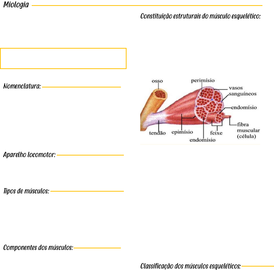 - Quando os seres vivos passaram a ser multicelulares : as células se especializaram em funções distintas (respiração, digestão, excreção entre outras). As células musculares são especializadas na contração e no relaxamento do músculo. Distribuído no corpo: pares e ímpares. Grego – Mys/Myós = músculos Logia = estudo Latim – Mus ”ratinho” O efeito da contração muscular sobre a pele aparenta-se com o correr de um. Ossos e articulações – passivos Músculos – ativos - Esquelético: contração rápida e voluntária. - Cardíaco: contração involuntária, vigorasa e rítmica. - Liso: contração involuntária e lenta. Porção média: - Ventre muscular: constituído por fibras musculares. Extremidades: - Tendões (cilindóides/fitas) - Aponeuroses (laminares) São esbranquiçados e brilhantes, muito resistente e praticamente inextensível, constituídos por tecido conjuntivo denso, rico em fibras colágenas. - Endomísio: Envoltório externo ao sarcolema, envolve uma fibra muscular. - Perimísio: evolve externamente os feixes de fibras. - Epimísio: revestimento externo dos fascículos. Um feixe de fibras está envolto externamente de perimísio, contém um feixe de fibras musculares que caracteriza um fascículo. - A fibra muscular contém miofibrilas. O sarcolema envolve as miofibrilas. Origem e inserção muscular: - Origem: Extremidade do músculo presa à peça óssea que não se desloca. (Extremidade proximal). - Inserção: Extremidade do músculo presa à peça óssea que se desloca. (Extremidade distal). 1. Quanto ao úmero de tendões de origem (cabeça). - Bíceps: apresenta 2 tendões de origem. Ex: M. Bíceps braquial. - Tríceps: apresenta 3 tendões de origem. Ex: M. tríceps braquial. - Quadríceps: apresenta 4 tendões de origem. Ex: M. Quadríceps femoral. 2. Quanto ao número de tendões de inserção (cauda). - Bicaudado: quando apresenta 2 tendões de inserção. Ex: M. Supraespinhoso. - Policaudado: quando apresenta 3 ou mais tendões de inserção. Ex: M. Flexor digital superficial. 3. Quanto ao número de ventres musculares: - Digástricos: apresenta 2 ventres musculares. Ex: M. Digástrico. - Poligástricos: apresenta mais de 2 ventres musculares. Ex: M. Reto do abdome. - Posição do músculo no esqueleto: Intercostal, nasal, peitoral e etc. - Forma: trapézio, piriforme, serrátil, Deltóide e etc. - Direção das fibras: reto, oblíquo, transverso e etc. - Ação: Flexor, extensor, adutor, elevador e etc. 1. Quanto a dimensão das fibras: - M. Longos: predomina o comprimento das fibras. Ex: M. Flexor digital superficial. - M. largos: O comprimento e a largura equivalem-se. Ex: M. oblíquo do abdome. - M. Curtos: são pequenos. Ex: M. intercostal interno. 2. Quanto a disposição das fibras musculares. - Paralelas: • Músculos longos: M. Extensor comum dos dedos. • Músculo largos: M. Oblíquo interno do abdome. • Músculos fusiformes: M. Bíceps do braço. 3. Quanto à disposição das fibras musculares: - Oblíquas: • Unipenado: M. Extensor oblíquo do carpo. • Bipenado: M. Extensor digital comum. • Multipenado: M. Subescapular. Parte caudal do M. Digástrico Parte rostral do M. Digástrico - Flexores: Divisão flexora. (M. Flexor radial do carpo). - Extensores: Divisão extensora. (M. Extenso carpo radial). - Adutores: M. Subescapular. - Abdutores: M. Infraespinhoso. - Esfíncter, dilatador, elevador, depressor, rotator (supinação e pronação). - Agonista: O músculo é o agente principal na execução do movimento. - Antagonista: Quando um músculo se opõe ao trabalho de um agonista, seja para regular a rapidez ou a potência de ação desse agonista. - Sinergista: Quando o músculo atua em conjunto com outros para executar um mesmo movimento. Fixadores: Estabilizam uma articulação. - Osso - Cartilagem - Cápsulas articulares - Septos intermusculares - Derme - Tendões de outros músculos - A contração do ventre muscular produz deslocamento de um segmento do corpo. O Ventre muscular não se prende ao esqueleto. - As extremidades do músculo prendem-se em pelo menos dois ossos, de maneira que o músculo cruza a articulação. - As fibras musculares esqueléticas têm o citoplasma repleto de filamentos longitudinais muito finos (as miofibrilas), constituídas por microfilamentos das proteínas actina e miosina. As unidades de actina e miosina que se repetem ao longo da microfibrila são chamadas de sarcômeros. A contração muscular se dá pelo deslizamento dos filamentos de actina sobre os de miosina. Essa ideia é conhecida como teoria do deslizamento dos filamentos. - Constituição: Água (75%) Proteínas (18%) Carboidratos, gorduras e sais minerais e outros (7%) - Fibras musculares estriadas: Vermelha: Contração lenta, mioglobina alta, metabolismo aeróbico, tempo de contração longo, grande resistência a fadiga, força contrátil baixa. - Função: manutenção da postura e em exercício de baixa intensidade. Ex: corredores de longas distâncias. Brancas: Contração rápida, mioglobina baixa, metabolismo anaeróbico, tempo de contração curto, resistência a fadiga menor, força contrátil alta. - São observadas em altas proporções em atletas corredores de curtas distâncias. Ex: saltos, corridas e outros movimentos. Varia de acordo: - Genética: tempo de repouso e o tipo de treinamento ao qual o animal é submetido, variável de acordo com o tipo de esforço exigido do animal. - Espécie animal: (equina +500 músculos) Quase todos os músculos são pares, exceto o músculo diafragma, orbicular da boca e o esfíncter anal. - M. dos membros torácicos. - M. dos membros pélvicos. - M. do cíngulo escapular. - M. da face e do pescoço. - M. sublombares. - Músculos torácicos.