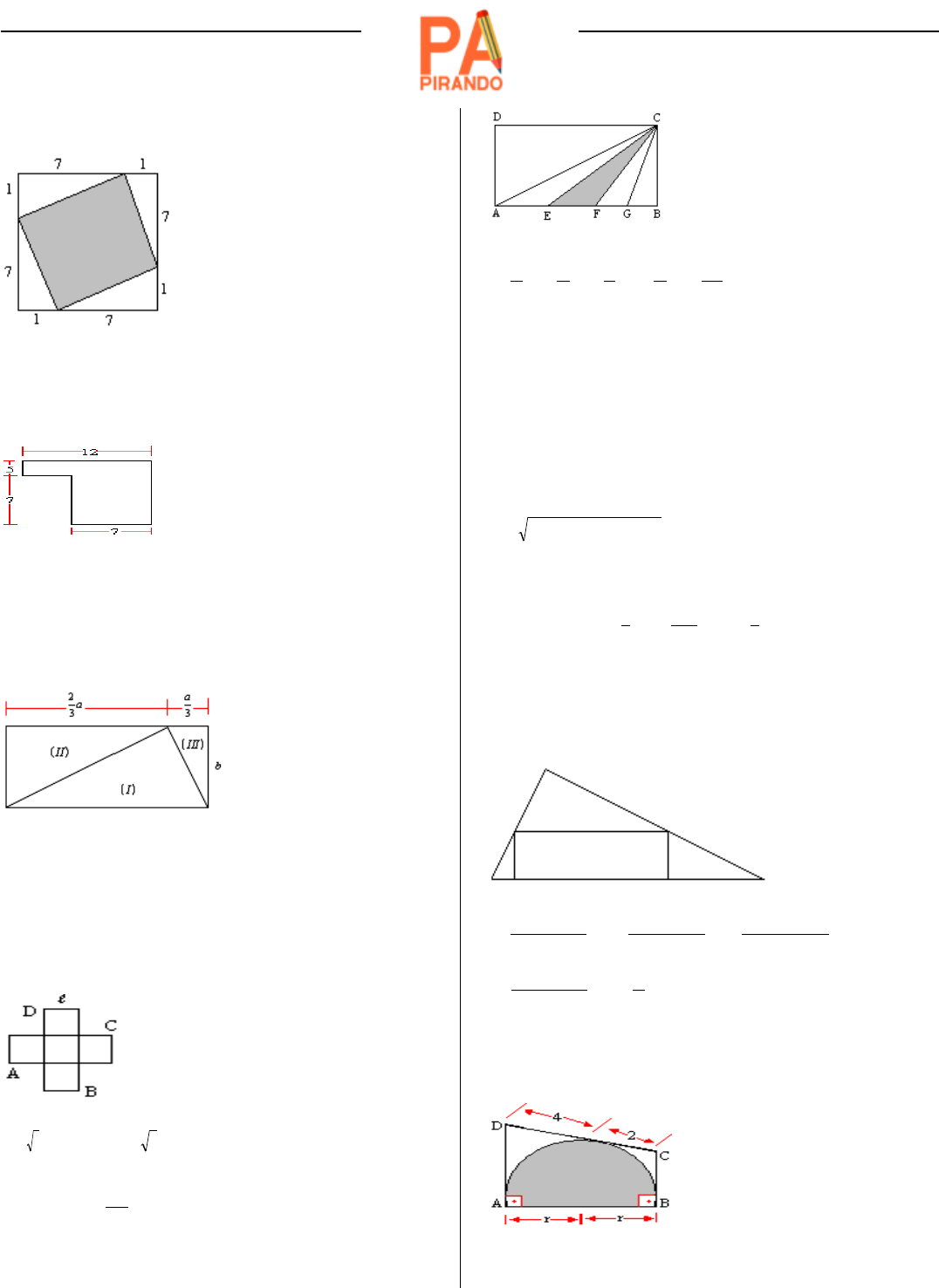 1 PROFESSOR: Igor Profeta 1) A área do quadrado sombreado é: a) 36 b) 40 c) 48 d) 50 e) 60 2) Qual o valor da área da figura? a) 95 b) 144 c) 169 d) 119 e) 109 3) No retângulo de dimensões a e b, são consideradas as áreas das regiões (I), (II) e (III). Então: a) área I a b b) área (II) + área (III) = área (I) c) área (II) + área (III) > área (I) d) área (II) + área (III) = a b 4) Cinco quadrados de lado formam a cruz da figura. A área do quadrilátero convexo de vértices A, B, C e D é: a) 2 5 2 b) 4² c) 4 3 2 d) 5² e) 6² 5) O quadrilátero ABCD é um retângulo e os pontos E, F e G dividem a base AB em quatro partes iguais. A razão entre a área do triângulo CEF e a área do retângulo é: a) 1 6 b) 1 7 c) 1 8 d) 1 9 e) 1 10 6) Os lados de um retângulo de área 12m² estão na razão 1:3. Qual o perímetro do retângulo? a) 8 m b) 12 m c) 16 m d)20 m e) 24 m 7) A área de um triângulo de lados a, b e c é dada pela fórmula S p p a p b p c onde p é o semiperímetro 2p a b c . Qual a área de um triângulo de lados 5,6 e 7? a) 15 b) 21 c) √ d) √ e) √ 8) A base de um triângulo e a altura relativa a essa base medem, respectivamente, b e h. Um retângulo de altura x é inscrito no triângulo, sendo que sua base está contida na base desse triângulo. A área do retângulo, em função de b, x e h, é: a) hx b x b b) bx h x h c ) bx h x h 2 d) bx h x h e) 1 4 9) A área do trapézio da figura é 12. A área da parte sombreada é: a) b) 2 c) 3 d) 4 e) 5 2 PROFESSOR: Igor Profeta 10)Quatro círculos de raio unitário, cujos centros são vértices de um quadrado, são tangentes exteriormente dois a dois. A área da parte sombreada é: a) 2 3 b) 3 2 c) 2 d) 4 e) 5 11)Na figura abaixo ABC é um triângulo eqüilátero de lado igual a 2 são arcos de circunferências com centros nos vértices A, B e C, respectivamente, e de raios todos iguais a 1. A área da região sombreada é: a) 3 3 4 b) 3 2 c) 2 3 2 d) 4 3 2 e) 8 3 3 12) A região sombreada R da figura é limitada por arcos de circunferência centrados nos vértices do quadrado de lado 2. A área de R é: a) ² 2 b) 2 2 ² c) 4 3 ² d) 4 ² e) 2 ² 13)No livro intitulado “Elementos”, do matemático grego Euclides de Alexandria (300 a.C), há um quadrado de lado a, a partir do qual Euclides procura encontrar a área de outro quadrado, destacado em cinza, na figura a seguir. Desse modo, a área do quadrado destacado em cinza na figura é obtida pela expressão: a) a 2 = (a – b) 2 + 2ab b) a 2 = (a – b) 2 – 2ab c) (a – b) 2 = a 2 + b 2 – 2ab d) (a + b) 2 = a 2 + b 2 + 2ab 14) TEXTO: 1 - Comum à questão: 26 Uma arquiteta projetou a construção de uma piscina em formato circular. Em seu projeto, ela inscreveu um círculo em um quadrado com lados de 20 cm, como mostra a figura. Escala 1:100 Com base nos dados apresentados, a área pintada na figura, em cm 2 , é igual a a) 200 - 100 . b) 200 - 200 . c) 400 - 100 . d) 400 - 200 . e) 400 - 400 . 15) Sobre o plano cartesiano a seguir, encontra-se a logomarca de uma empresa do Tocantins dada pela figura hachurada. Considerando-se que a unidade dos eixos é dada em centímetros, qual é a área total da logomarca? a) (1 + ) cm 2 b) (2 + ) cm 2 c) (1 + 4 ) cm 2 d) (2 + 4 ) cm 2 16) A medida da área do hexágono regular da figura abaixo é cm 2 . As diagonais AD e BE definem dois losangos congruentes e simétricos inscritos no hexágono. Sabendo-se que as diagonais AD e BE medem 8 cm, assinale a alternativa correta que corresponde à área ocupada pelos losangos. a) cm 2 b) cm² c) cm 2 d) cm 2 e) cm 2 324 316 38 3 316 318 36 3 PROFESSOR: Igor Profeta 17) Considere os pontos da malha quadriculada da figura. Se a soma das áreas dos polígonos indicados em vermelho é igual a 16 cm 2 , então a medida do segmento de reta indicado em verde é igual a a) b) c) d) 18) O terreno mostrado na figura abaixo, cujas medidas estão expressas em metros, foi dividido em dois lotes de mesma área. A medida x, em metros, é igual a: a) 11 b) 12 c) 13 d) 14 e) 15 19) A figura abaixo mostra um quadrado ABCD que é formado de um quadrado limitado por 4 retângulos iguais. O perímetro de cada retângulo é 60 cm. Qual é a área, em cm 2 , do quadrado ABCD? a) 600 b) 800 c) 900 d) 950 e) 980 20) Uma folha retangular de 48 cm de comprimento foi dividida em 12 partes retangulares e iguais, conforme o modelo a seguir. Qual é, em cm 2 , a área de cada parte? a) 60 b) 72 c) 144 d) 160 e) 192 21) A área da figura destacada em rosa é 28 cm 2 , e seus vértices dividem os lados do quadrado em três partes iguais. Qual é a área do quadrado? a) 34 cm 2 b) 36 cm 2 c) 38 cm 2 d) 40 cm 2 e) 42 cm 2 22) No quadrilátero ABCD a seguir, A B̂ C=150°, AD=AB=4cm, BC=10cm, MN=2cm, sendo M e N, respectivamente, os pontos médios de CD e BC. A medida, em cm 2 , da área do triângulo BCD é: a) 10. b) 15. c) 20. d) 30. e) 40. 23) Seja o octógono EFGHIJKL inscrito num quadrado de 12cm de lado, conforme mostra a figura a seguir. Se cada lado do quadrado está dividido pelos pontos assinalados em segmentos congruentes entre si, então a área do octógono, em centímetros quadrados, é: a) 98. b) 102. c) 108. d) 112. e) 120. 24) ABCD é um paralelogramo e M é o ponto médio do lado AB. As retas CM e BD dividem o paralelogramo em quatro partes. Se a área do paralelogramo é 24, as áreas de I, II, III e IV são, respectivamente, iguais a: a) 10, 8, 4 e 2. b) 10, 9, 3 e 2. c) 12, 6, 4 e 2. d) 16, 4, 3 e 1. e) 17, 4, 2 e 1. 25) No triângulo ABC, AC = 5cm, BC=20cm e cos =3/5. O maior valor possível, em cm 2 , para a área do retângulo MNPQ, construído conforme mostra a figura a seguir, é: a) 16 b) 18 c) 20 d) 22 e) 24 26) Um triângulo tem lados 20, 21 e 29. O raio da circunferência a ele circunscrita vale: a) 8 b) 8,5 c) 10 d) 12,5 e) 14,5 cm 4 23 cm 24 cm 4 33 cm 3 24 4 PROFESSOR: Igor Profeta 27) O polígono a seguir, em forma de estrela, tem todos os lados iguais a 1cm e todos o