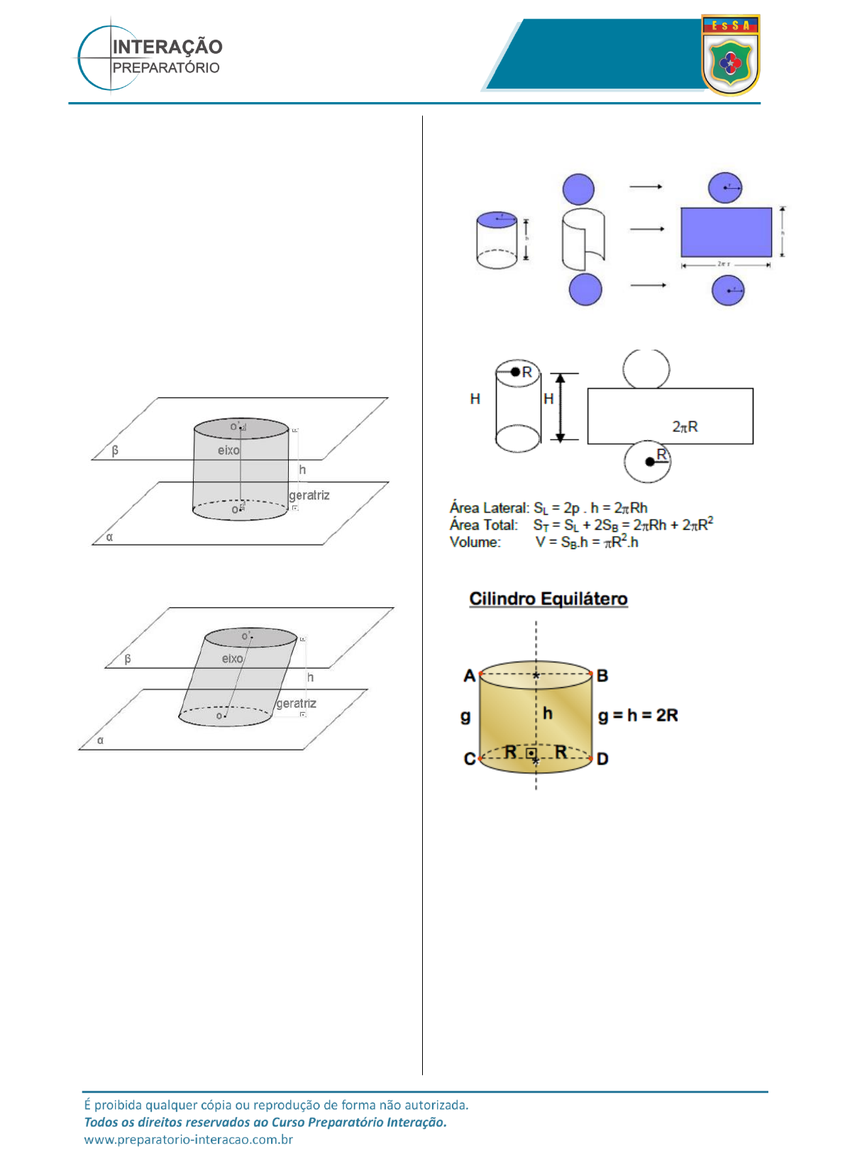 EQUIPE OS CONTÍNUOS MATEMÁTICA AULA 43 CILINDRO Consideremos um círculo de Centro O e raio r num plano 𝛼, e outro círculo semelhante a este num plano 𝛽, consideremos segmentos de retas congruentes e paralelos com extremidades nos dois círculos. A reunião de todos esses segmentos é um sólido chamado cilindro. Cilindro reto Cilindro oblíquo PLANIFICAÇÃO DO CILINDRO RETO EXERCÍCIOS: EQUIPE OS CONTÍNUOS MATEMÁTICA AULA 43 1) Calcule a medida da área de um cilindro circular reto, sabendo que o raio da base mede 4 cm e a geratriz 10. 2) O raio de um cilindro circular reto mede 3cm e a altura 3cm. Determine a área lateral desse cilindro. 3) Qual a altura de um reservatório cilíndrico, sendo 150m o raio da base e 900π m² sua área lateral. 4) Determine a área lateral de um cilindro equilátero, sendo 15 cm a medida de sua geratriz. 5) Um cone circular reto de altura 3√2cm tem volume igual a 18√2 cm³. O raio da base desse cone, em centímetros, mede: a) 2. b) 2√2 . c) 3. d) 3√2 . 6) Dispõe-se de N tubos cilíndricos, todos iguais entre si, cada qual com diâmetro interno de 4 cm. Se esses tubos transportam a mesma quantidade de água que um único tubo cilíndrico, cujo diâmetro interno mede 12 cm e cujo comprimento é igual ao dobro do comprimento dos primeiros, então: a) N 15 b) 10 N 15 c) 6 N 10 d) N 6 7) Um galão de vinho de formato cilíndrico tem raio da base igual a 2m e altura 3m. Se 40% do seu volume está ocupado por vinho, é CORRETO afirmar que a quantidade de vinho existente no galão é: a) 3.768 litros. b) 37.680 litros. c) 18.840 litros. d) 1.507 litros. e) 15.072 litros. 8) Uma fábrica brasileira de exportação de peixes vende para o exterior atum em conserva, em dois tipos de latas cilíndricas: uma de altura igual a 4 cm e raio 6 cm, e outra de altura desconhecida e raio de 3 cm, respectivamente, conforme figura. Sabe-se que a medida do volume da lata que possui raio maior, V1, é 1,6 vezes a medida do volume da lata que possui raio menor, V2. A medida da altura desconhecida vale a) 8 cm. b) 10 cm. c) 16 cm. d) 20 cm. e) 40 cm. 9) Para resolver o problema de abastecimento de água foi decidida, numa reunião do condomínio, a construção de uma nova cisterna. A cisterna atual tem formato cilíndrico, com 3 m de altura e 2 m de diâmetro, e estimou-se que a nova cisterna deverá comportar 381m de água, mantendo o formato cilíndrico e a altura da atual. Após a inauguração da nova cisterna a antiga será desativada. Utilize 3,0 como aproximação para .π Qual deve ser o aumento, em metros, no raio da cisterna para atingir o volume desejado? a) 0,5 b) 1,0 c) 2,0 d) 3,5 e) 8,0 10) A figura a seguir representa a vista de cima de uma cisterna cilíndrica. Os pontos A e B indicam os locais de abastecimento, diametralmente opostos, e o ponto X mostra EQUIPE OS CONTÍNUOS MATEMÁTICA AULA 43 a posição de uma pessoa que se encontra a 6m de A e a 8m de B. Sabendo-se que a profundidade da cisterna é de 2 m, qual a sua capacidade máxima? (Considere 3)π a) 14.000 litros. b) 48.000 litros. c) 100.000 litros. d) 150.000 litros. e) 300.000 litros. 11) Um artesão fabrica vários tipos de potes cilíndricos. Mostrou a um cliente um pote de raio de base a e altura b. Esse cliente, por sua vez, quer comprar um pote com o dobro do volume do pote apresentado. O artesão diz que possui potes com as seguintes dimensões: - Pote I: raio a e altura 2b - Pote II: raio 2a e altura b - Pote III: raio 2a e altura 2b - Pote IV: raio 4a e altura b - Pote V: raio 4a e altura 2b O pote que satisfaz a condição imposta pelo cliente é o a) I. b) II. c) III. d) IV. e) V.
