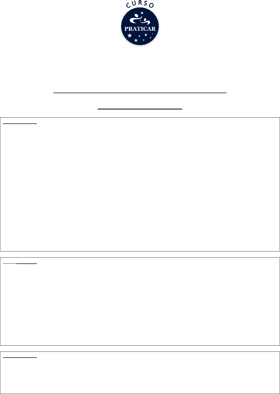 Curso Praticar Simulado ESA S4 – 27/05/2018 ESCOLA DE SARGENTO DAS ARMAS SIMULADO AOS CURSOS DE FORMAÇÃO DE SARGENTOS QUESTÕES DE PORTUGUÊS QUESTÃO 01: Analise os exemplos que seguem evidenciando a figura de linguagem caracterizada pelos mesmos: I “Amor é fogo que arde sem se vê; É ferida que dói e não se sente; É um contentamento descontente; [...] II “É nunca contentar-se de contente; É um cuidar que ganha em se perder”; [...] III Proferiu um milhão de palavras tentando convencer-me de que tinha razão. IV “A excelente Dona Inácia era mestra na arte de judiar de crianças.” A sequência correta de figuras de linguagem empregadas é: A) Paradoxo; antítese; hipérbole; ironia. B) Ironia, barbarismo, hipérbole, ironia. C) Eufemismo, catacrese, hipérbole, ironia D) Metonímia, antítese, hipérbole, ironia E) Paradoxo, catacrese, hipérbole, eufemismo QUESTÃO 02: Texto Quando vemos TV, lemos revistas ou navegamos na internet, costumamos encontrar anúncios que encorajam o exercício mental. Diversos programas de exercício cerebral estimulam a agilidade mental das pessoas, dando-lhes treinamento diário – executar tarefas que vão desde memorizar listas e solucionar quebra-cabeças até calcular o número de árvores de um parque. Isso pode parecer um recurso publicitário, mas, na realidade, tem embasamento real na neurobiologia. Pesquisas recentes, embora feitas principalmente com ratos, indicam que o aprendizado potencializa a sobrevivência de novos neurônios no cérebro adulto. E quanto mais desafiador for o problema, maior o número de neurônios envolvidos no processo. Acredita-se que esses neurônios estão disponíveis para ajudar em situações em que a mente é sobrecarregada. Parece que o treinamento mental fortalece o cérebro da mesma maneira que o exercício físico modela os músculos. (…) “Revista Scientific American” – Edição Especial – Nº 40 – p.63. Há o predomínio no texto do sujeito: A) oculto B) simples C) composto D) indeterminado E) indigesto QUESTÃO 03: A palavra tráfico não dever ser confundida com tráfego, seu parônimo. Em que item a seguir o par de vocábulos é exemplo de homonímia e não de paronímia? A) estrato / extrato B) flagrante / fragrante C) eminente / iminente D) inflação / infração E) cavaleiro / cavalheiro SIMULADO ESA – CURSO PRATICAR PROVAS DE MAT/PORT/HIST/GEO 2 QUESTÃO 04: Assinale a alternativa em que todas as proposições apresentam ambiguidade: I. O Avaí venceu o Figueirense jogando em casa. II. O pai viu o incêndio do prédio. III. No momento, meu sentimento é de desolação. IV. Vi uma foto sua no aeroporto. V. Vi com meus próprios olhos a terrível cena do acidente aéreo. A) II, III, V B) III, IV, V C) II, III D) I, II, IV E) II, IV, V QUESTÃO 05: Indique a alternativa cuja sequência de vocábulos apresenta, na mesma ordem, o seguinte: ditongo, hiato, hiato, ditongo. A) jamais / Deus / luar / daí B) joias / fluir / jesuíta / fogaréu C) ódio / saguão / leal / poeira D) quais / fugiu / caiu / história E) cantar / luar / ímpeto / beleza QUESTÃO 06: Nas orações “A poetisa está emocionada” e “Ela está à janela”, os predicados classificam-se, respectivamente, como: A) verbal e verbal. B) nominal e nominal. C) verbo-nominal e verbo-nominal. D) verbal e nominal. E) nominal e verbal. QUESTÃO 07: "A arte _______________ é a expressão das contradições e do conflito espiritual do homem da época.", qual a alternativa que completa corretamente a lacuna? A) clássica B) barroca C) romântica D) árcade E) parnasiana QUESTÃO 08: Observe o vocábulo grifado na seguinte frase: “Há duas contribuições fundamentais nesse encontro: uma mestiçagem do corpo e uma mestiçagem da cultura.” Assinale a alternativa em que a palavra destacada foi empregada com esse mesmo sentido. A) Há de haver várias reclamações desse tipo. B) Não a vejo há dias. C) Há um ano esperamos notícias. D) Há horas ouço a mesma história. E) Ela há de chegar no horário. QUESTÃO 09: Sobre as obras e os autores do Realismo-Naturalismo no Brasil é correto afirmar que: A) o principal autor desse período é Adolfo Caminha que trabalhou dentro de uma linha realista mais definida. B) Raul Pompeia é um autor significativo dessa época, porém suas obras mostram apenas traços impressionistas. C) a parte mais significativa da obra de Machado de Assis é representada por seus romances e contos. D) o teatro dessa época teve muitos adeptos dentre os quais podemos citar José de Alencar. E) Aluizio Azevedo e Machado de Assis produziram obras numa linha naturalista bem definida. QUESTÃO 10: Assinale a alternativa em que o verbo “haver” NÃO está empregado corretamente. A) Hão de existir sonhos nas estações de trem. B) Há de haver vida em planetas distantes. C) No futuro, haverão naves espaciais viajando para estrelas. SIMULADO ESA – CURSO PRATICAR PROVAS DE MAT/PORT/HIST/GEO 3 D) Não houve dúvidas: viajamos de trem para as estrelas. E) Os viajantes da estação de trem não hão de partir sem comer sonhos. QUESTÃO 11: “Não era um craque, mas sua perda desfalcaria o time”. No trecho, a segunda oração é, na gramática normativa, uma oração: A) subordinada substantiva. B) coordenada assindética. C) subordinada adjetiva. D) coordenada sindética. E) subordinada adverbial. QUESTÃO 12: A expressão “dias de cão” só não se refere: A) a dias tipicamente escaldantes atualmente. B) à série de fatos vinculados à corrosão social e citados no texto. C) à época de temperaturas inclementes. D) à influência maligna da constelação de Cão Maior. E) ao verão de 2013-2014. QUESTÕES DE MATEMÁTICA QUESTÃO 13: Uma rede social dobra o número de usuários a cada dia. Uma função que pode dar o número de usuários desta rede em função do número de dias é: A) B) C) D) E) QUESTÃO 14: Sabendo que determine o valor de A) B) C) D) E) QUESTÃO 15: Se então