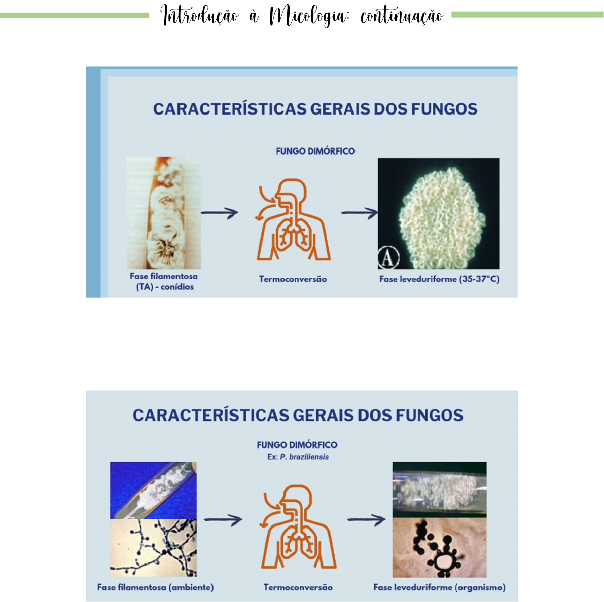 Algumas espécies são capazes de se mutar a partir de temperaturas mais altas. Dimórfico (pleomórfico) = muda suas características Mudam totalmente seu corpo Fissão == invaginação de parede Brotamento = evaginação de parede É um tipo de produção = os conídios (esporos) estão nos conidióforos Pode sair direto da hifa, pelo conidióforo ou pelo esporangióforo, Duas estruturas distintas de fungos se fecundam e acontece a plasmogamia (fusão) e cariogamia (fissão dos núcleos) e meiose reducional = variabilidade genética Grampo de conexão = cariofase (dois núcleos no mesmo compartimento ao mesmo tempo) Somatogomia = basidiomicota Copulação gametangial = forma uma 3ª célula (zigoto) = zigomicota Contato gamentangial = masculino passa pro feminino = transferência = ponto de contato ou tubo Copulação planogamética = isogamia, literogamia, heterogamia... mais comum fungos aquáticos Basídios = dentro deles maduros ocorre a cariogamia e a meiose Ascos formam sacos = 16 esporos sexuais Pó preto = esporos Ascos = estrutura de reprodução Existem uma quantidade de esporos incalculáveis que os fungos podem reproduzir Amerosporos = sem septos Dimisporos = 2 septos Helicosporos = septos em forma de espiral Estaurosporos = formato de estrela Fungo aquático = fase da vida com flagelo (esporo) Muito abundantes Fungo preto Esporangiosporo de origem sexuada Cadeia de ascos contendo ascosporos É o mais evoluído Podem substituir a proteína da carne Radiotrópicos = biorremediação