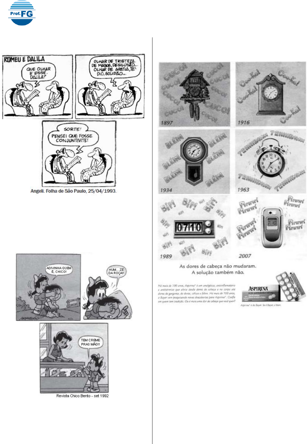 D5 - Interpretar texto com o auxílio de material gráfico diverso (propagandas, quadrinhos, foto etc.) 1 (Prova Brasil). Leia o texto abaixo: Leia o texto abaixo: A atitude de Romeu em relação a Dalila revela: (A) compaixão. (B) companheirismo. (C) insensibilidade. (D) revolta. ------------------------------------------------------------ Leia a tirinha e responda a questão. No segundo quadrinho, chico Bento diz: “Hum... Zé da Roça!” indica (A) duvida (B) irritação (C) raiva (D) curiosidade ------------------------------------------------------------ Leia o texto e responda às questões. O texto associado à imagem mostra que: A) desde 1897 não há solução para as dores de cabeça e no corpo. B) os tipos de relógios e a solução para dores de cabeça mudaram. C) a solução para as dores de cabeça é a mesma há mais de cem anos. D) somente em 2007 descobriu-se a solução para as dores de cabeça. ------------------------------------------------------------ Leia o texto para responder a questão abaixo: D5 - Interpretar texto com o auxílio de material gráfico diverso (propagandas, quadrinhos, foto etc.) 2 Folha de São Paulo, 29/4/2004. Pela resposta do Garfield, as coisas que acontecem no mundo são (A) assustadoras. (B) corriqueiras. (C) curiosas. (D) naturais. ------------------------------------------------------------ Leia o texto para responder a questão abaixo: Na figura acima, a relação entre o slogan “Tem um gatinho solto nas ruas” e a imagem ocorre de forma peça publicitária: A) irônica B) incoerente C) redundante D) afetiva ------------------------------------------------------------ http://brunamilagres.files.wordpress.com/2009/03/diadasmulh eres_modi.jpg O detalhe da propaganda que reforça a ideia de que a mulher é uma obra de arte é (A) a moldura do quadro. (B) o sorriso da modelo. (C) a mulher ao fundo. (D) a posição da modelo. ------------------------------------------------------------ Leia o texto para responder a questão abaixo: http://img140.imageshack.us/i/ga050123.png/?a=V&ci=0&rt=6 O texto mostra a conversa entre Helga e seu marido, Hagar. A resposta do marido revela que ele (A) trabalha demais todos os dias. (B) não gosta muito de dormir. (C) não gosta de trabalhar. (D) cumpre sempre o que promete. ------------------------------------------------------------ Leia o texto para responder a questão abaixo: D5 - Interpretar texto com o auxílio de material gráfico diverso (propagandas, quadrinhos, foto etc.) 3 Fonte: ww.blogangel.com.br/.../2009/10/climatempo.jpg Ao observar o quadro da previsão do tempo para o final de semana, pode-se afirmar que no sábado haverá sol com (A) muitas nuvens durante o dia. Períodos de nublado, com chuva a qualquer hora. (B) algumas nuvens ao longo do dia. À noite ocorrem pancadas de chuva. (C) muitas nuvens. À noite não chove. (D) pancadas de chuva ao longo do dia. À noite, tempo aberto sem nuvens. ------------------------------------------------------------ Leia o texto para responder a questão abaixo: aprendaproduzir.blogspot.com/ No segundo quadrinho, pode-se deduzir pela fala da personagem que (A) não existem maridos perfeitos. (B) não há segredos para um casamento perfeito. (C) não há mulheres felizes. (D) não há homens infelizes. ------------------------------------------------------------ Leia o texto para responder a questão abaixo: http://paposdejuventude.blogspot.com Observando na charge os aspectos da linguagem verbal e da não verbal, pode-se afirmar que se trata de uma crítica a pessoas (A) conscientes da gravidade do problema da dengue. (B) assustadas com a proliferação do mosquito. (C) contrárias às medidas de prevenção contra a dengue. (D) zelosas quanto ao aproveitamento da água. ------------------------------------------------------------ Leia o texto para responder a questão a seguir: D5 - Interpretar texto com o auxílio de material gráfico diverso (propagandas, quadrinhos, foto etc.) 4 Segundo o texto, o motorista brasileiro (A) respeita com naturalidade os sinais de trânsito. (B) interpreta com correção as placas de rua. (C) faz exatamente o oposto das regras fixadas. (D) segue em frente quando o guarda não está olhando. ------------------------------------------------------------ Leia o texto para responder a questão a seguir: http://verdugooinacreditavel.blogspot.com Após a leitura da História em Quadrinhos, podemos afirmar que o personagem Verdugo (A) costuma visitar o parque quase que diariamente. (B) tem alergia ao cheiro forte da madeira fresca. (C) está desacostumado à pratica de atividades ao ar livre. (D) engasgou-se, sem fôlego, enquanto andava de bicicleta. ------------------------------------------------------------ Leia o texto para responder a questão a seguir: D5 - Interpretar texto com o auxílio de material gráfico diverso (propagandas, quadrinhos, foto etc.) 5 Em relação ao ponto de vista expresso no quadrinho 1, a opinião de Horácio (personagem II) é que (A) ser solidário e generoso são características incontestáveis. (B) temos de parar de nos preocupar com os outros. (C) devemos sempre agradecer os favores que as pessoas nos prestam. (D) praticar a solidariedade é forma de preservação da espécie. ------------------------------------------------------------ Leia a tirinha da Turma da Mônica e responda. (concurso público – PMPG-PR). Turma da Mônica – Maurício de Souza (Estado de S.Paulo, 15.06.2007) Na seqüência dos quadrinhos, o personagem Cebolinha, por intermédio de expressões faciais, comunica ao leitor reações de (A) sossego e felicidade. (B) alegria e espanto. (C) raiva e tranqüilidade. (D) susto e alívio. A compreensão dessa tirinha exige que o leitor (A) apenas leia as palavras. (B) apenas se fixe nas imagens. (C) associe imagens e palavras. (D) perceba os sons e as imagens. (E) sinta a história através do tato. ------------------------------------------------------------ Leia 