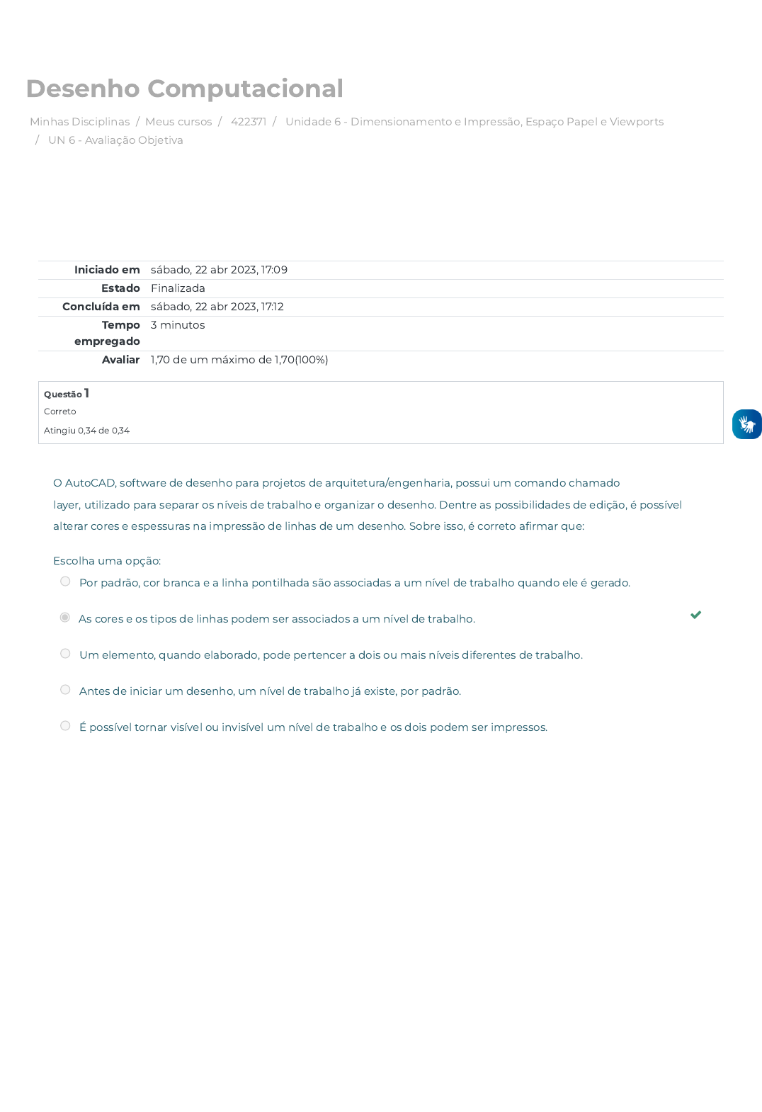 22/04/2023, 17:12 UN 6 - Avaliação Objetiva: Revisão da tentativa https://avap.multivix.edu.br/mod/quiz/review.php?attempt=2784373&cmid=1311726 1/4 Minhas Disciplinas / Meus cursos / 422371 / Unidade 6 - Dimensionamento e Impressão, Espaço Papel e Viewports / UN 6 - Avaliação Objetiva Desenho Computacional Iniciado em sábado, 22 abr 2023, 17:09 Estado Finalizada Concluída em sábado, 22 abr 2023, 17:12 Tempo empregado 3 minutos Avaliar 1,70 de um máximo de 1,70(100%) Questão 1 Correto Atingiu 0,34 de 0,34 O AutoCAD, software de desenho para projetos de arquitetura/engenharia, possui um comando chamado layer, utilizado para separar os níveis de trabalho e organizar o desenho. Dentre as possibilidades de edição, é possível alterar cores e espessuras na impressão de linhas de um desenho. Sobre isso, é correto a�rmar que: Escolha uma opção: Por padrão, cor branca e a linha pontilhada são associadas a um nível de trabalho quando ele é gerado. As cores e os tipos de linhas podem ser associados a um nível de trabalho. Um elemento, quando elaborado, pode pertencer a dois ou mais níveis diferentes de trabalho. Antes de iniciar um desenho, um nível de trabalho já existe, por padrão. É possível tornar visível ou invisível um nível de trabalho e os dois podem ser impressos. https://avap.multivix.edu.br/my/ https://avap.multivix.edu.br/course/view.php?id=20330 https://avap.multivix.edu.br/course/view.php?id=20330§ion=7 https://avap.multivix.edu.br/mod/quiz/view.php?id=1311726 22/04/2023, 17:12 UN 6 - Avaliação Objetiva: Revisão da tentativa https://avap.multivix.edu.br/mod/quiz/review.php?attempt=2784373&cmid=1311726 2/4 Questão 2 Correto Atingiu 0,34 de 0,34 Questão 3 Correto Atingiu 0,34 de 0,34 O AutoCAD oferece duas opções de área de trabalho, a Model Space e a Paper Space. Na Model Space, as entidades geométricas são criadas e na Paper Space é possível criar o layout dos desenhos para impressão. Sobre o Paper Space, é possível imprimir o mesmo projeto, na mesma folha, em duas viewports com: Camadas diferentes desde que estejam congeladas. Escalas distintas. Tipo de linhas, espessuras e cores distintas. Agora, assinale a alternativa que apresenta apenas a(s) a�rmativa(s) correta(s). Escolha uma opção: I, II e III. I e II, apenas. I e III, apenas. III, apenas. I, apenas. A escala possibilita ajustar o desenho elaborado no AutoCAD para um tamanho que se possa imprimir, sem que se modi�que as medidas do desenho. Em um certo projeto, foi determinada a altura 1.0 para todos os textos desse desenho. Em uma viewport, no paper space, esse desenho foi representado na escala 1/100. Se houvesse a necessidade de representar esse mesmo desenho, na mesma prancha, com a manutenção da proporção entre os elementos do desenho na escala 1/50, é correto a�rmar que a altura dos textos: Escolha uma opção: Seria modi�cada para 2.0 no paper space. Seria modi�cada para 2.5 no paper space. Permaneceria a mesma. Seria modi�cada para 0.5 no model space. Seria modi�cada para 2.5 no model space. 22/04/2023, 17:12 UN 6 - Avaliação Objetiva: Revisão da tentativa https://avap.multivix.edu.br/mod/quiz/review.php?attempt=2784373&cmid=1311726 3/4 Questão 4 Correto Atingiu 0,34 de 0,34 Viewports são janelas que permitem a visualização dos projetos feitos no Model Space. Funcionam como uma fotogra�a, com moldura do desenho no espaço. Eles são apresentados com escalas e orientações especí�cas. Em relação ao exposto, analise as seguintes a�rmações: I – Em uma viewport é possível modi�car as propriedades de um desenho sem que sua escala seja alterada. II – Em uma viewport é possível desenhar portas. III – Em uma viewport é possível editar uma escala de uma parte do desenho, sem modi�car as outras escalas. IV - Em uma viewport é possível abrir um novo desenho. Agora, assinale a alternativa correta. Escolha uma opção: Somente as a�rmativas I, II e IV estão corretas. Somente as a�rmativas I, II e III estão corretas. Somente as a�rmativas I e IV estão corretas. Somente as a�rmativas II e IV estão corretas. Somente a a�rmativa III está correta. 22/04/2023, 17:12 UN 6 - Avaliação Objetiva: Revisão da tentativa https://avap.multivix.edu.br/mod/quiz/review.php?attempt=2784373&cmid=1311726 4/4 Questão 5 Correto Atingiu 0,34 de 0,34 Plotagem é a impressão de um desenho elaborado no AutoCAD. Ela pode ser solicitada desde a aba Model ou da área Paper Space. Em relação ao exposto, analise as seguintes a�rmações sobre uma impressão a partir do Paper Space: I – Quando se modi�ca um Layout 1 genérico, na janela Page Setup, a opção Extents possibilita que todo o conteúdo desenhado no Paper Space seja incluído na impressão. II – Não é possível modi�car as margens de impressão que, por padrão, são de�nidas pelo AutoCAD, ao selecionar um tipo de folha para a plotagem do projeto. III – Viewports são janelas de visualização inseridas no Paper Space, de modo retangular, com o objetivo de diagramar os desenhos feitos no Model. IV – A Plot style table gera arquivos de extensão .ctb e tem a �nalidade de associar as cores da tela com as cores e espessuras na impressão, sem que estejam associadas ao desenho necessariamente. Agora, assinale a alternativa correta. Escolha uma opção: Somente as a�rmativas I, II e III estão corretas. Somente as a�rmativas II e IV estão corretas. Somente a a�rmativas III está correta. Somente as a�rmativas I, II e IV estão corretas. Somente as a�rmativas I e IV estão corretas. ◄ Conteúdo online Seguir para... Exercícios de Fixação ► https://avap.multivix.edu.br/mod/scorm/view.php?id=1311725&forceview=1 https://avap.multivix.edu.br/mod/quiz/view.php?id=1311727&forceview=1