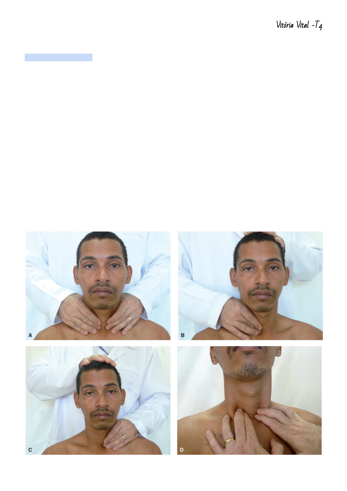 Vitória Vital -T4 OSCE - Exame Físico do Pescoço Exame Físico - Tireóide O exame físico da tireoide tem como base a inspeção, a palpação e a ausculta. Por meio da inspeção e da palpação, podem-se definir a forma e o tamanho da glândula. Se houver aumento, deve-se esclarecer se é global ou localizado. Para a palpação da tireoide, usam-se três manobras: ➔ Paciente sentado e o examinador de pé atrás dele. As mãos e os dedos rodeiam o pescoço, com os polegares fixos na nuca e as pontas dos indicadores e médios quase a se tocarem na linha mediana. O lobo direito é palpado pelos dedos da mão esquerda, enquanto os dedos da outra mão afastam o esternocleidomatóideo. Para o lobo esquerdo, as coisas se invertem ➔ Paciente sentado ou de pé e o examinador sentado ou de pé, postado à sua frente. São os polegares que palpam a glândula, enquanto os outros dedos apoiam-se nas regiões supraclaviculares ➔ Paciente e examinador nas mesmas posições da abordagem anterior, fazendo-se a palpação com uma das mãos, que percorre toda a área correspondente à tireoide. A flexão do pescoço, ou a rotação discreta do pescoço para um lado ou para o outro, provoca relaxamento do músculo esternocleidomastóideo, facilitando a palpação da tireoide Vitória Vital -T4 Ao inspecionar e palpar a tireoide, solicita-se ao paciente que realize deglutições “em seco”, o que permite caracterizar melhor o contorno e os limites da tireoide, a qual se eleva durante o ato de deglutir. Movimente os dedos em vários sentidos, procurando definir a forma e os limites da tireoide. Por meio da palpação, determinam-se o volume ou as dimensões da glândula, seus limites, a consistência e as características da sua superfície (temperatura da pele, presença de frêmito e sopro). Além disso, é importante dar atenção especial à hipersensibilidade, à consistência e à presença de nódulos. Vitória Vital -T4 Exame Físico - Linfonodos O exame dos linfonodos se faz por meio da inspeção e da palpação, um método completando o outro. O lado contralateral deve ser sempre comparado. A palpação é realizada com as polpas digitais e a face ventral dos dedos médio, indicador e polegar; no caso da extremidade cervical, ajusta-se a cabeça em uma posição que relaxe os músculos do pescoço, inclinando levemente a cabeça para o lado que se deseja examinar. Os linfonodos cervicais são mais facilmente palpáveis com o examinador posicionado atrás do paciente. Os linfonodos da cadeia jugular são mais bem examinados apreendendo-se o músculo esternocleidomastóideo entre o polegar e os dedos indicador e médio de uma das mãos. Vitória Vital -T4