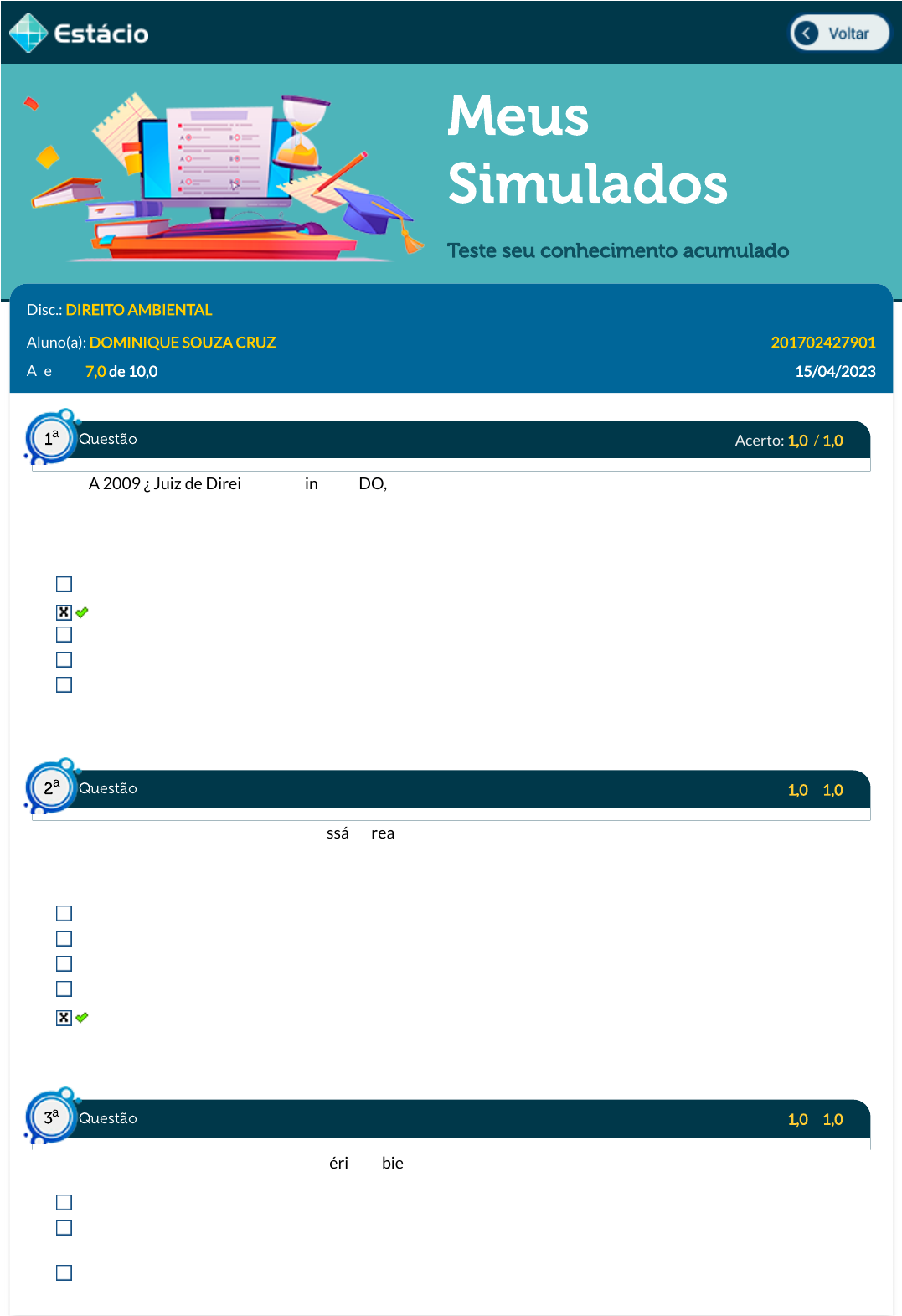 30/04/2023, 19:56 Estácio: Alunos https://simulado.estacio.br/bdq_simulados_avaliacao_parcial_resultado.asp?cod_hist_prova=306210566&cod_prova=6182498262&f_cod_disc=… 1/4 Meus Simulados Teste seu conhecimento acumulado Disc.: DIREITO AMBIENTAL Aluno(a): DOMINIQUE SOUZA CRUZ 201702427901 Acertos: 7,0 de 10,0 15/04/2023 Acerto: 1,0 / 1,0 (TJ PA 2009 ¿ Juiz de Direito ¿ FGV in AMADO, Frederico. Direito Ambiental esquematizado. São Paulo: Gen, 2015, p. 12) A Constituição Federal/88 assevera que `todos têm direito ao meio ambiente ecologicamente equilibrado, bem de uso comum do povo e essencial à sadia qualidade de vida¿. A esse respeito, é correto inferir que a concepção constitucional sobre o meio ambiente é: Pragmática. Antropocêntrica. Holística. Panteísta. Criacionista. Respondido em 30/04/2023 19:07:30 Acerto: 1,0 / 1,0 Conforme previsto na CF/1988 é necessária realização de estudo prévio de impacto ambiental antes da implantação de empreendimentos e de atividades consideradas efetiva ou potencialmente causadoras de degradação ambiental, que constitui exigência que atende ao princípio do (a): participação comunitária. poluidor-pagador. proibição do retrocesso ambiental. usuário-pagador. prevenção. Respondido em 30/04/2023 19:09:24 Acerto: 1,0 / 1,0 A Competência Constitucional em matéria ambiental se divide em: Imaterial e material, também denominada administrativa. Não há divisão uma vez que apenas existe em sede de Direito Ambeintal a competência constitucional administrativa, também conhecida como executiva ou material. Não há divisão da competência constitucional em matéria ambiental, uma vez que só existe a competência legislativa. Questão1 a Questão2 a Questão3 a https://simulado.estacio.br/alunos/inicio.asp javascript:voltar(); 30/04/2023, 19:56 Estácio: Alunos https://simulado.estacio.br/bdq_simulados_avaliacao_parcial_resultado.asp?cod_hist_prova=306210566&cod_prova=6182498262&f_cod_disc=… 2/4 Material, também denominada executiva ou administrativa e legislativa. Competência judicial e legislativa. Respondido em 30/04/2023 19:12:26 Gabarito Comentado Gabarito Comentado Acerto: 1,0 / 1,0 Sob a in�uência da Declaração de Estocolmo sobre o ambiente humano, de 1972, foi publicada, em 31 de agosto de 1981, a Lei nº 6.938, que constitui o grande marco de autonomia do Direito Ambiental no plano jurídico nacional. Marque a alternativa CORRETA sobre a lei 6.938/81: dispõe sobre a Política Nacional do Meio Ambiente Humano, seus �ns e mecanismos de formulação e aplicação, e dá outras providências. dispõe sobre o Planejamento Nacional do Meio Ambiente, seus �ns e mecanismos de formulação e aplicação, e dá outras providências. dispõe sobre a Política Nacional do Meio Ambiente, seus �ns e mecanismos de formulação e aplicação, e dá outras providências. dispõe sobre o Programa Nacional do Meio Ambiente, seus �ns e mecanismos de formulação e aplicação, e dá outras providências. dispõe sobre a Política Nacional do Direito Ambiental, seus �ns e mecanismos de formulação e aplicação, e dá outras providências. Respondido em 30/04/2023 19:18:03 Gabarito Comentado Acerto: 1,0 / 1,0 Com relação ao licenciamento ambiental, assinale a alternativa correta: Impacto ambiental constitui qualquer alteração das propriedades físicas, químicas e biológicas do meio ambiente, causada por qualquer forma de matéria ou energia resultante das atividades humanas que, direta ou indiretamente, afetam a saúde, a segurança e o bem-estar da população; as atividades sociais e econômicas; as condições estéticas e sanitárias do meio ambiente e a qualidade dos recursos ambientais. A Licença de Operação é concedida no início da implantação do empreendimento, de acordo com as especi�cações constantes do Projeto Executivo aprovado; A licença de instalação é concedida na fase preliminar do planejamento da atividade, contendo requisitos básicos a serem atendidos nas fases de localização, instalação e operação, observados os planos municipais, estaduais ou federais de uso do solo. Licenciamento ambiental corresponde ao procedimento judicial destinado a licenciar atividades ou empreendimentos utilizadores de recursos ambientais, efetiva ou potencialmente poluidores ou capazes, sob qualquer forma, de causar degradação ambiental. O Licenciamento ambiental é o ato administrativo complexo, sucessivo e de caráter repressivo. Respondido em 30/04/2023 19:19:33 Acerto: 0,0 / 1,0 Sobre Proteção Legal da Flora nacional, é correto a�rmar: Questão4 a Questão5 a Questão6 a 30/04/2023, 19:56 Estácio: Alunos https://simulado.estacio.br/bdq_simulados_avaliacao_parcial_resultado.asp?cod_hist_prova=306210566&cod_prova=6182498262&f_cod_disc=… 3/4 A Floresta Amazônica brasileira, a Mata Atlântica, a Serra do Mar, o Pantanal Mato-Grossense, a Zona Costeira, Caatinga, o Cerrado e os Pampas (Campos Sulinos), estão todos previstos na pátria Constituição Federal de 1988 como biomas nacionais a serem protegidos e preservados. São considerados biomas brasileiros apenas o Cerrado, a Caatinga e a Mata Atlântica, bens de uso comum do povo, a serem defendidos e preservados, como todos os recursos naturais. A Floresta Amazônica brasileira, a Mata Atlântica, a Serra do Mar, o Pantanal Mato-Grossense e a Zona Costeira não estão protegidos pela nossa Constituição Federal de 1988. Não são considerados biomas brasileiros a Caatinga, o Cerrado, os Pampas (Campos Sulinos). A Floresta Amazônica brasileira, a Mata Atlântica, a Serra do Mar, o Pantanal Mato-Grossense e a Zona Costeira estão especi�camente protegidos pela Constituição Federal de 1988, em seu artigo 225, § 4º. Respondido em 30/04/2023 19:30:58 Gabarito Comentado Acerto: 1,0 / 1,0 Marque a resposta correta sobre o instituto do Tombamento: Por meio do tombamento, o valor cultural do bem é reconhecido e se institui sobre 