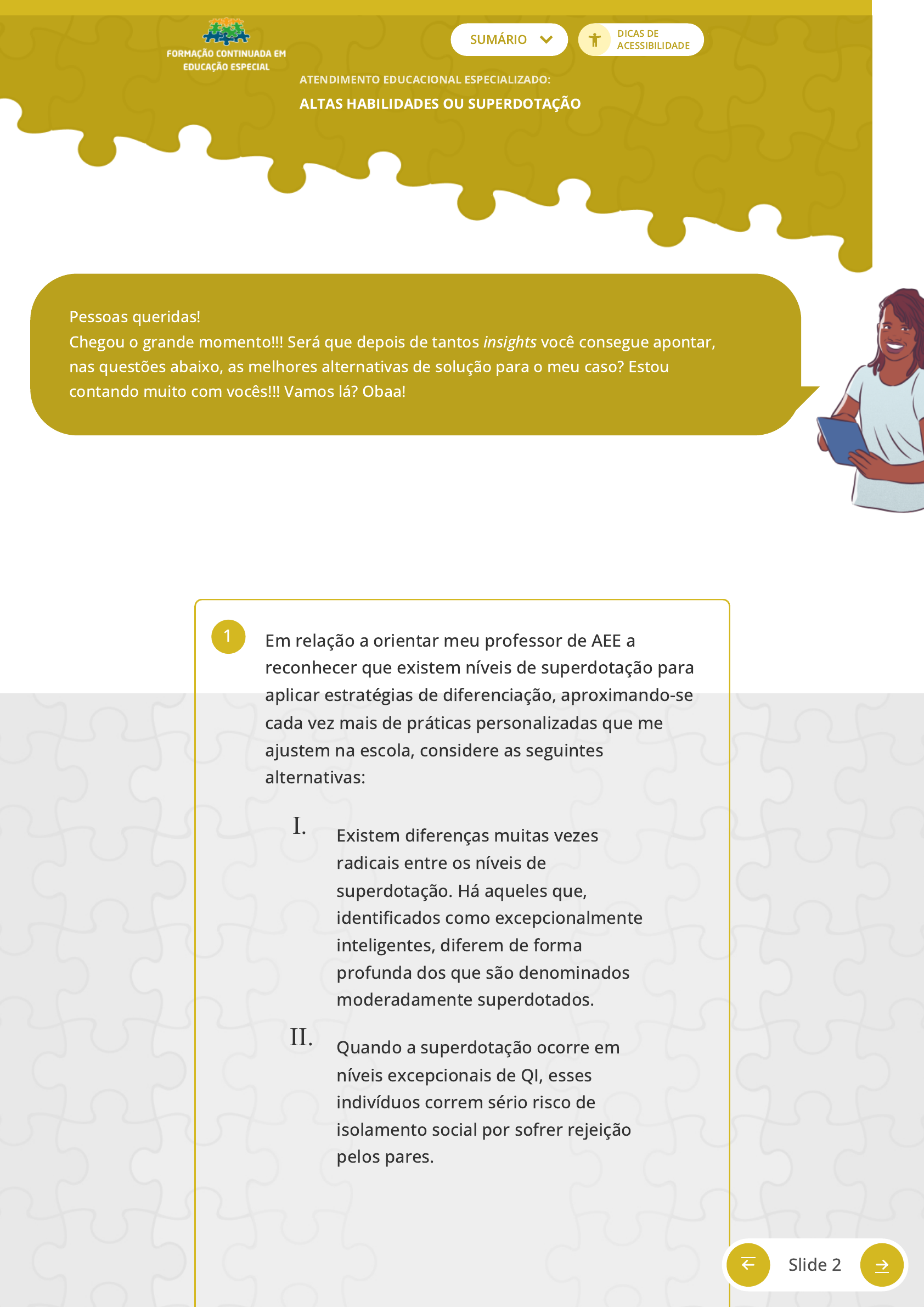 SUMÁRIO ATENDIMENTO EDUCACIONAL ESPECIALIZADO: ALTAS HABILIDADES OU SUPERDOTAÇÃO DICAS DE ACESSIBILIDADE Pessoas queridas! Chegou o grande momento!!! Será que depois de tantos insights você consegue apontar, nas questões abaixo, as melhores alternativas de solução para o meu caso? Estou contando muito com vocês!!! Vamos lá? Obaa! Em relação a orientar meu professor de AEE a reconhecer que existem níveis de superdotação para aplicar estratégias de diferenciação, aproximando-se cada vez mais de práticas personalizadas que me ajustem na escola, considere as seguintes alternativas: 1 Existem diferenças muitas vezes radicais entre os níveis de superdotação. Há aqueles que, identi�cados como excepcionalmente inteligentes, diferem de forma profunda dos que são denominados moderadamente superdotados. I. Quando a superdotação ocorre em níveis excepcionais de QI, esses indivíduos correm sério risco de isolamento social por sofrer rejeição pelos pares. II. Slide 2 https://avamec.mec.gov.br/ava-mec-ws/instituicao/semesp/conteudo/modulo/4609/mod7/slide03.html https://avamec.mec.gov.br/ava-mec-ws/instituicao/semesp/conteudo/modulo/4609/mod7/slide01.html Assim como outras condições, pessoas identi�cadas com superdotação, também apresentam diferentes níveis, distinguindo-se entre as formas mais brandas, as moderadas e as mais intensas III. Essa diferença se aplica a aspectos variados, incluindo desde o desenvolvimento cognitivo até o afetivo, o social. IV. Apenas as a�rmativas I e II estão corretas.a Apenas a�rmativas I e III estão corretas.b Apenas as a�rmativas II e III estão corretas.c As a�rmativas I, II, III e IV estão corretas. d O enriquecimento curricular pode ser subdividido em duas partes: enriquecimento intracurricular e o enriquecimento extracurricular, através de articulações realizadas com outras áreas dos conhecimentos e/ou instituições (universidades, organizações não governamentais, institutos etc.). Diante dessa a�rmação, assinale (V) para as estratégias mais adequadas à solução do problema e (F) para aquelas que não se aplicam enquanto estratégias adequadas. 2 O enriquecimento intracurricular, já que trata do desenvolvimento de estratégias no ambiente escolar, utilizando-se de recursos que a escolas dispõe, e, assim, a escola teria condições de aplicar estratégias que me ajudassem a não achar tudo tão repetitivo. a F V Slide 2 https://avamec.mec.gov.br/ava-mec-ws/instituicao/semesp/conteudo/modulo/4609/mod7/slide03.html https://avamec.mec.gov.br/ava-mec-ws/instituicao/semesp/conteudo/modulo/4609/mod7/slide01.html O enriquecimento intracurricular não cabe ao meu caso, porque a escola não tem condições de ampliar o currículo nem alterar para atender a um caso isolado na minha sala de aula. b F V O enriquecimento extracurricular, já que orienta a ampliar as experiências de aprendizagem em outros ambientes fora do contexto escolar, e, assim, a escola poderia orientar meus pais a me matricular em atividades que atendessem ao meu interesse e necessidade de aprofundamento. c F V O enriquecimento extracurricular não se aplica, porque dependeria de condições da minha família para que eu frequentasse atividades fora da minha escola e meus pais não têm tempo para isso. d F V Diante do conceito de atividades do Tipo I, Tipo II e Tipo III, em qual delas você entende que devo iniciar na sala de AEE para altas habilidades? 3 Atividades do Tipo I (experiências e atividades exploratórias com o objetivo de propiciar o contato com vários temas ou áreas do conhecimento e permitir a vivência de investigação e aprofundamento sobre determinado tema). a Atividades do Tipo II (utilizam métodos e técnicas que serão utilizados nas investigações de problemas reais, as quais contribuirão para o desenvolvimento de níveis superiores de pensamento). b Atividades do Tipo III (investiga problemas reais e desenvolvem habilidades sociais de interação com c Slide 2 https://avamec.mec.gov.br/ava-mec-ws/instituicao/semesp/conteudo/modulo/4609/mod7/slide03.html https://avamec.mec.gov.br/ava-mec-ws/instituicao/semesp/conteudo/modulo/4609/mod7/slide01.html especialistas, professores, colegas e trazem como resultado a produção de um novo conhecimento, a solução de problemas ou a apresentação de um novo produto). A estratégia das alternativas “b” e “c” é a mais compatível com o meu nível de expectativa atual. d Estratégias individualizadas não servem só às de�ciências, mas também aos casos de superdotação, sendo fundamental para orientar as estratégias de adequação curricular. Qual a estratégia, trabalhada no curso, que a lei exige que a escola realize para ajudar-me a desenvolver meu potencial?: 4 O PEI, porque orienta o professor a elaborar as estratégias mais adequadas, de forma estruturada, seguindo o seu objetivo principal que é individualizar os processos de aprendizagem. a Basta ao professor aplicar atividades de enriquecimento curricular sem a necessidade de sistematizar. b Não é necessário nenhum plano especial; basta que o professor aprofunde as mesmas atividades que passa para os seus alunos. c A mais adequada são os jogos e o uso de recursos tecnológicos para o meu nível de aprendizagem. d Você aprendeu que os alunos que são capazes de alcançar pontuações excepcionais em testes 5 Slide 2 https://avamec.mec.gov.br/ava-mec-ws/instituicao/semesp/conteudo/modulo/4609/mod7/slide03.html https://avamec.mec.gov.br/ava-mec-ws/instituicao/semesp/conteudo/modulo/4609/mod7/slide01.html padronizados, incluindo testes de QI, provavelmente têm superdotação do tipo acadêmico. Estudando as características do tipo acadêmico e do tipo criativo- produtivo, marque a alternativa que mais se identi�ca com o meu per�l (Sol): É o tipo criativo-produtivo, porque a Sol não gosta de produzir nada concreto, apenas de realizar leituras que lhe interessam. a É do tipo acadêmico