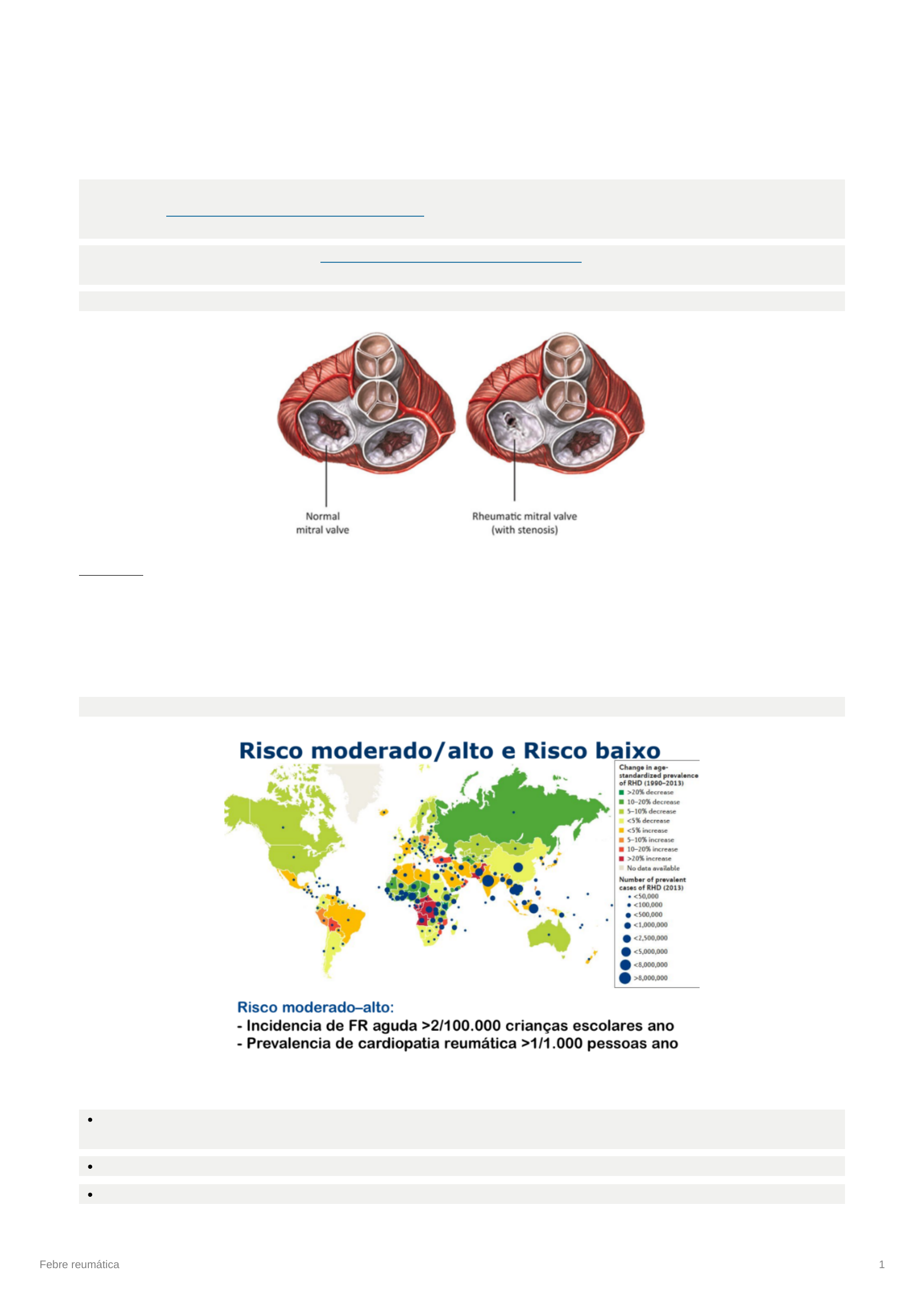 Febre reumática 1 Febre reumática Introdução A febre reumática (FR) e a cardiopatia reumática crônica (CRC) são complicações não supurativas da faringoamigdalite causada pelo estreptococo beta-hemolítico do grupo A e decorrem de resposta imune tardia a esta infecção em populações geneticamente predispostas. Componente genético + infecção pelo estreptococo beta-hemolítico do grupo A. Mau tto promove FR (deve ser atb 10 dias). Pode acometer articulações, coração e SNC. EPIDEMIO: Essa é uma doença que está frequentemente associada à pobreza e às más condições de vida. Houve redução da incidência da FR nas últimas décadas nos países desenvolvidos, com consequente redução na prevalência da CRC. FR permanece como um grande problema de saúde pública, principalmente nos países em desenvolvimento. Cardite reumática – 300.000 novos/ano. Brasil (MS, 2004) - subdiagnosticado. Amigdalites - 10 milhões/ano. FR - 30.000/ano. Cardiotiopatia reumática – 1-7/1.000. (EUA –CR 0,1-0,4/1000) O risco de desenvolvimento de FR varia de país para país e deve ser levado em consideração: Fatores de risco Maior prevalência entre 5-15 anos. Cardiopatia reumática: entre 25-45 anos. Acomete igualmente os sexos - cardite: F:M=2:1. Fatores ambientais relacionados à pobreza → aglomeração familiar, favelas, acesso precário a cuidados de saúde. Susceptibilidade genética (3-6% da população) → HLA classe II, alelo DR7 Febre reumática 2 Agente etiológico Estreptococo β-hemolítico do grupo A Lancefield (Steptococcus Pyogenes). Proteína M é o principal antígeno relacionado a patogenia da doença (presente na parede celular do estrepto e no miocárdio = reação cruzada). Mimetismo molecular entre EGA e hospedeiro - resposta imune cruzada EGA se adere e invade o epitélio da faringe, onde será atacado pelo sistema imune e onde seus antígenos serão processados e apresentando às células B e T. Pela similaridade de antígenos com nossas proteínas, haverá formação de células B e T cross-reactive, que, via anticorpos e inflamação, causarão danos aos tecidos próprios (cardite, coreia - SNC, artrite - articulações, nódulos subcutâneos e eritema marginado - pele). Patogênese da cardite Anticorpos fazem reação cruzada com endotélio valvas, aumentando a expressão de VCAM1 e levando à infiltração de células T (CD4). Com isso, há resposta inflamatória TH1 e produção de TNF e INF-gama, causando lesão valvar. Com as lesões valvares, são formados nódulos de Aschoff ou lesões granulomatosas. Febre reumática 3 Os danos valvares serão reconstruídos e remodelados, a fim de conter o dano, porém pode ocorrer mau remodelamento, com possibilidade de regurgitação ou estenose mitral. Manifestações clínicas Cardite reumática 40-70% - 1° surto. Precoce. DIVIDIDA EM: Endocardite → 100%; mitral > aórtica > tricúspide > pulmonar Miocardite → mais rara Pericardite → mais rara CATEGORIAS → subclínica, leve, moderada, grave DURAÇÃO → até 6 sem EVOLUÇÃO → cura, estacionária ou progressão Febre reumática 4 Artrite da FR A deposição de imunocomplexos (formados pelos anticorpos de reação cruzada) se depositam em articulações e promovem inflamação = artrite. Artrite típica da FR Frequência → 53 a 64% INÍCIO → 2-3 semanas após infecção orofaringe CARACTERÍSTICAS → poliartrite aguda, migratória, assimétrica grandes articulações (joelhos, tornozelos, cotovelos e punhos), dor importante. DURAÇÃO → 2-5 dias em cada articulação (total = 1-3 semanas) EVOLUÇÃO → ótima resposta a AINH, sem sequelas Artrite atípica da FR Frequência → 36 a 47% CARACTERÍSTICAS (43/92-47%): Auditiva Local (pequenas articulações, coluna cervical e coxo- femural) (74%) Monoartrite (3%). DURAÇÃO → 3 sem (61%). Má resposta ao AAS (42%). Coreia Inflamação dos núcleos da base - depoisção de Ac. Anticorpos contra carboidrato N-acetil beta-D-glicosamina reagem contra receptores dopaminérgicos e lisogangliosídeos, localizados na superfície de células neuronais, promovendo maior produção de dopamina nos núcleos da base e inflamação = coreia. Febre reumática 5 Coréia de Sydenham Frequência → 4-45% (sexo feminino) Forte associação com cardite (endocardite). INÍCIO → até 6 meses após infecção orofaringe CARACTERÍSTICAS → movimentos involuntários, incoordenados, cessam com o sono, associados a hipotonia , labilidade emocional, alteração da escrita, tiques, disartria, disfagia, alteração da marcha DURAÇÃO → semanas até 6 meses (média 3 meses) , mas pode durar até 2 anos EX. LAB. → PFA (provas de fase aguda) normais, Anti-estreptolisina O (ASLO) normal Nódulos subcutâneos e eritema marginatum da FR Reação cruzada de anticorpos carboidrato-específico do grupo A com a queratina e formação de nódulos subcutâneos, com lesões granumolatosas semelhantes aos corpos de Aschoff. Frequência → 2-10% TARDIO → 1-2 sem após outras manifestações CARACTERÍSTICAS → duros, indolores, número variável, 0,5-2cm, proeminências ósseas (superfícies extensoras de articulações, proeminências ósseas em região occipital ecoluan DURAÇÃO → alguns dias até 1 mês Febre reumática 6 EVOLUÇÃO → fugazes, associados a cardite Eritema marginaod da FR Frequência → 1-3% CARACTERÍSTICAS → máculas róseas evanescente com bordas serpiginosas e centro claro, indolores, não pruriginosas, em tronco e raiz de membros. EVOLUÇÃO → fugaz, recidivante e associa-se com cardite Exames complementares Hemograma → anemia, leucocitose Provas de fase aguda → 1 a 3m; ↑VHS, ↑PCR, ↑α-1 glicoproteína ácida e ↑α2 e γ-globulina na EFP RX TÓRAX → seguimento da área cardíaca ECG → ↑ intervalo PR ECO → comprometimento valvular, função miocárdica, pericardite - mostra alterações específicas EVIDÊNCIA DE ESTREPTOCOCCIA NA FR: Como há alteração com as se