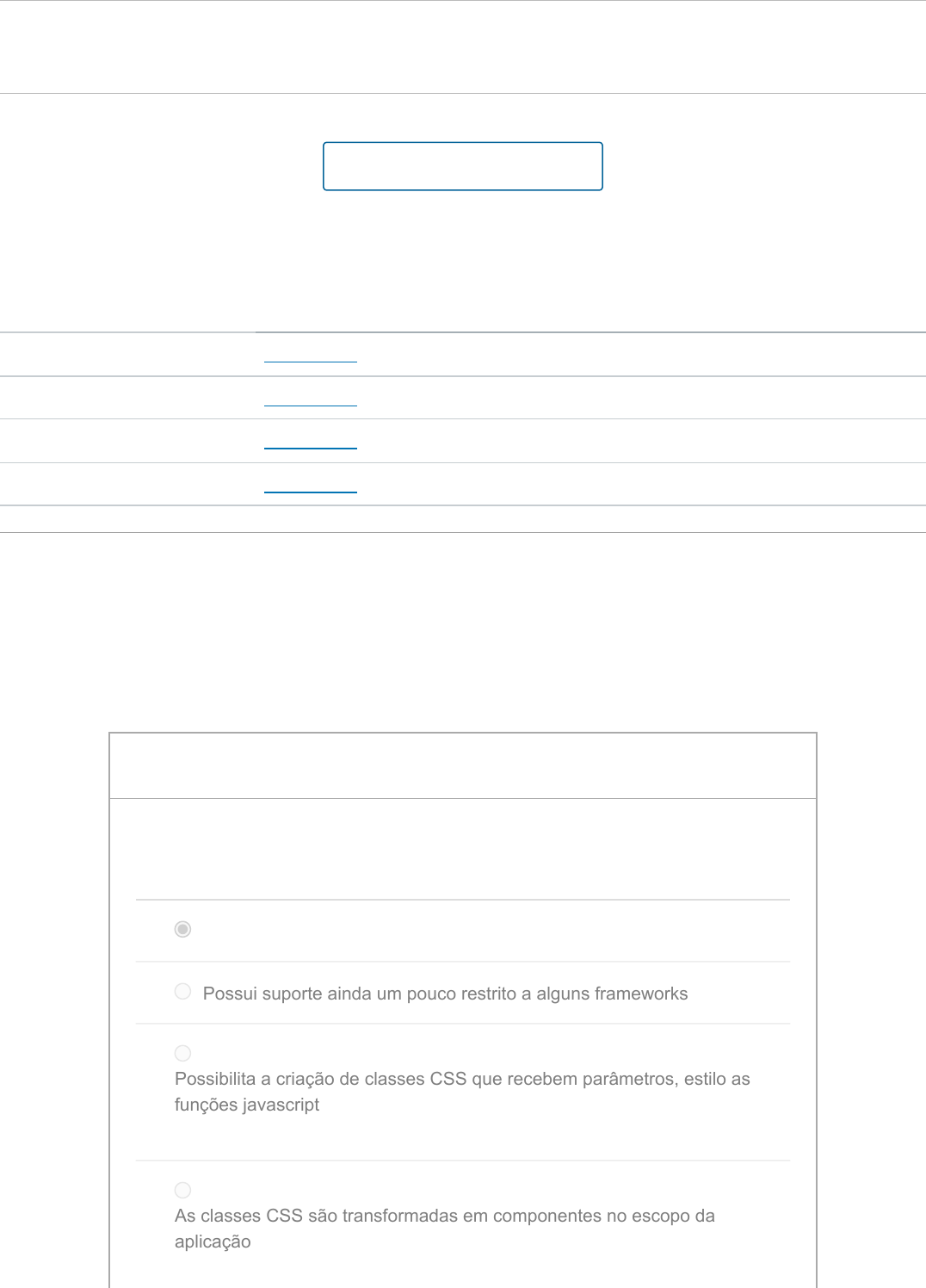 01/05/2023, 12:48 Atividade Objetiva 02: 03 - Arquitetura de Front End (2023) https://pucminas.instructure.com/courses/145908/quizzes/382240 1/3 Atividade Objetiva 02 Entrega Sem prazo Pontos 15 Perguntas 5 Limite de tempo Nenhum Tentativas permitidas Sem limite Histórico de tentativas Tentativa Tempo Pontuação MANTIDO Tentativa 3 Menos de 1 minuto 15 de 15 MAIS RECENTE Tentativa 3 Menos de 1 minuto 15 de 15 Tentativa 2 4 minutos 12 de 15 Tentativa 1 4 minutos 12 de 15 As respostas corretas estão ocultas. Pontuação desta tentativa: 15 de 15 Enviado 1 mai em 12:52 Esta tentativa levou Menos de 1 minuto. Fazer o teste novamente 3 / 3 ptsPergunta 1 Sobre o CSS-in-JS é INCORRETO afirmar que: Possui suporte a qualquer framework Possui suporte ainda um pouco restrito a alguns frameworks Possibilita a criação de classes CSS que recebem parâmetros, estilo as funções javascript As classes CSS são transformadas em componentes no escopo da aplicação https://pucminas.instructure.com/courses/145908/quizzes/382240/history?version=3 https://pucminas.instructure.com/courses/145908/quizzes/382240/history?version=3 https://pucminas.instructure.com/courses/145908/quizzes/382240/history?version=2 https://pucminas.instructure.com/courses/145908/quizzes/382240/history?version=1 https://pucminas.instructure.com/courses/145908/quizzes/382240/take?user_id=239246 01/05/2023, 12:48 Atividade Objetiva 02: 03 - Arquitetura de Front End (2023) https://pucminas.instructure.com/courses/145908/quizzes/382240 2/3 3 / 3 ptsPergunta 2 O Angular é um framework criado pelo Google para simplificar a construção de aplicações Web. Qual alternativa traz características evidentes na sua estrutura: Aplicações Web de múltiplas páginas com roteamento para simplificar as requisições ao servidor Web Uso do XML na troca de dados entre cliente e servidor. Aplicação do conceito de componentes e templates com uso de injeção de dependências Responsividade do layout e preprocessamento de CSS 3 / 3 ptsPergunta 3 Ferramentas como o Webpack automatizam tarefas no processo de desenvolvimento. As alternativas abaixo fazem referência às tarefas possíveis de se automatizar, EXCETO: Pre-processamento de arquivos CSS Compactação de dados em chamadas AJAX Minificação de scripts Javascript e arquivos CSS Cópia e concatenação de arquivos 01/05/2023, 12:48 Atividade Objetiva 02: 03 - Arquitetura de Front End (2023) https://pucminas.instructure.com/courses/145908/quizzes/382240 3/3 3 / 3 ptsPergunta 4 Sobre a arquitetura flux é correto afirmar que: A aplicação possui múltiplas stores Armazena o estado de toda a aplicação O estado é atualizado por meio dos event receivers Pode ser implementada apenas pelo Redux 3 / 3 ptsPergunta 5 Sobre a style guide BEM, é correto afirmar que: Possui convenção já definida para nomenclatura de classes Possui uma visão distorcida dos estados dos elementos HTML Os nomes das classes, independente do tamanho do projeto/estilização ficam sempre bem pequenos Não possui convenção definida para nomenclatura de classes, deixando flexível para o time de desenvolvimento Pontuação do teste: 15 de 15