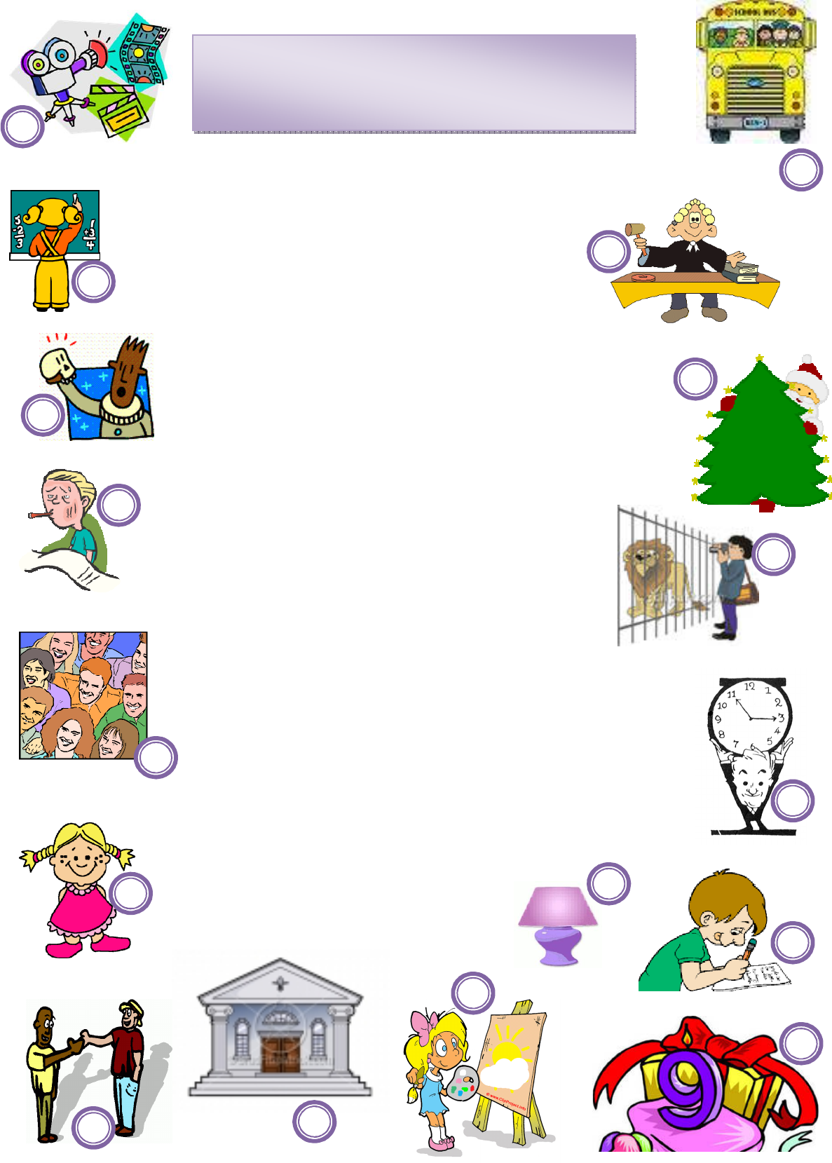 Wh- Questions Fill in the spaces with What, What time, Who, Where, How, How old, How many or When. Then match each sentence to the right picture: 1-___________ is she? She is a girl. 2-___________ is it? It’s five to three. 3-___________ are they? They are in the school bus. 4-___________ is it? It’s a famous museum. 5-___________ is Christmas? It’s on 25th December. 6-___________ is he? He is nine years old. 7-___________ are they? They are best friends. 8-___________ is he? He is a judge. 9-___________ is she? She is at school. 10-__________ is he? He is an actor. 11-__________ are you going? I’m going to the cinema. 12-__________ are you? I’m sick. 13-__________ people are there in the picture? Nine. 14-__________ is he doing? He is writing. 15-__________ is she doing? She is painting. 16-__________ is he? He is at the zoo. 17-__________ is it? It’s a lamp. iSLCollective.com